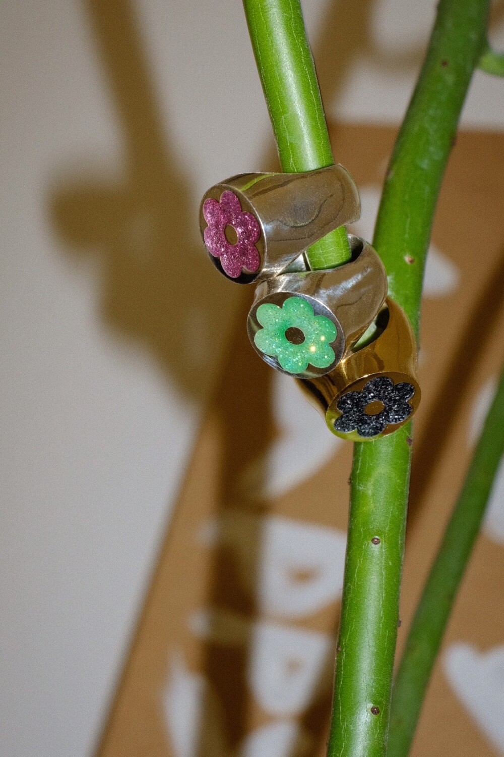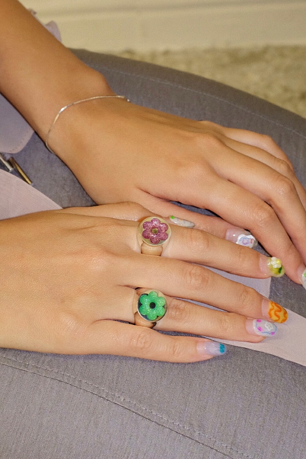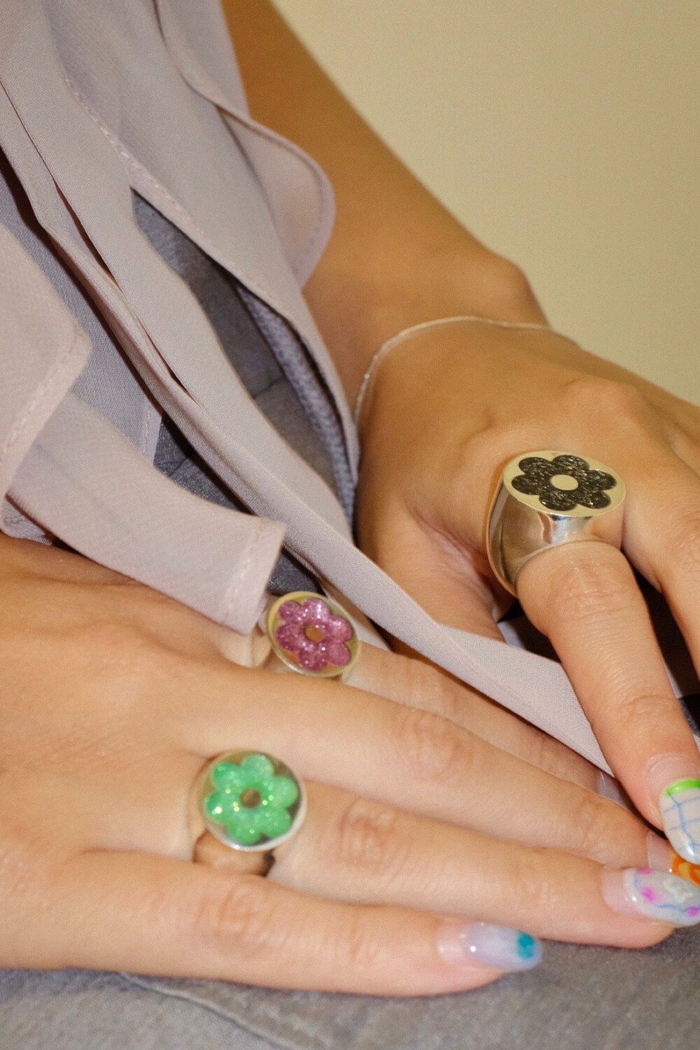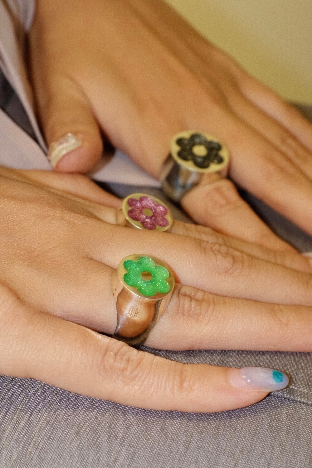 반짝이는 글리터가 가득 차있는 꽃이 포인트인 키치한 무드의 반지입니다 ⯌⯌.