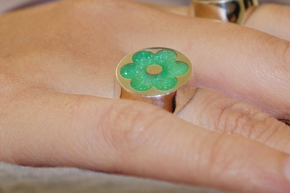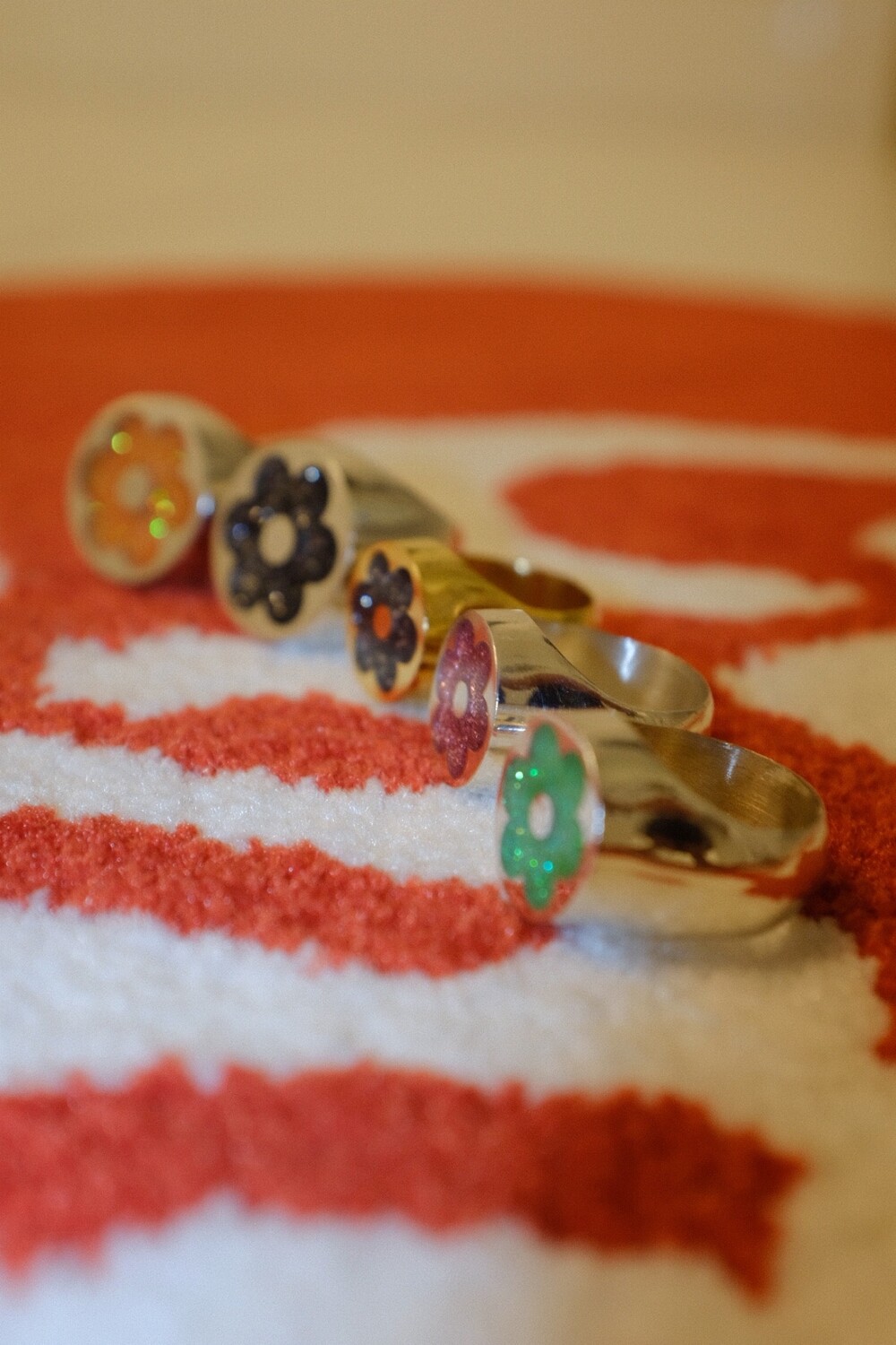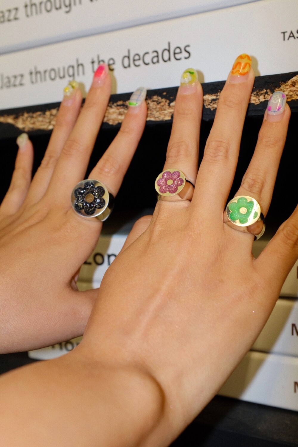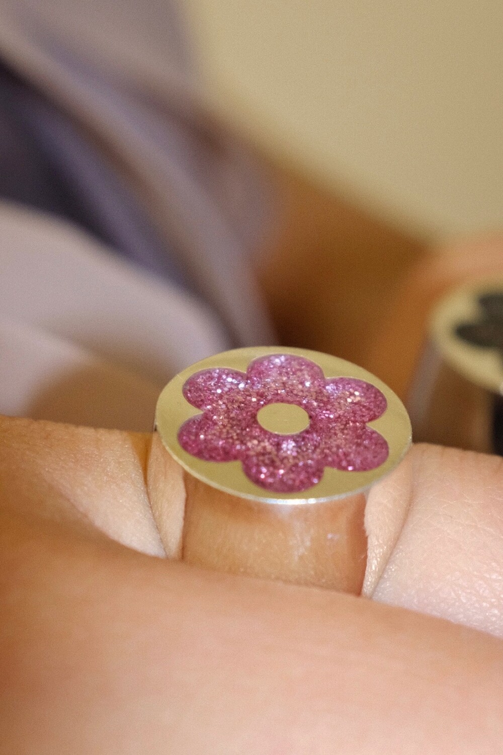 반짝이는 글리터가 가득 차있는 꽃이 포인트인 키치한 무드의 반지입니다 ⯌⯌.