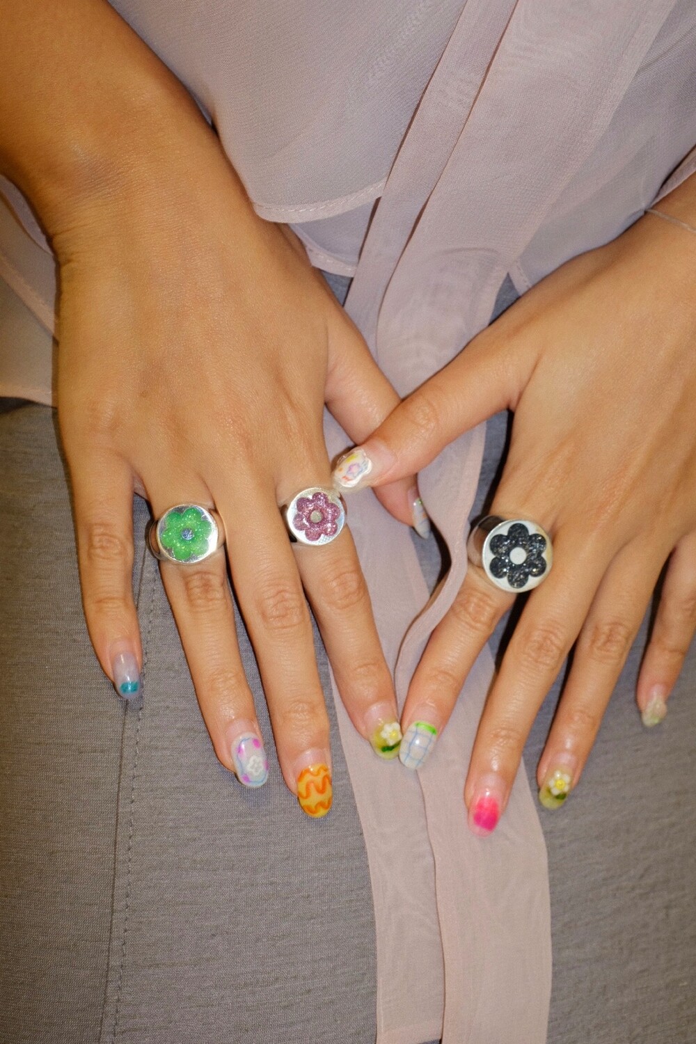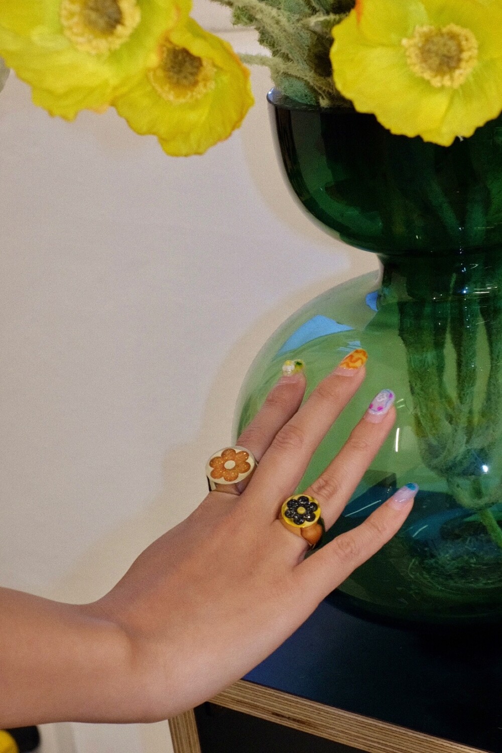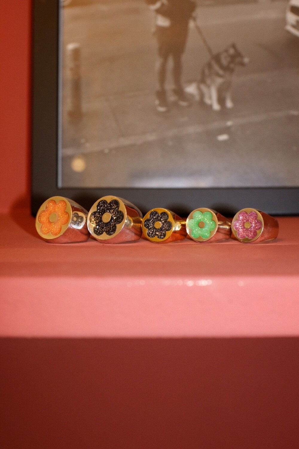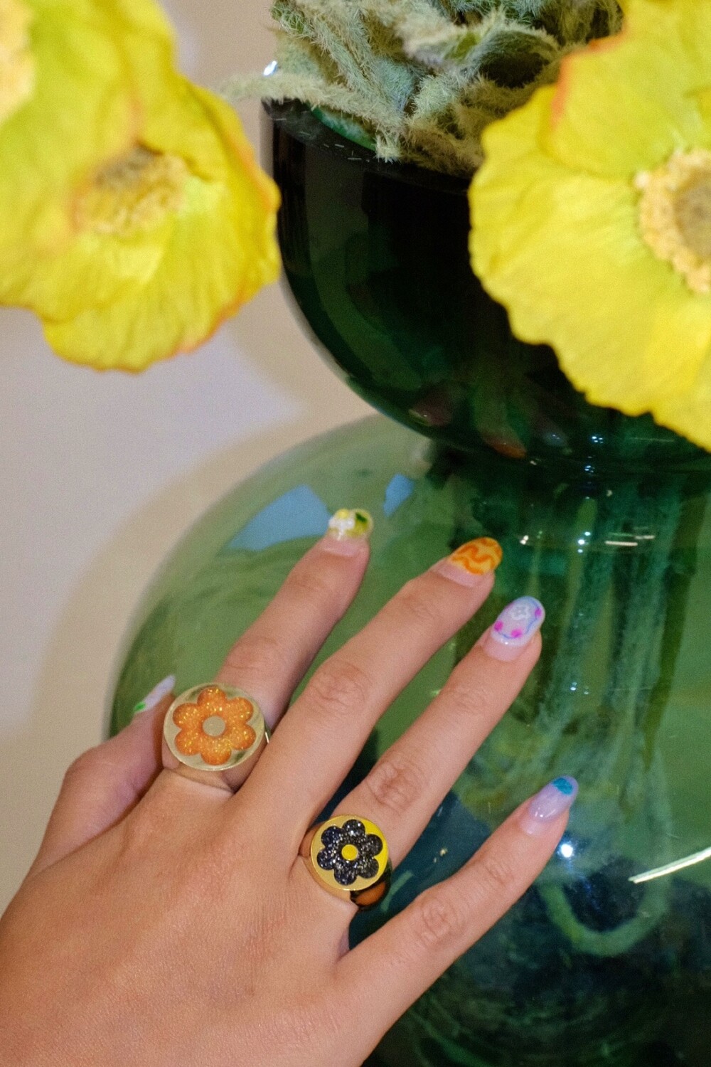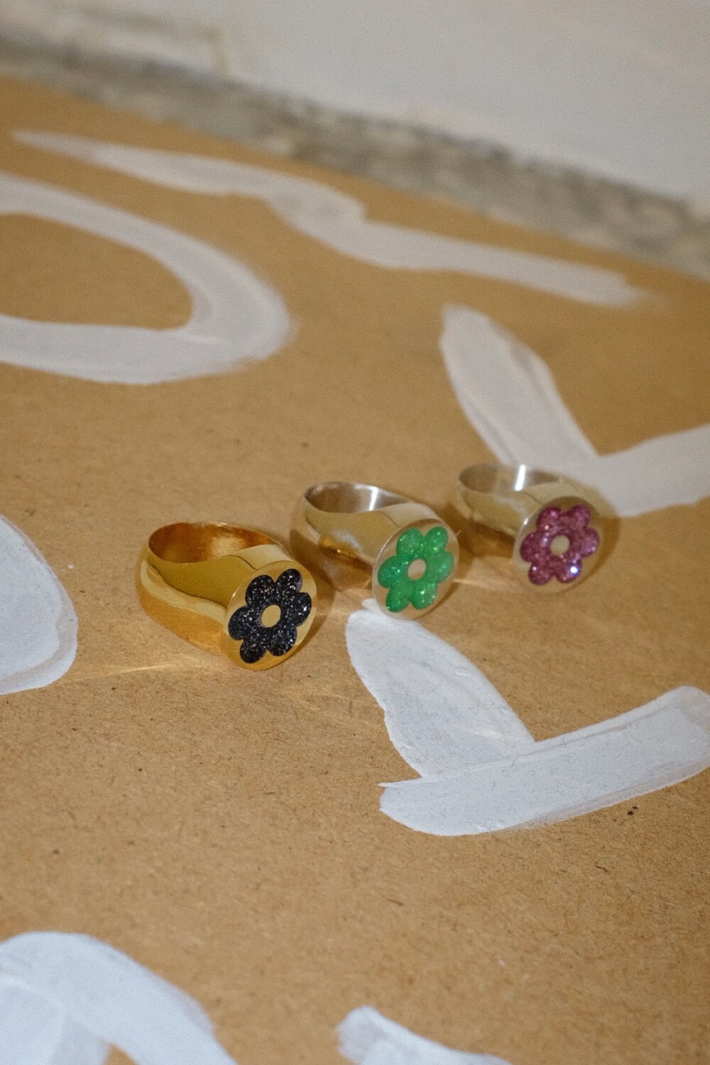 반짝이는 글리터가 가득 차있는 꽃이 포인트인 키치한 무드의 반지입니다 ⯌⯌.
