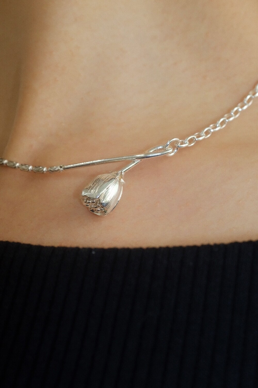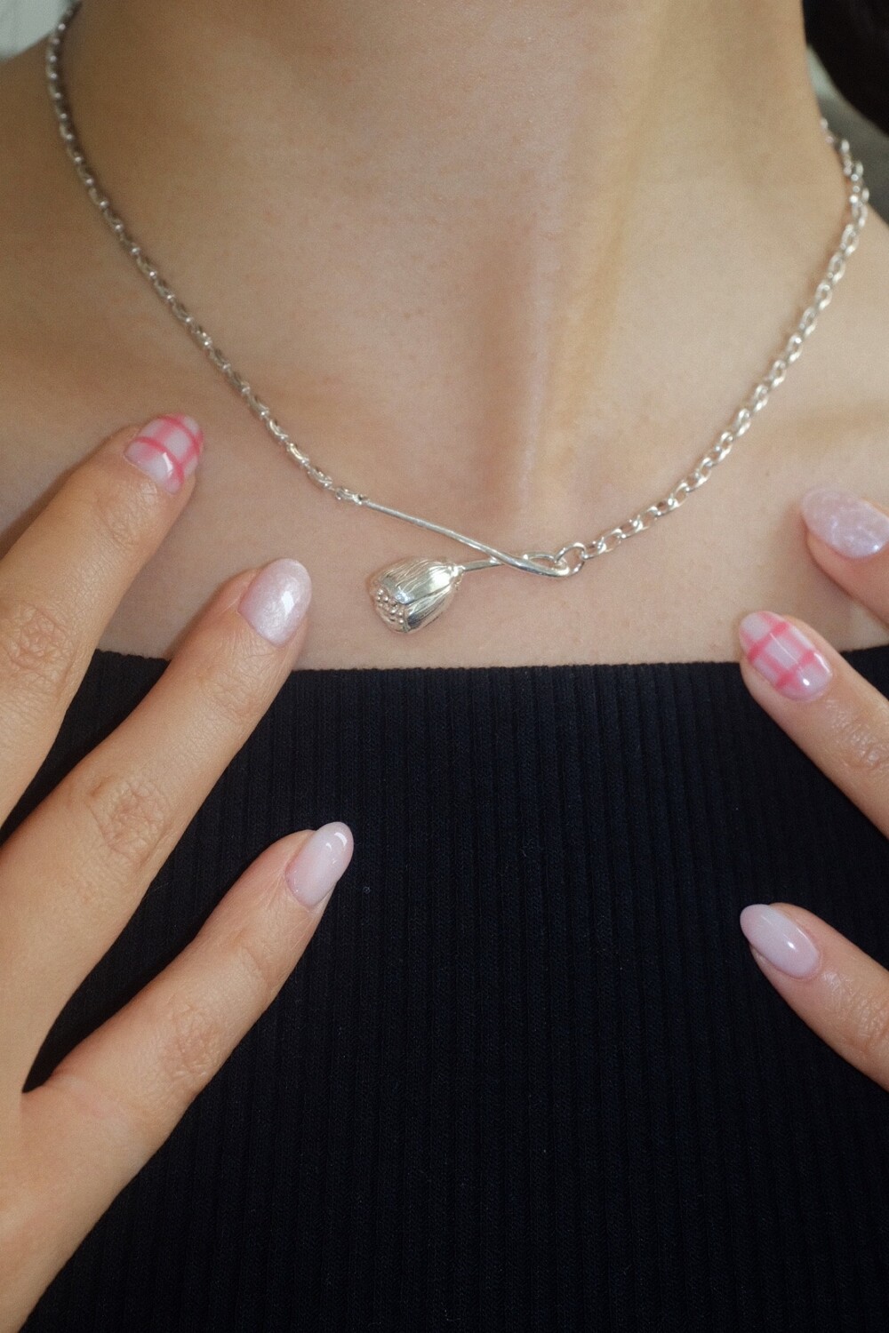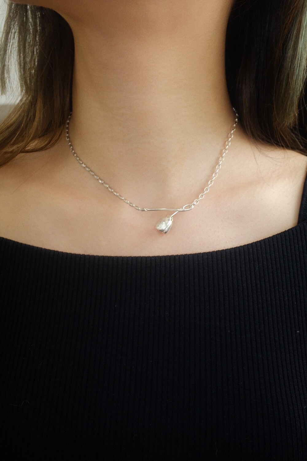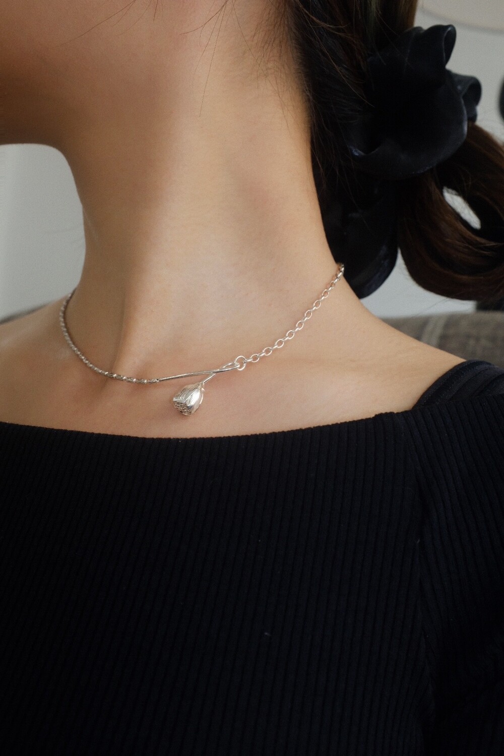 꽃의 위치에 따라 다른 무드로 착용할 수 있으며 연장체인으로 원하시는 길이로 연출 가능합니다.