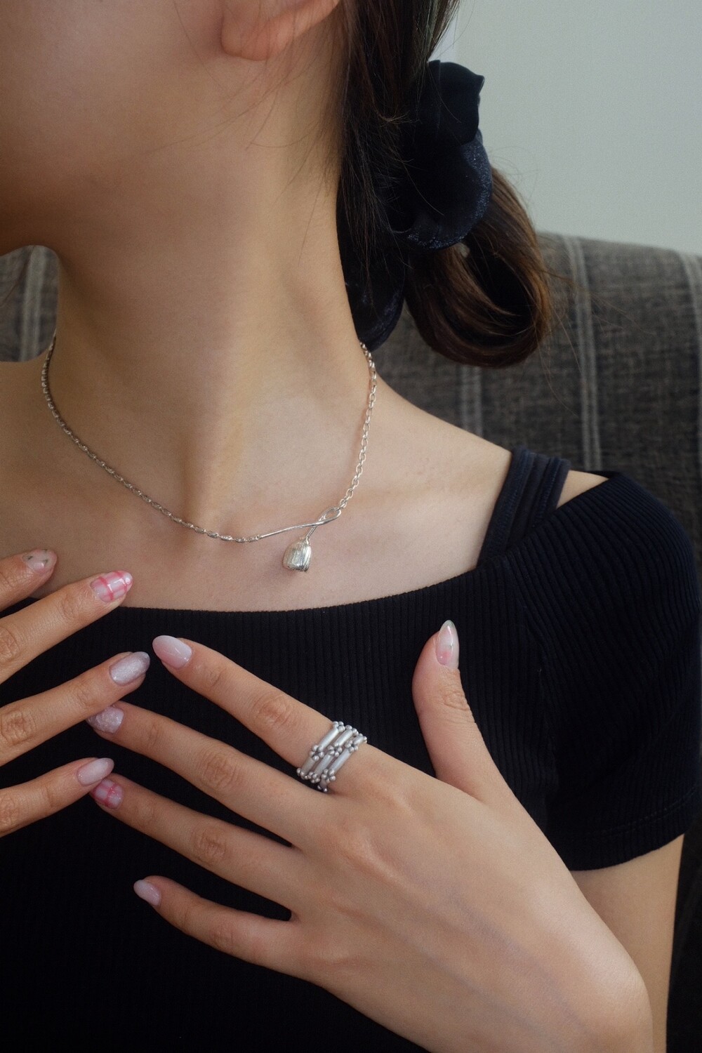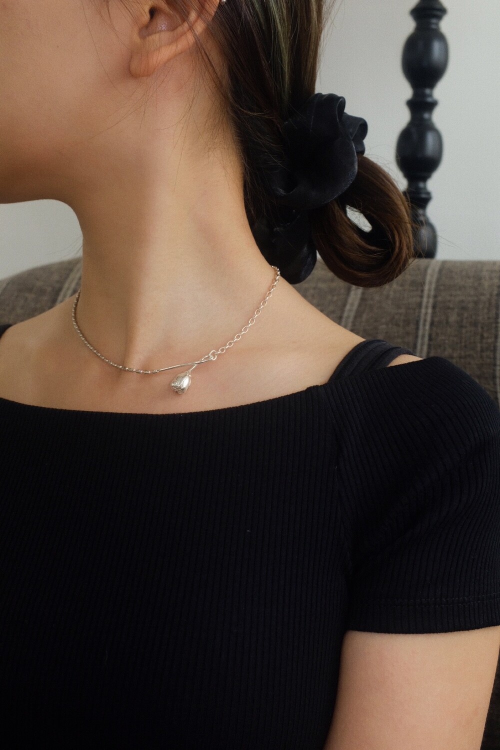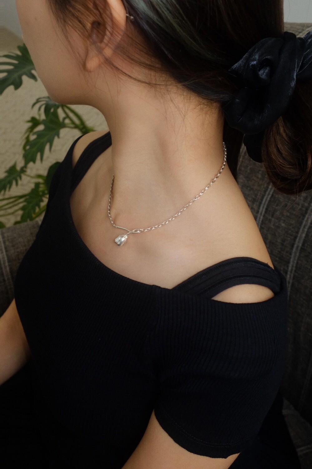 꽃의 위치에 따라 다른 무드로 착용할 수 있으며 연장체인으로 원하시는 길이로 연출 가능합니다.