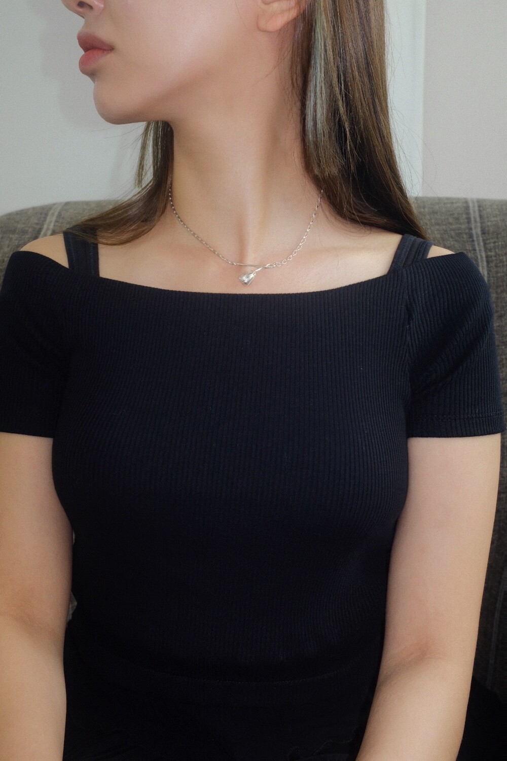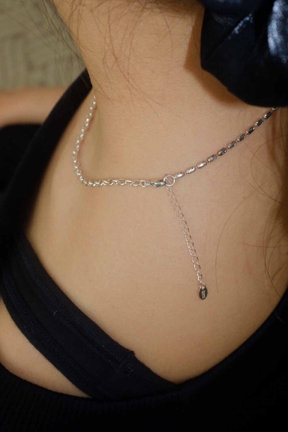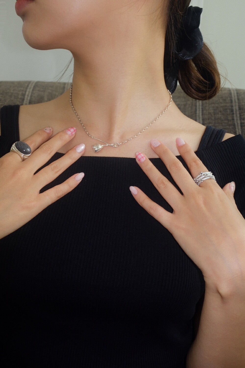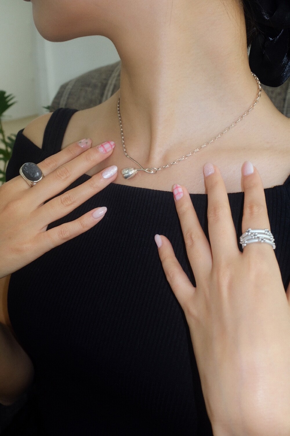 꽃의 위치에 따라 다른 무드로 착용할 수 있으며 연장체인으로 원하시는 길이로 연출 가능합니다.