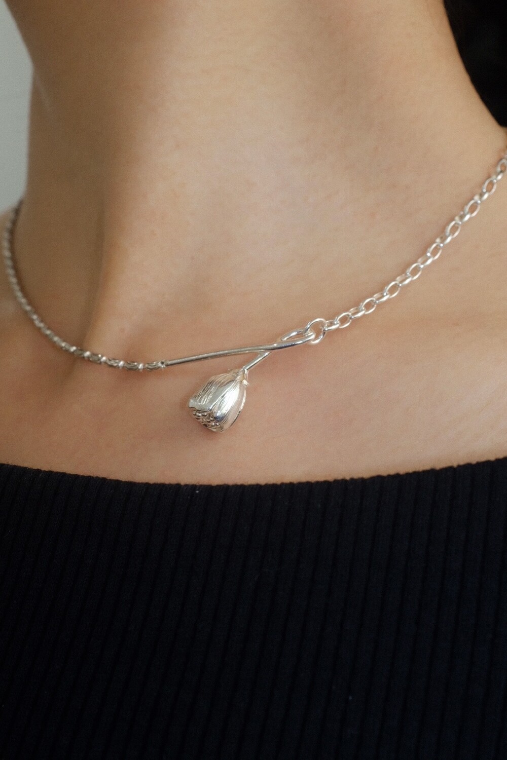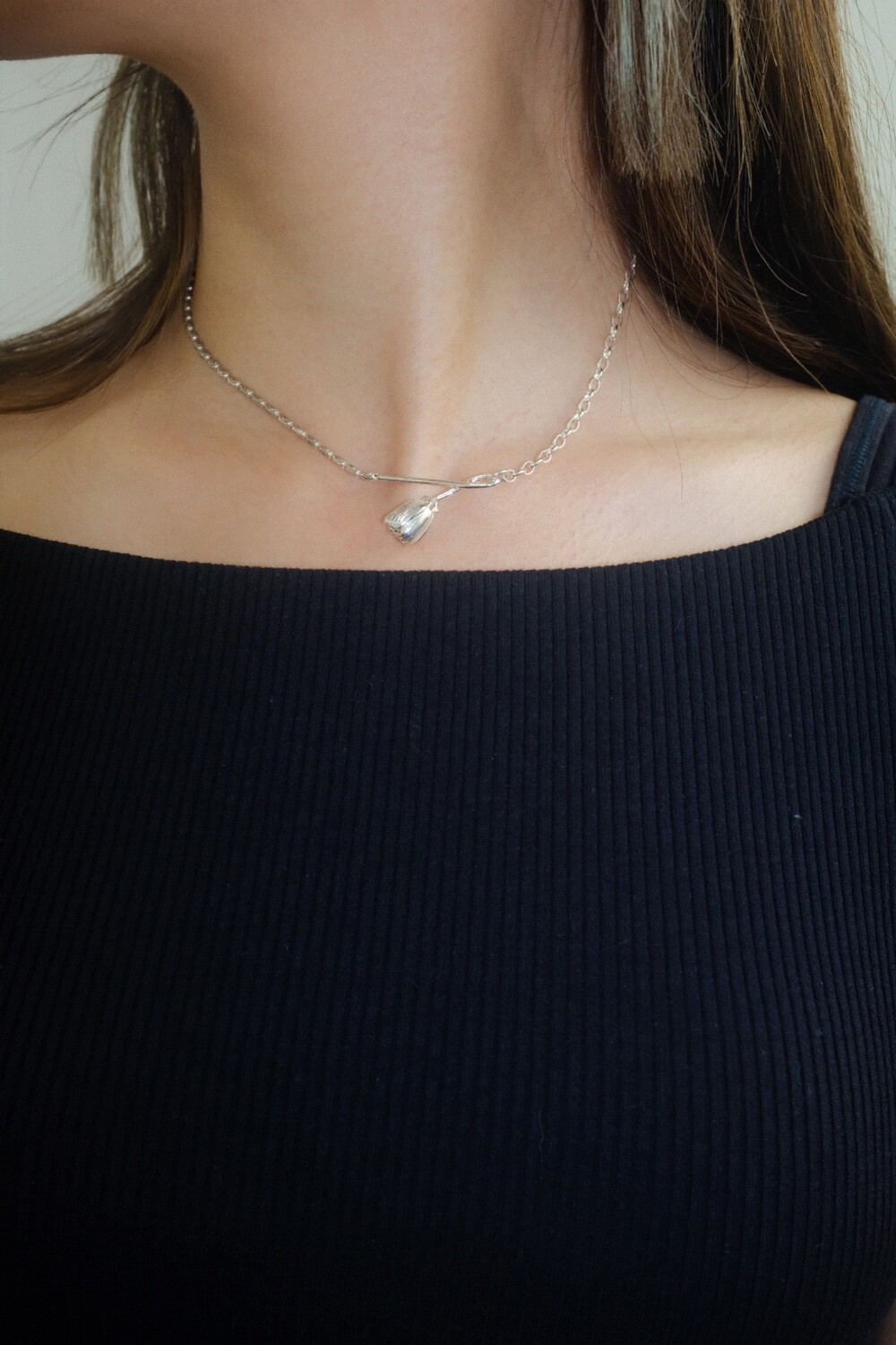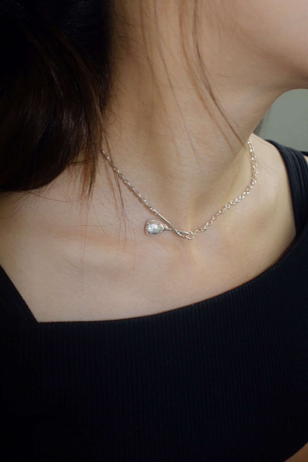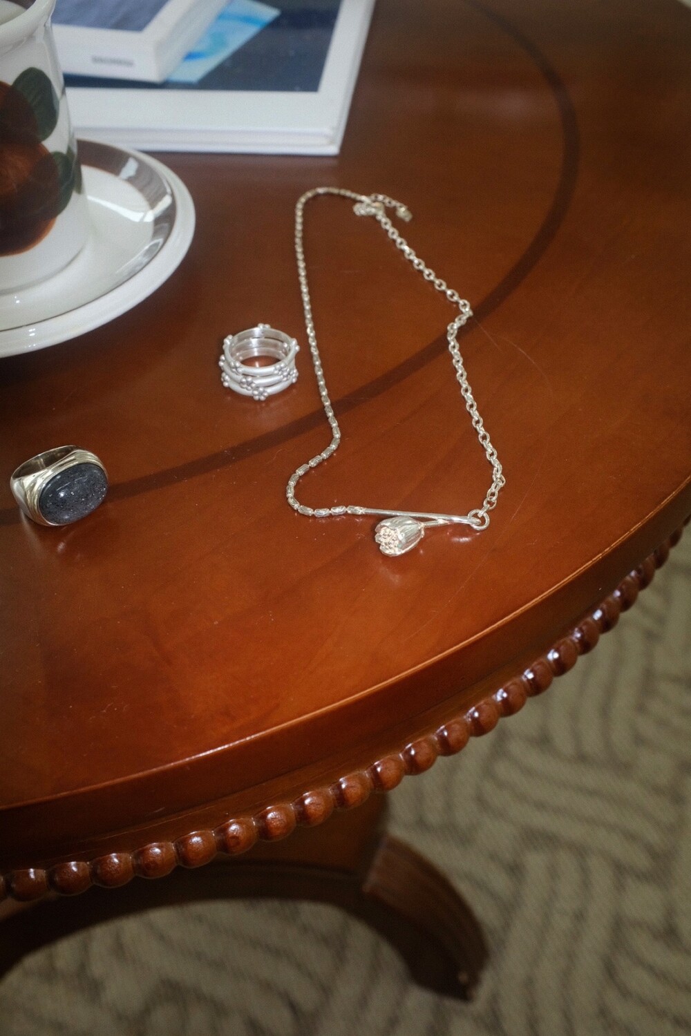 아래로 향해 시들해진 꽃의 펜던트 양쪽으로 다른 체인들을 조합한 목걸이 입니다.