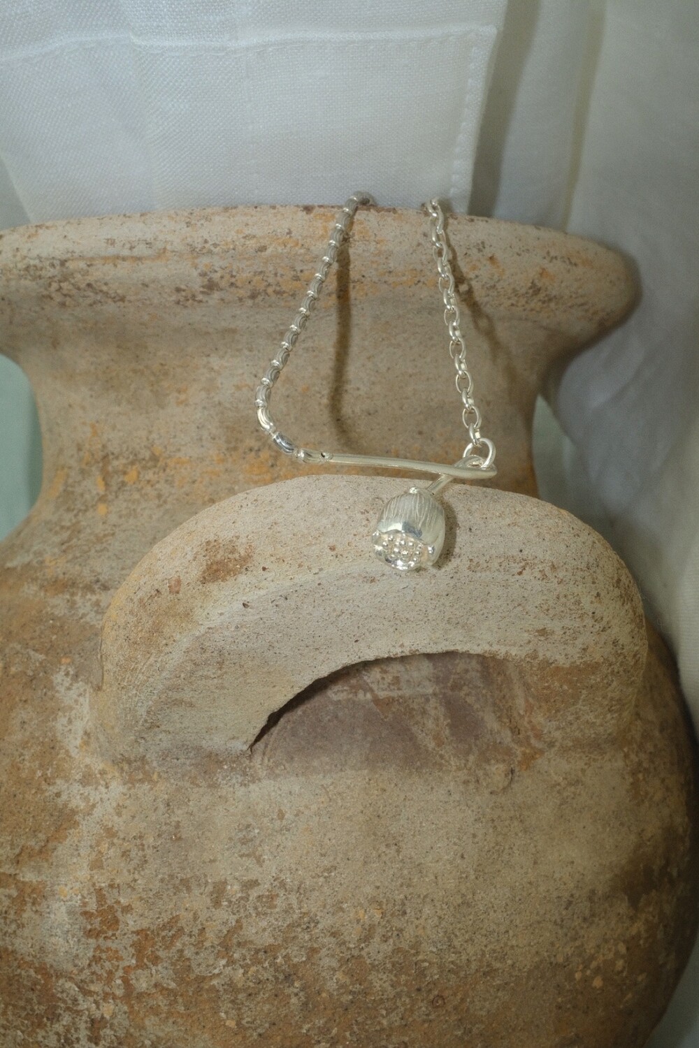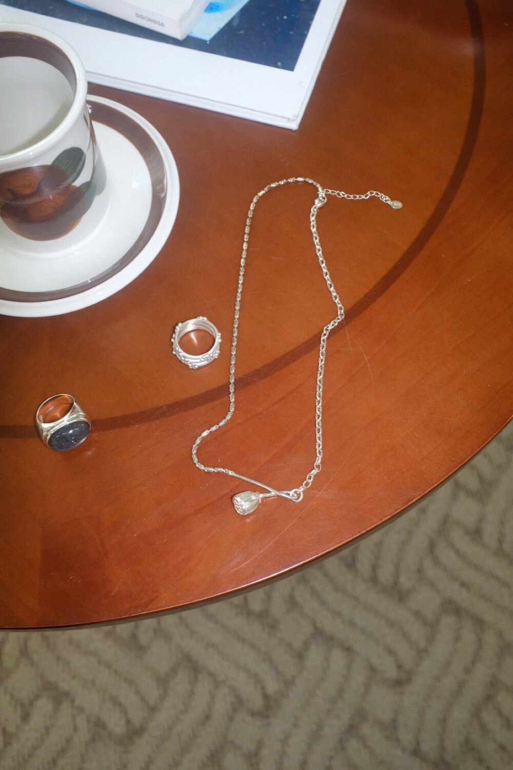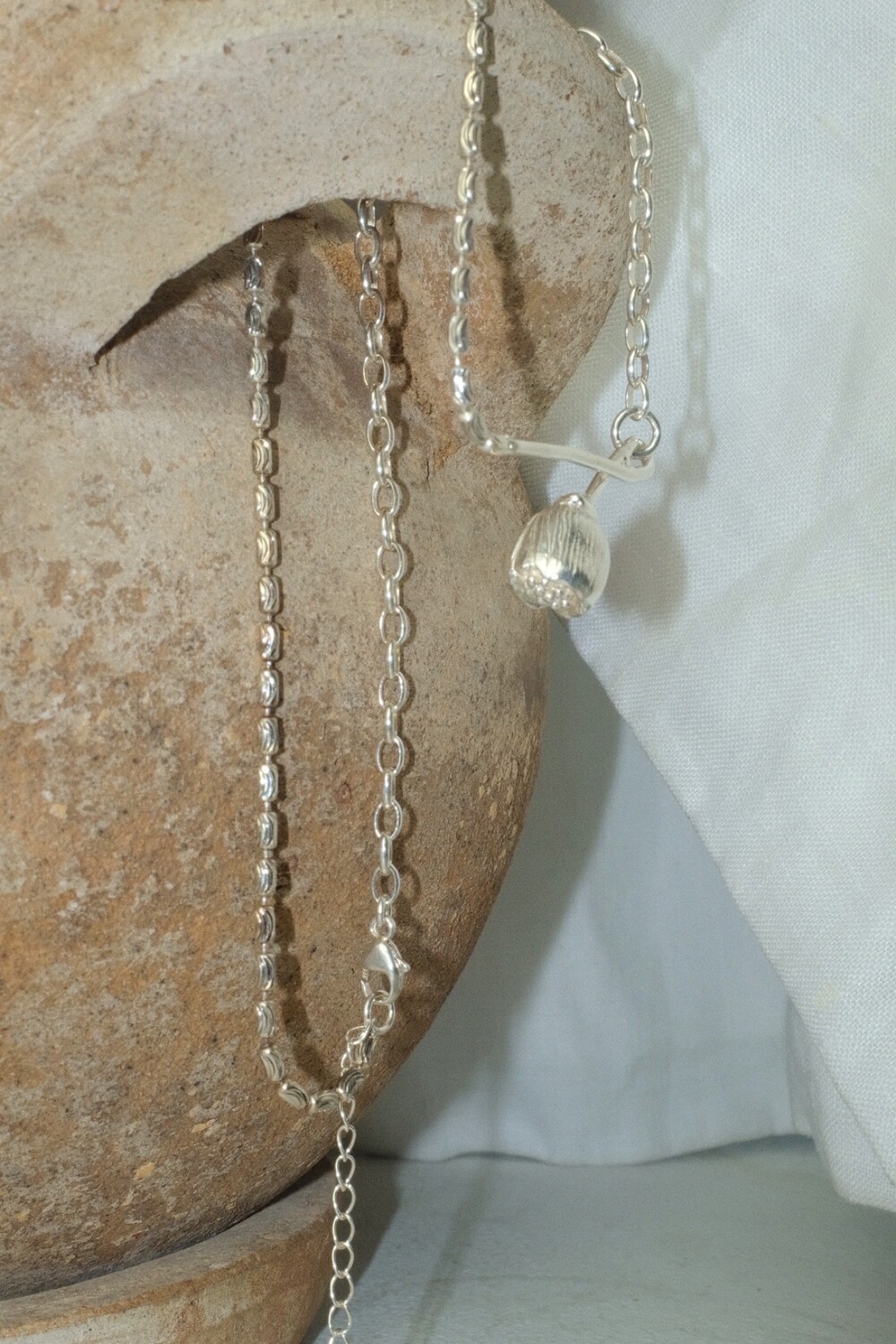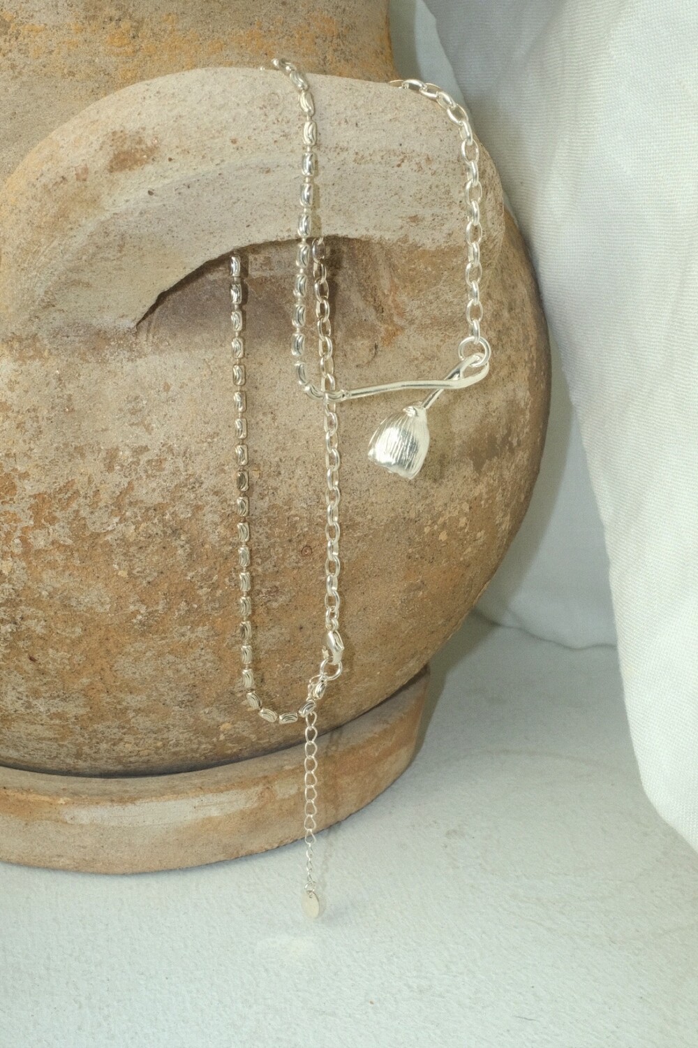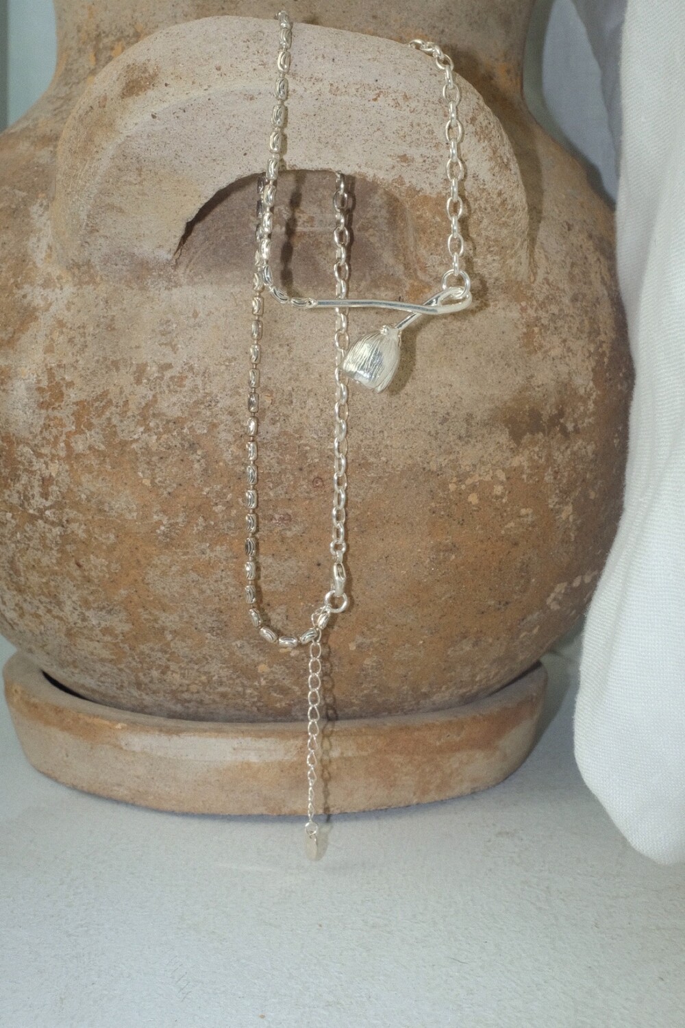 아래로 향해 시들해진 꽃의 펜던트 양쪽으로 다른 체인들을 조합한 목걸이 입니다.