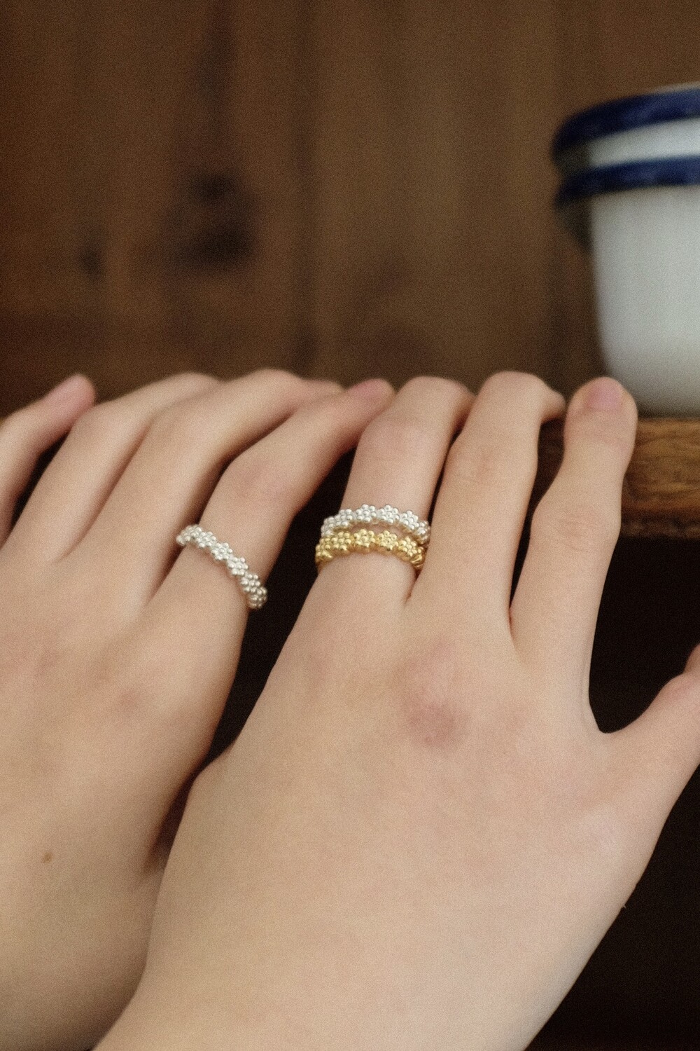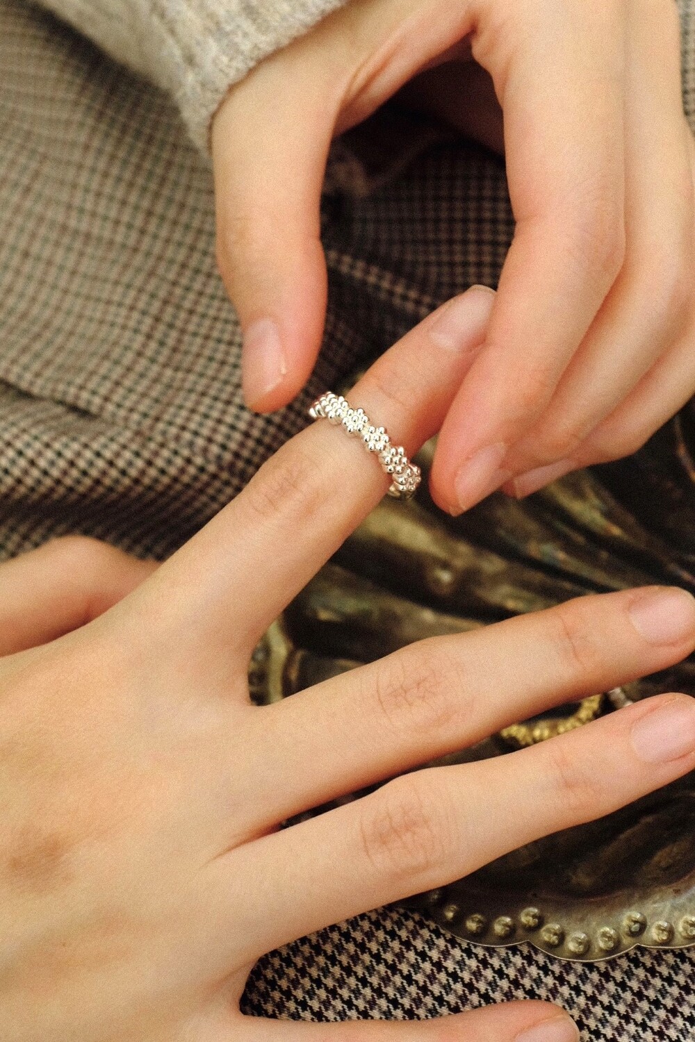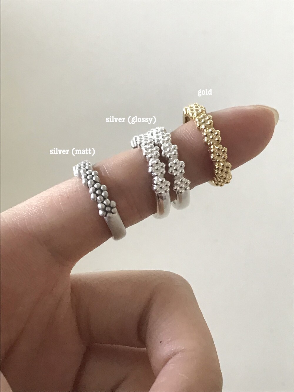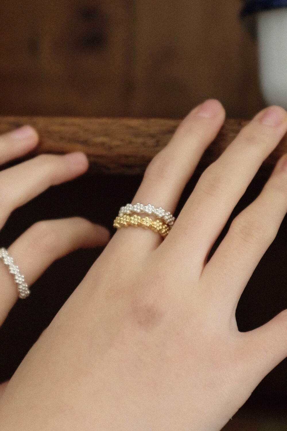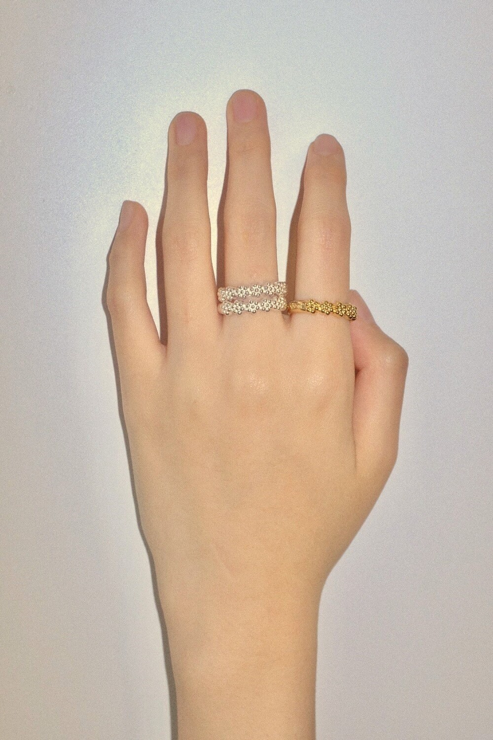7개의 꽃이 연속적으로 배열된 디자인의 반지 입니다.