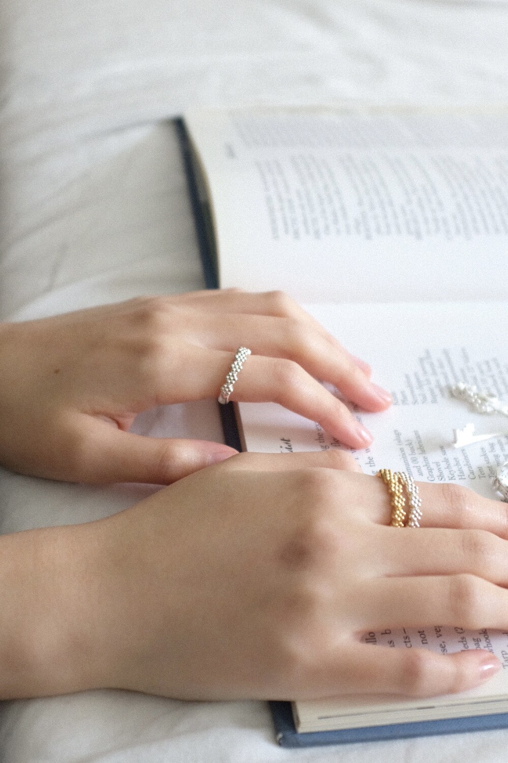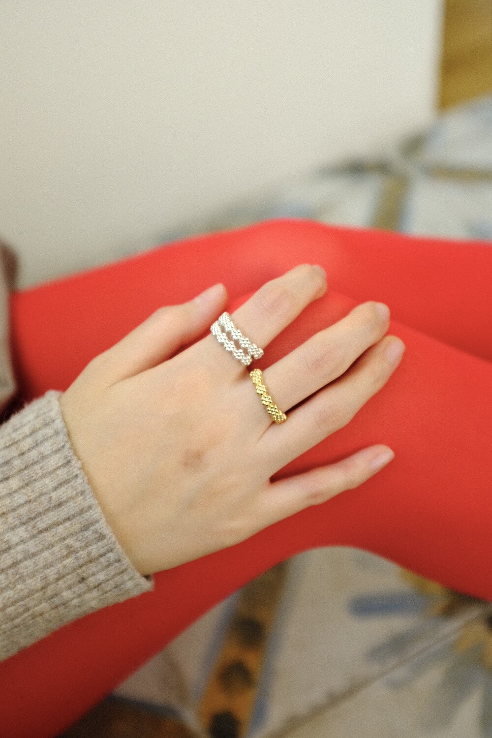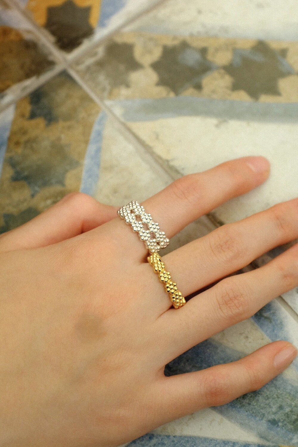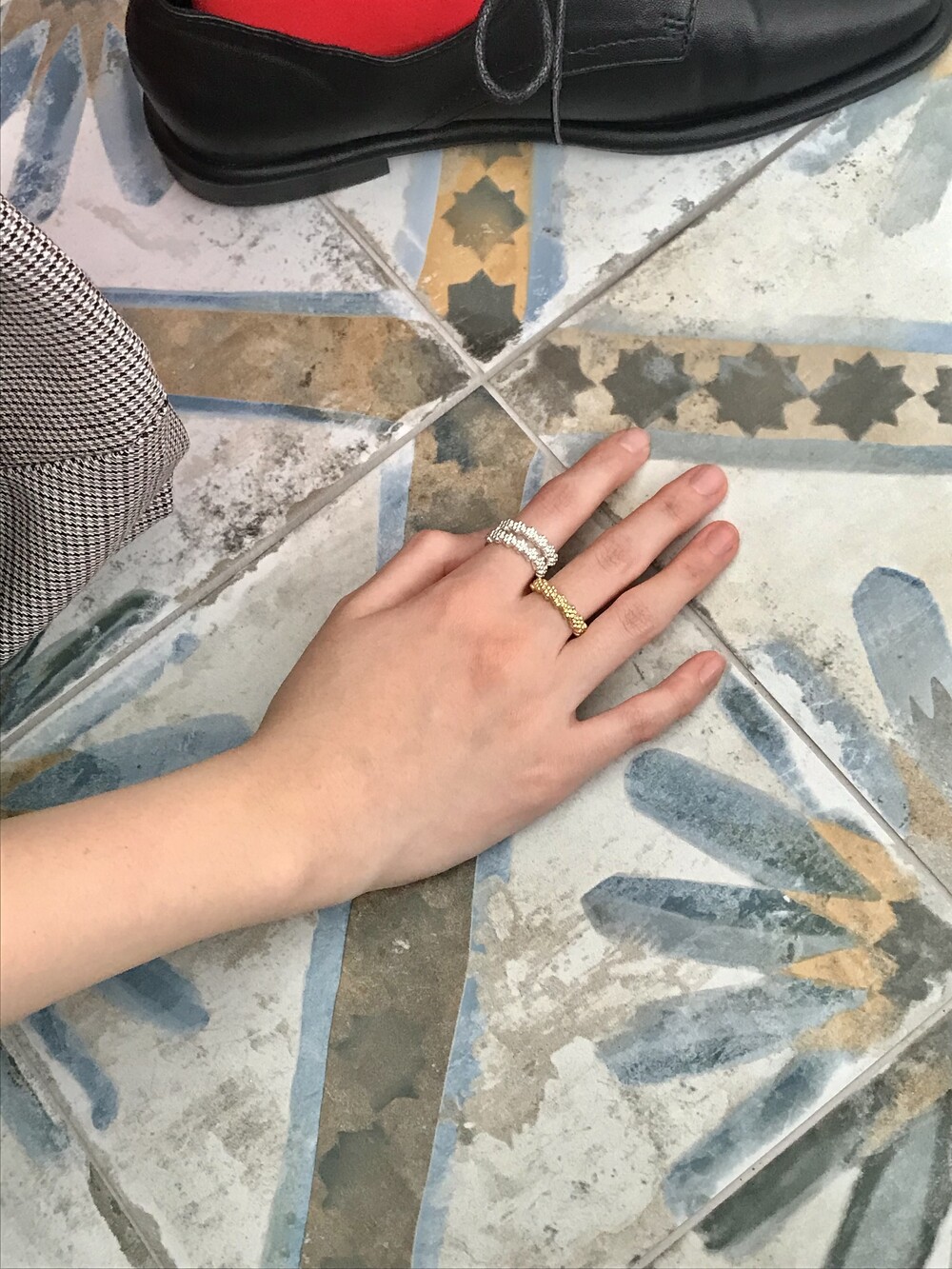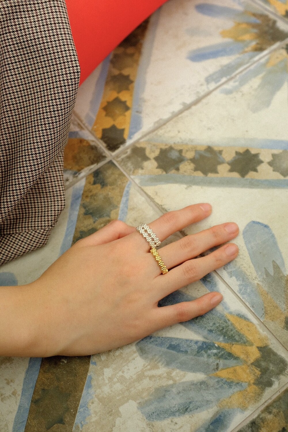 7개의 꽃이 연속적으로 배열된 디자인의 반지 입니다.