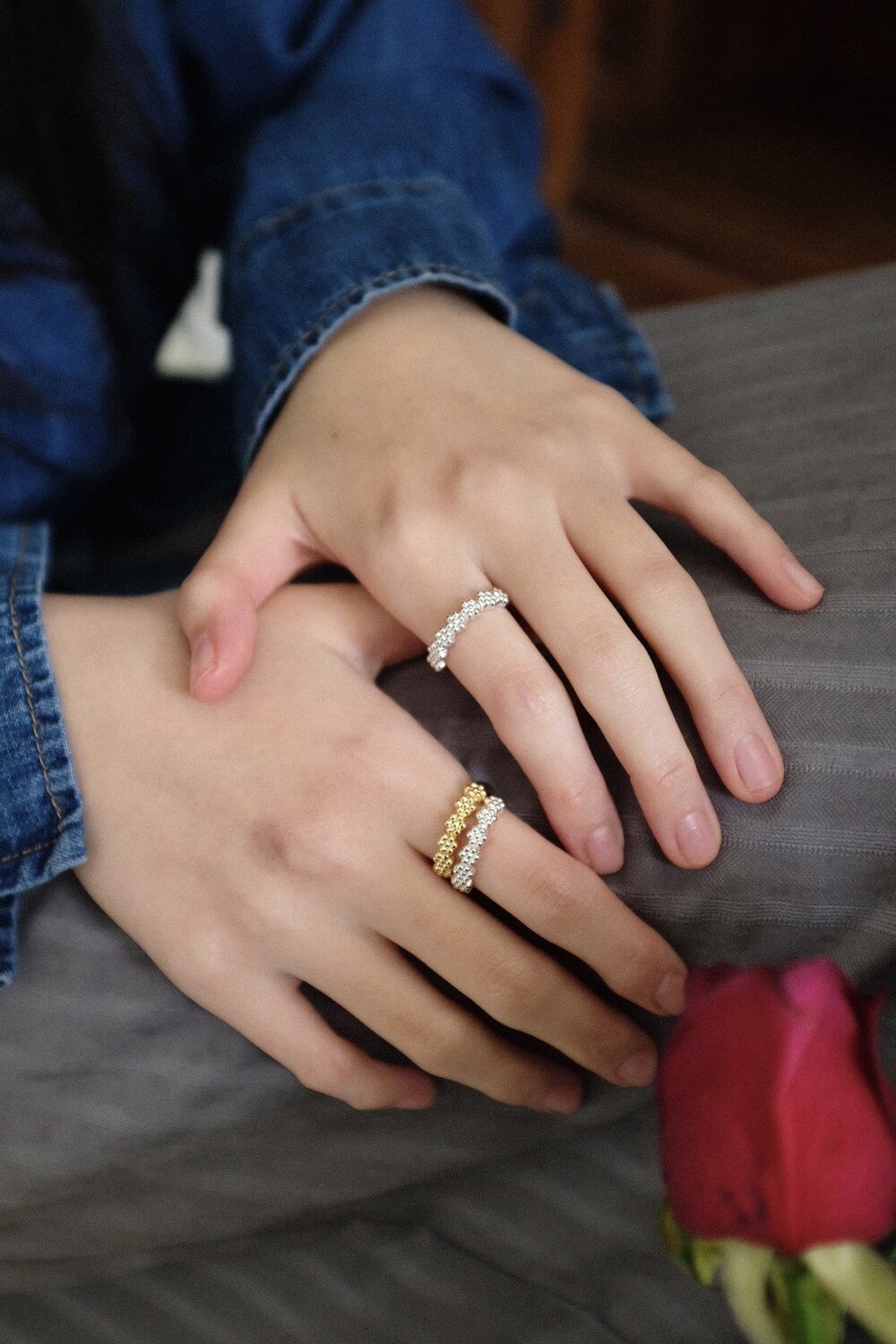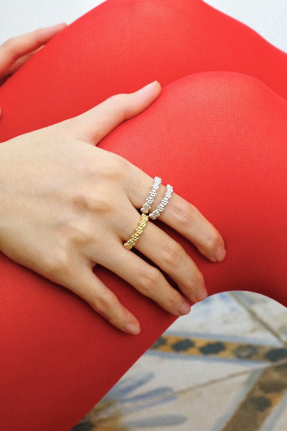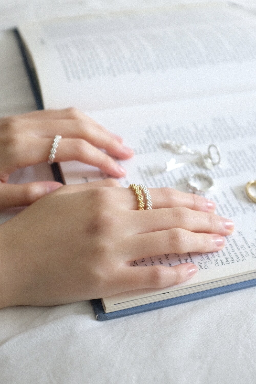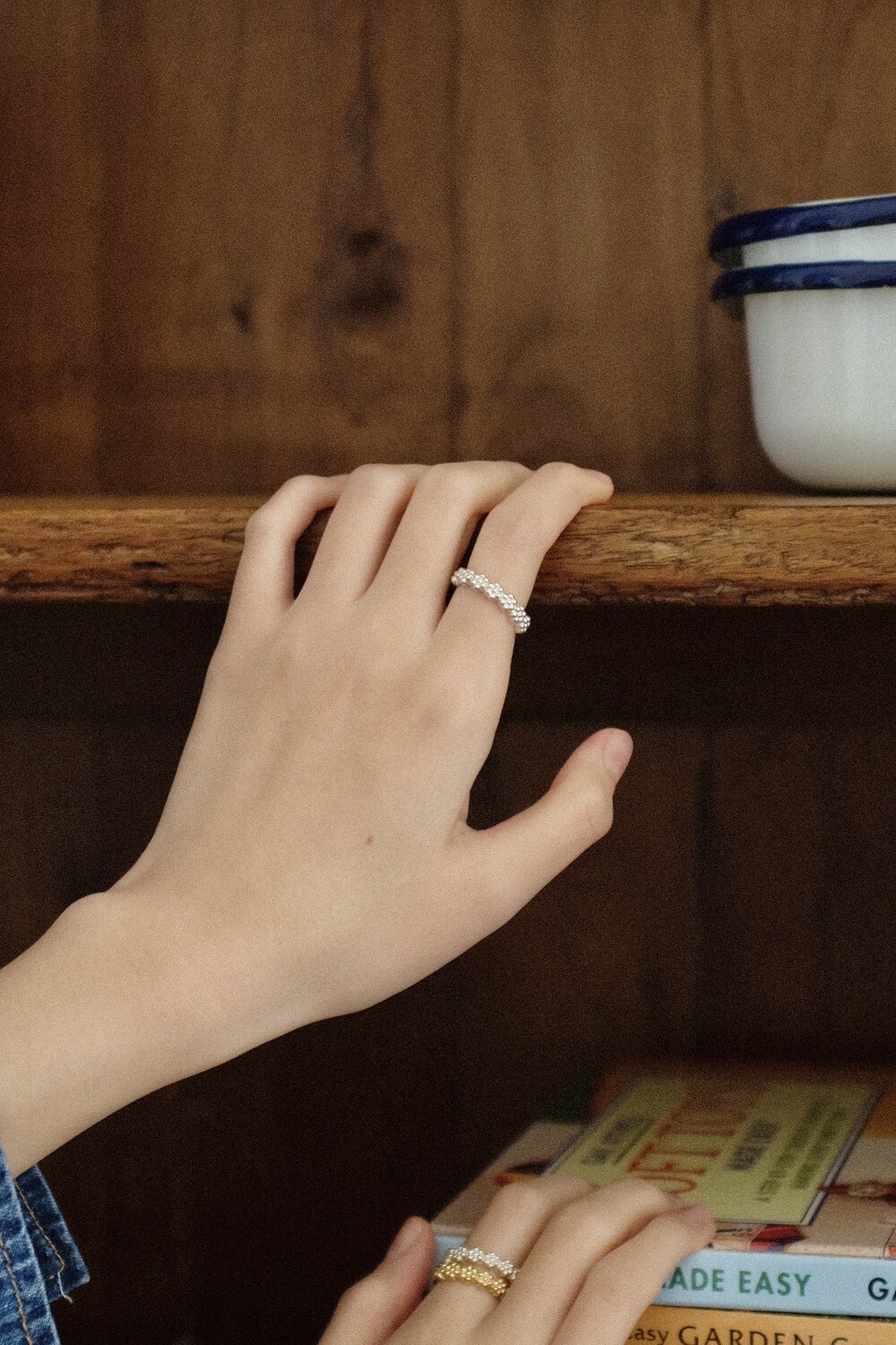 7개의 꽃이 연속적으로 배열된 디자인의 반지 입니다.