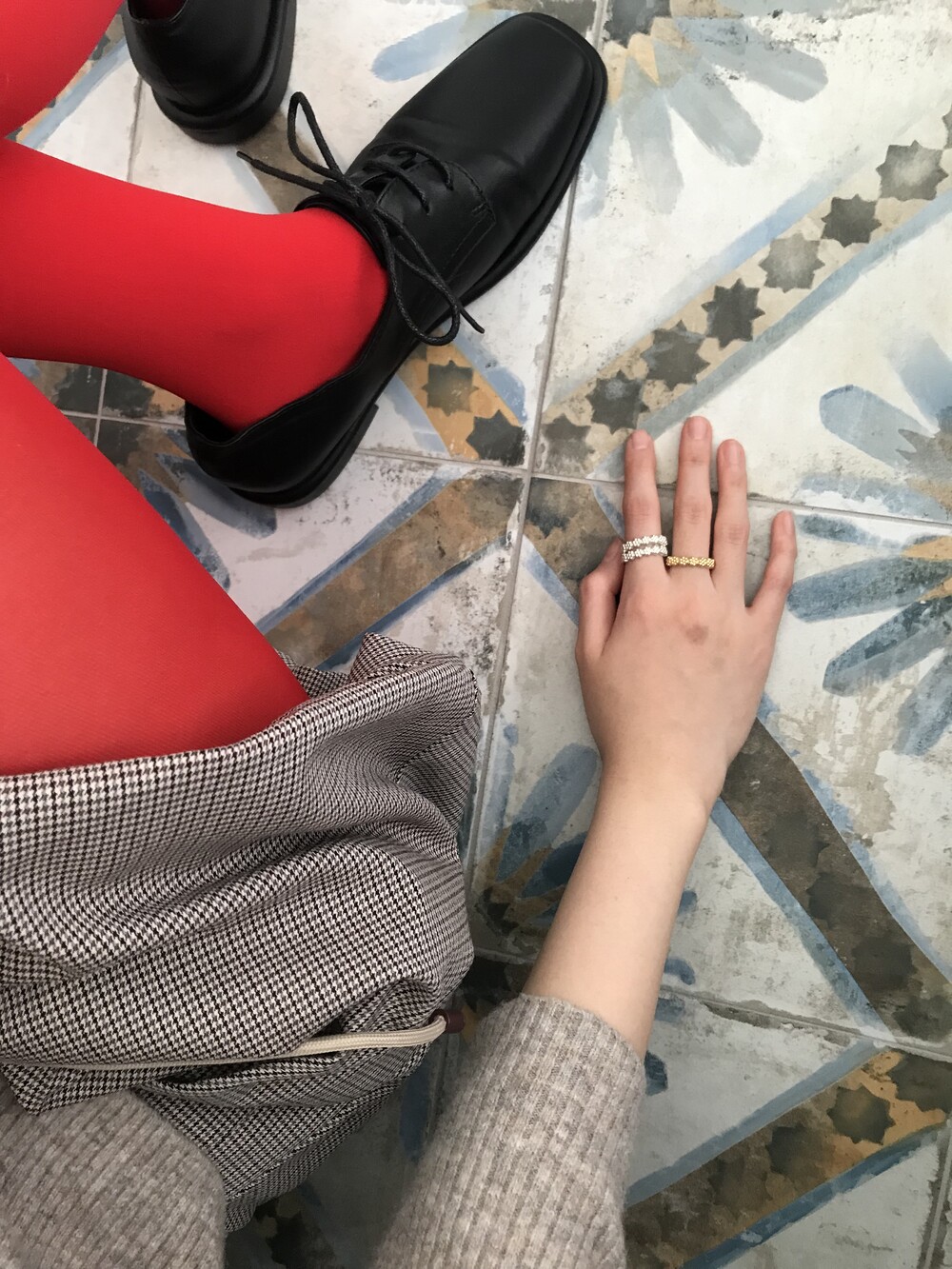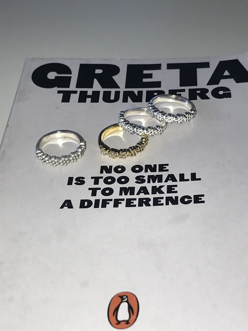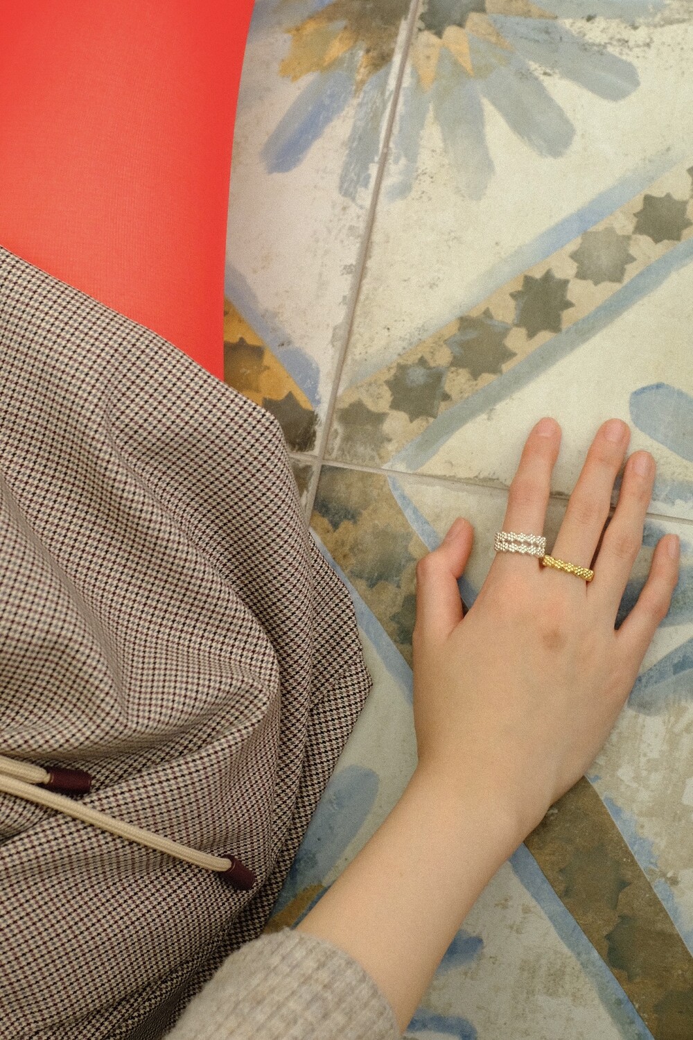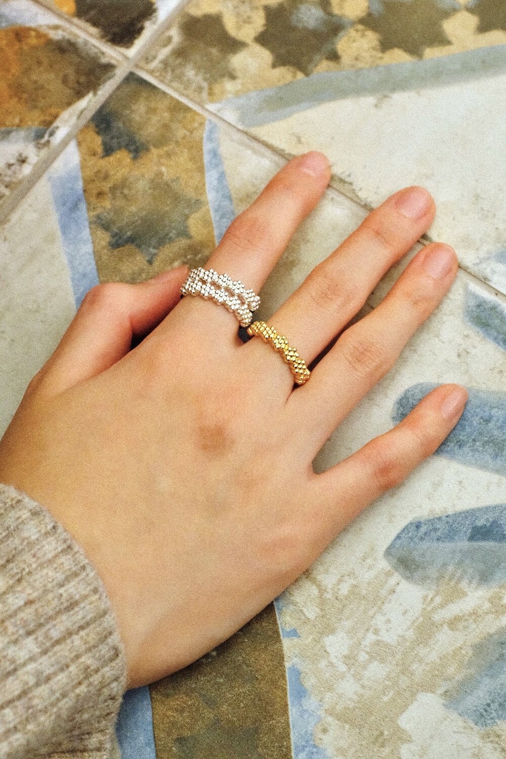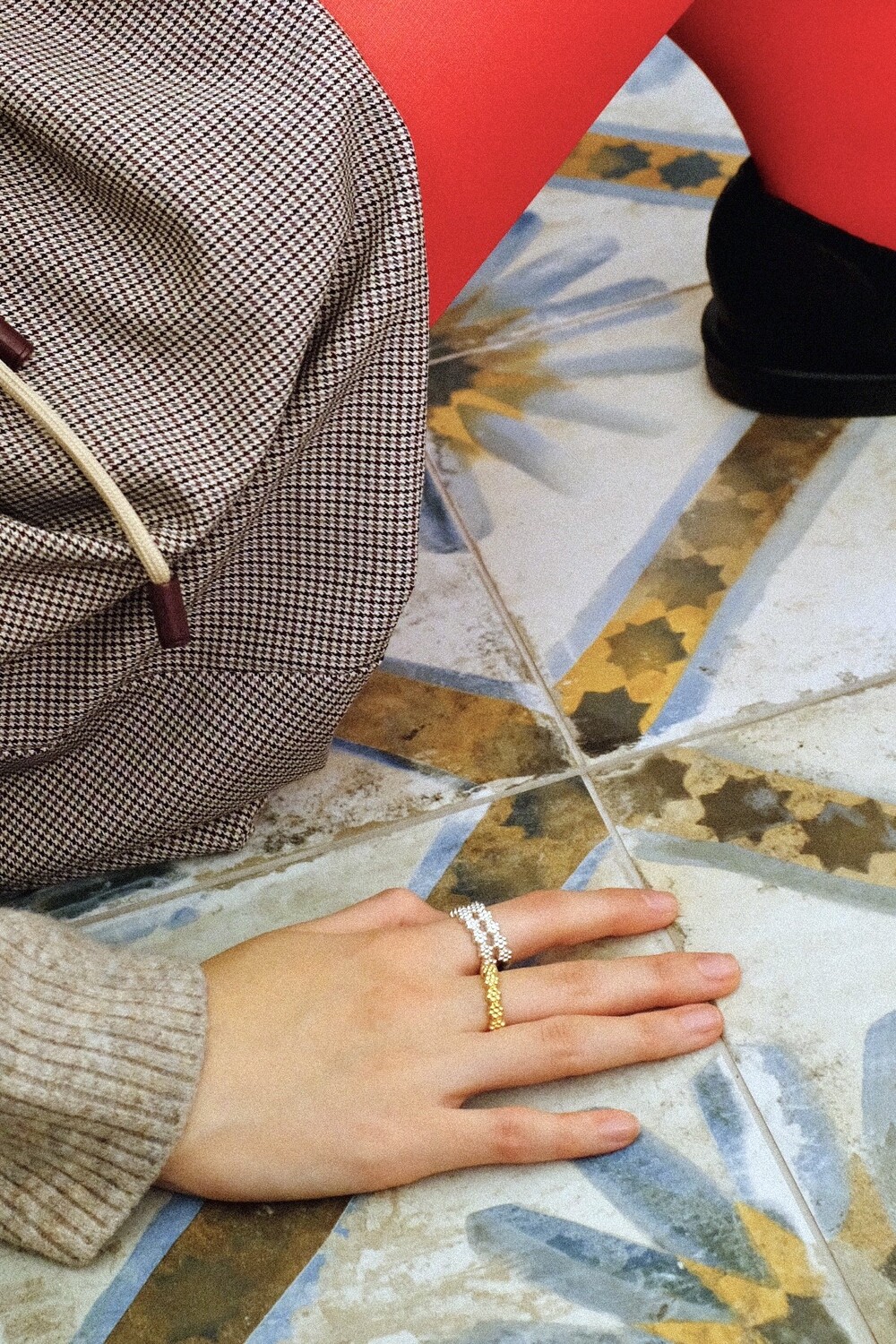 7개의 꽃이 연속적으로 배열된 디자인의 반지 입니다.