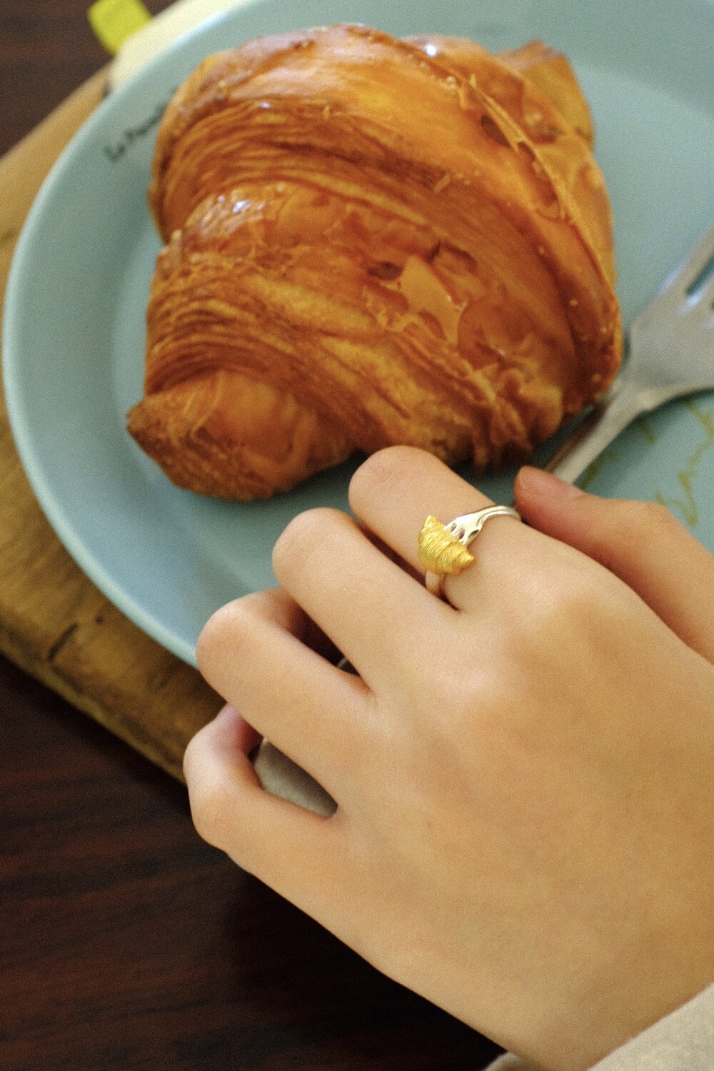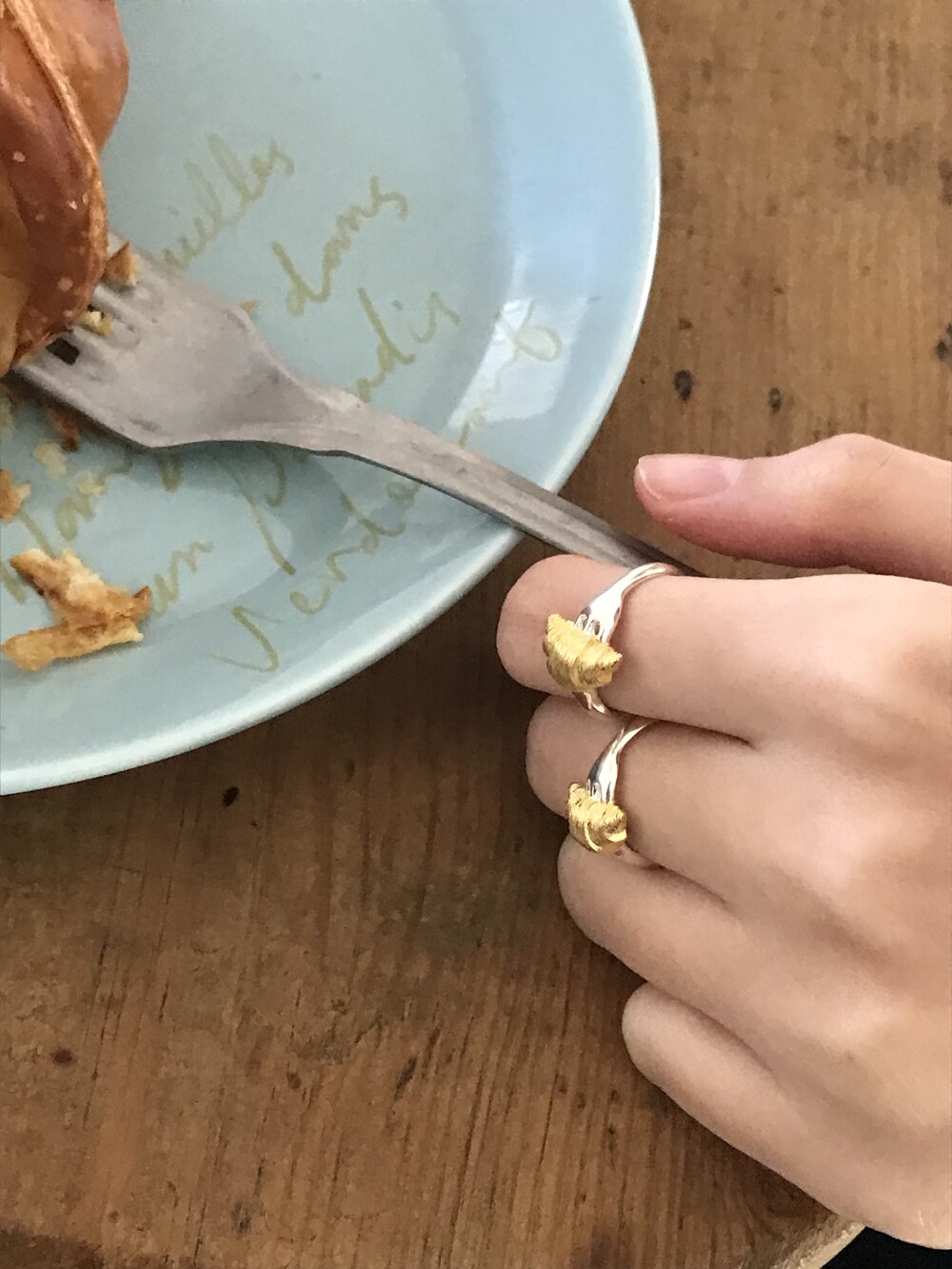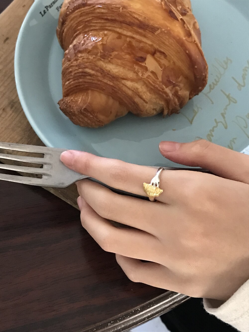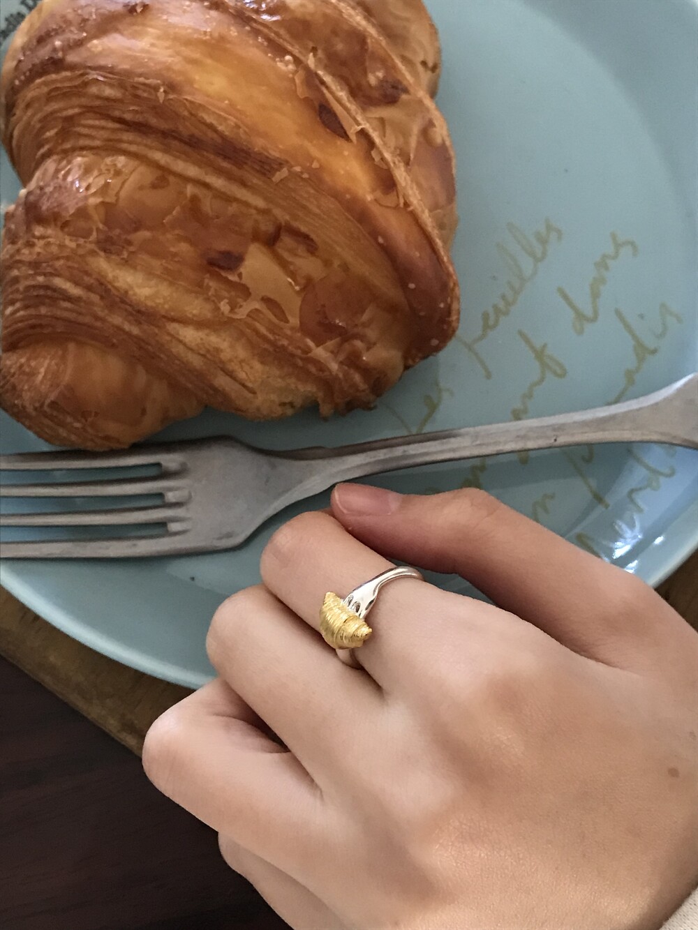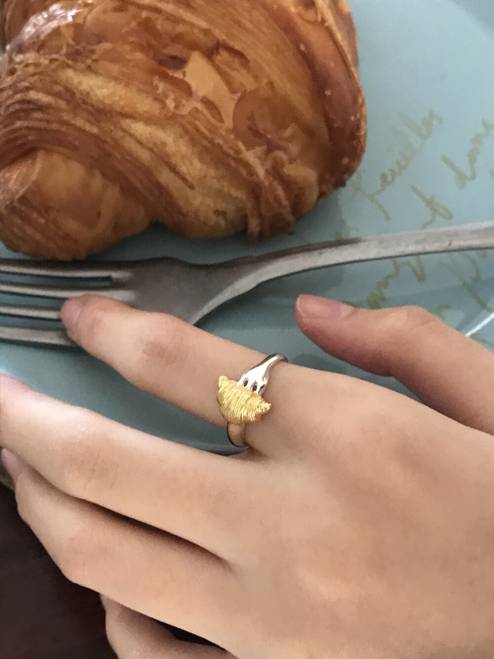 크로와상 빵을 포크로 콕 찍은 모양으로 제작된 반지 입니다.
