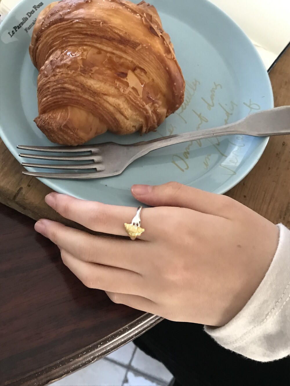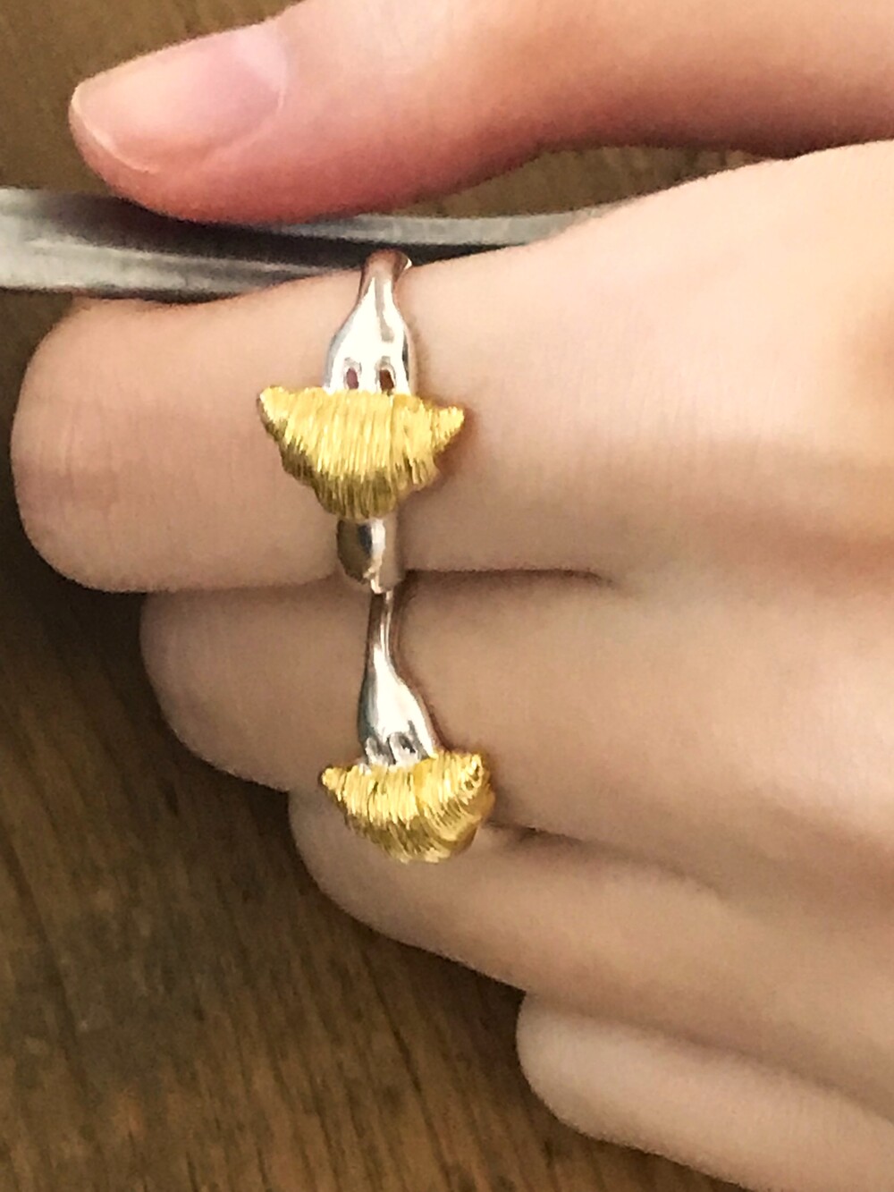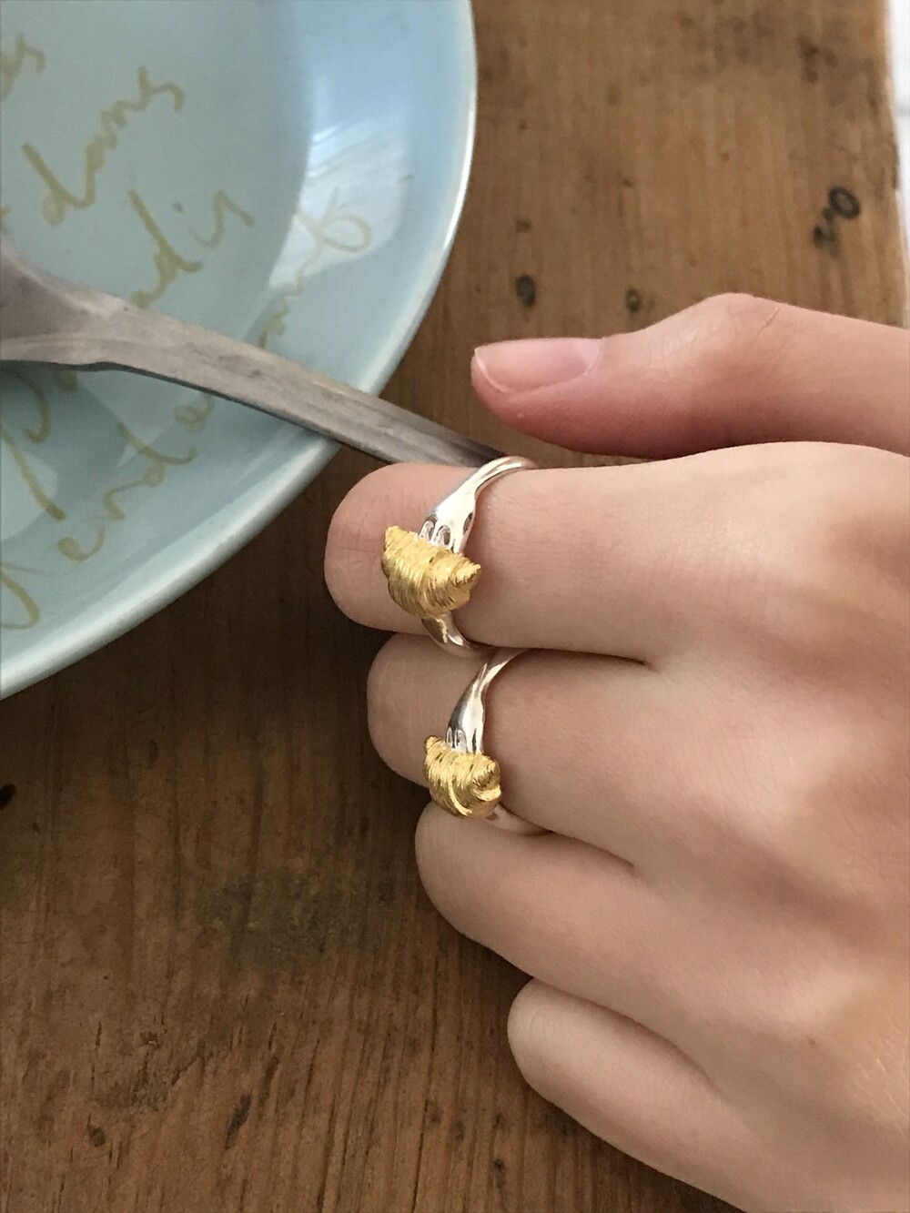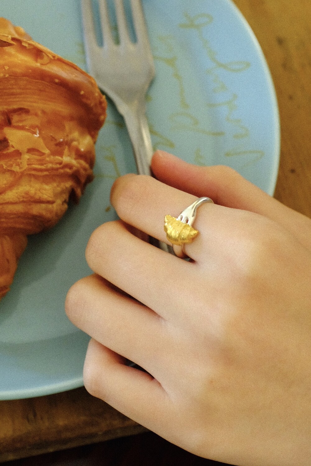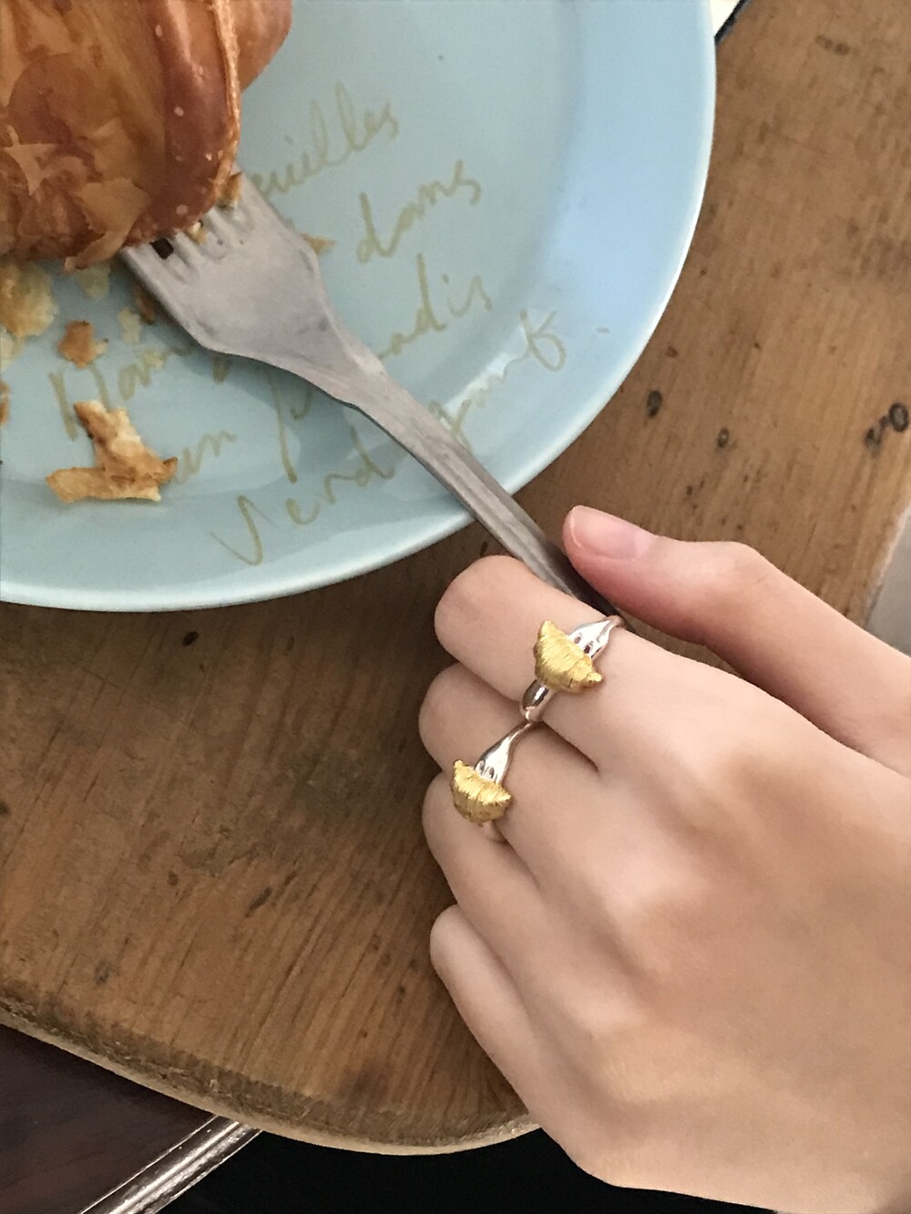 크로와상 빵을 포크로 콕 찍은 모양으로 제작된 반지 입니다.