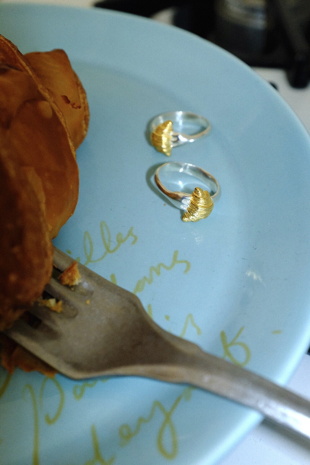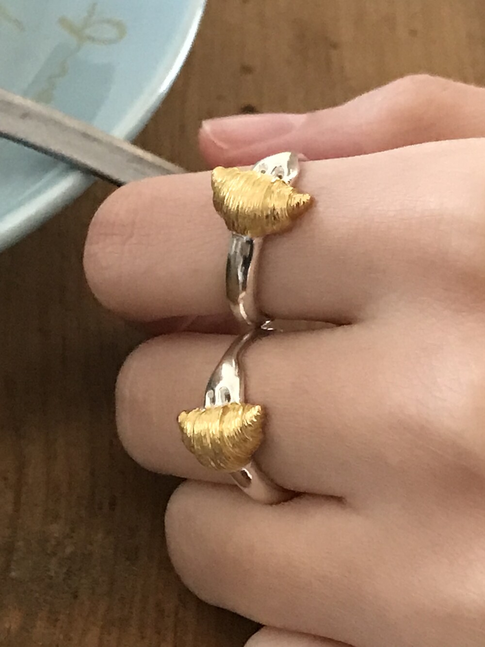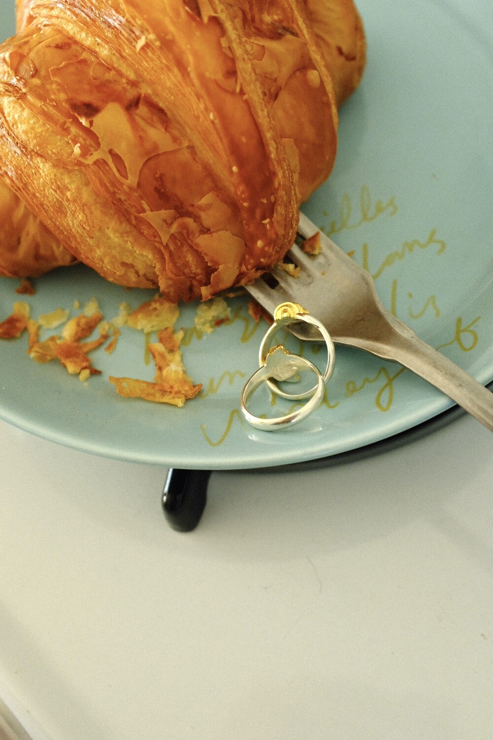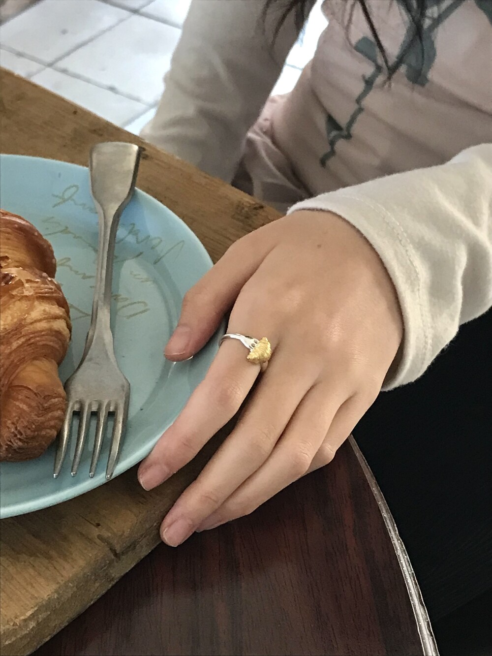 크로와상 빵을 포크로 콕 찍은 모양으로 제작된 반지 입니다.