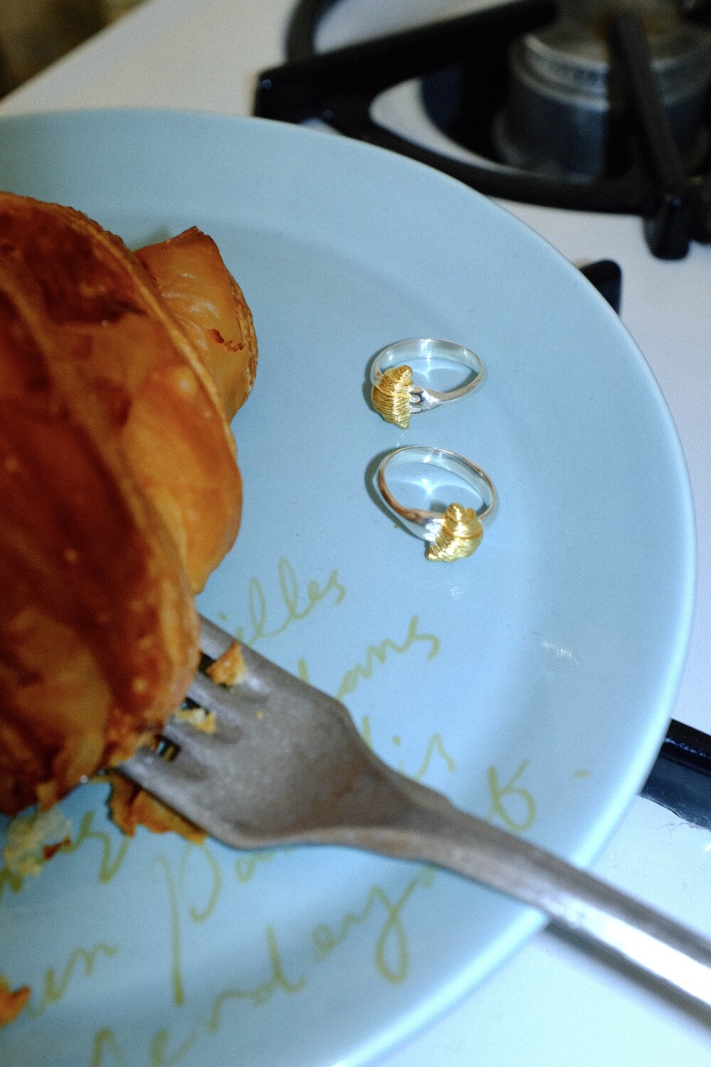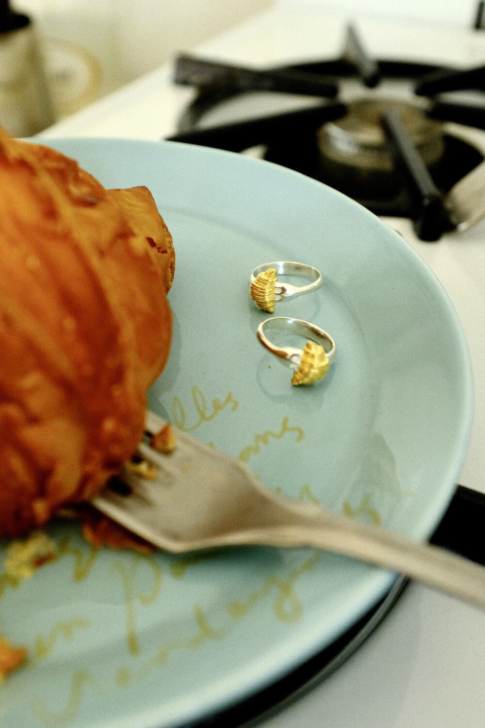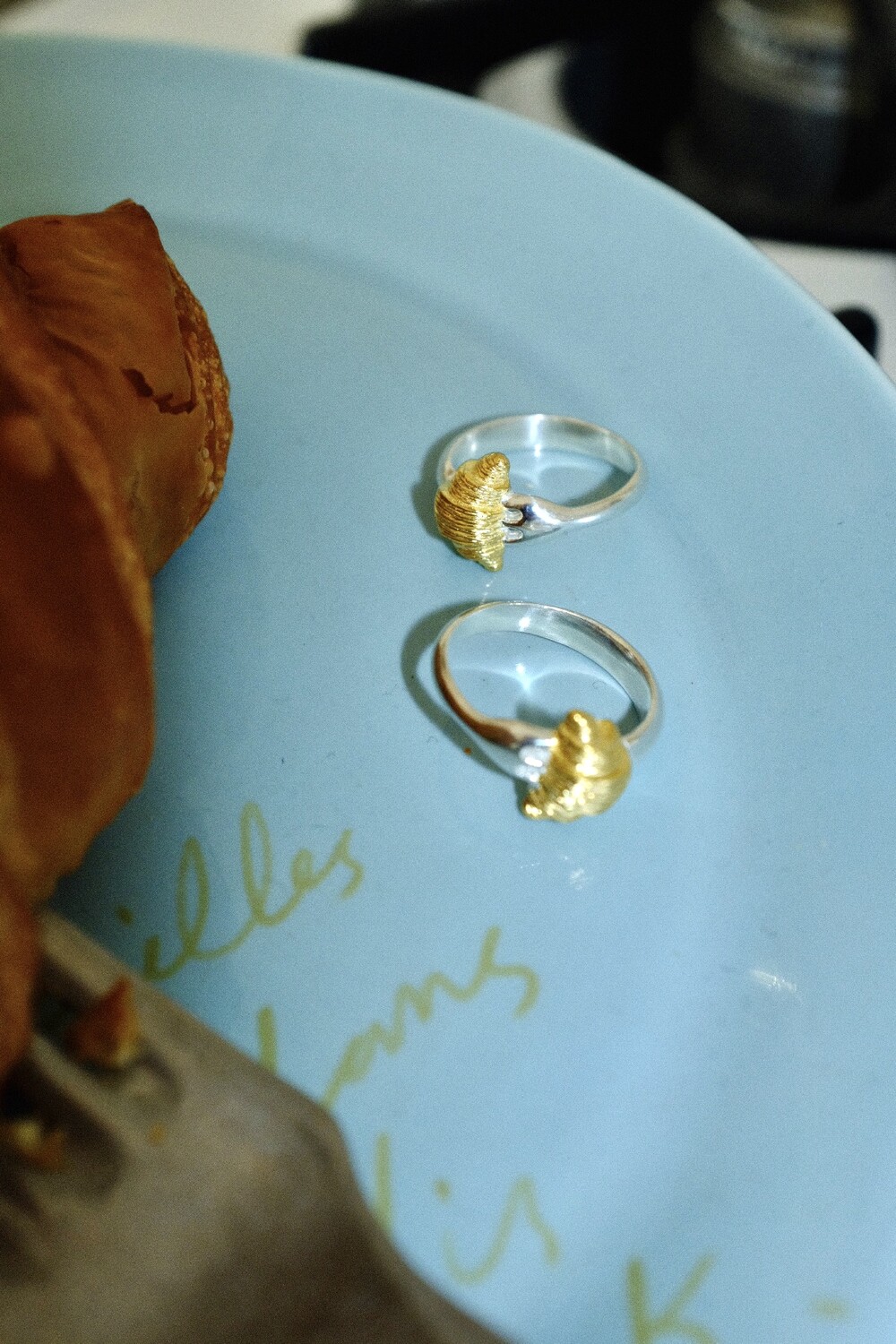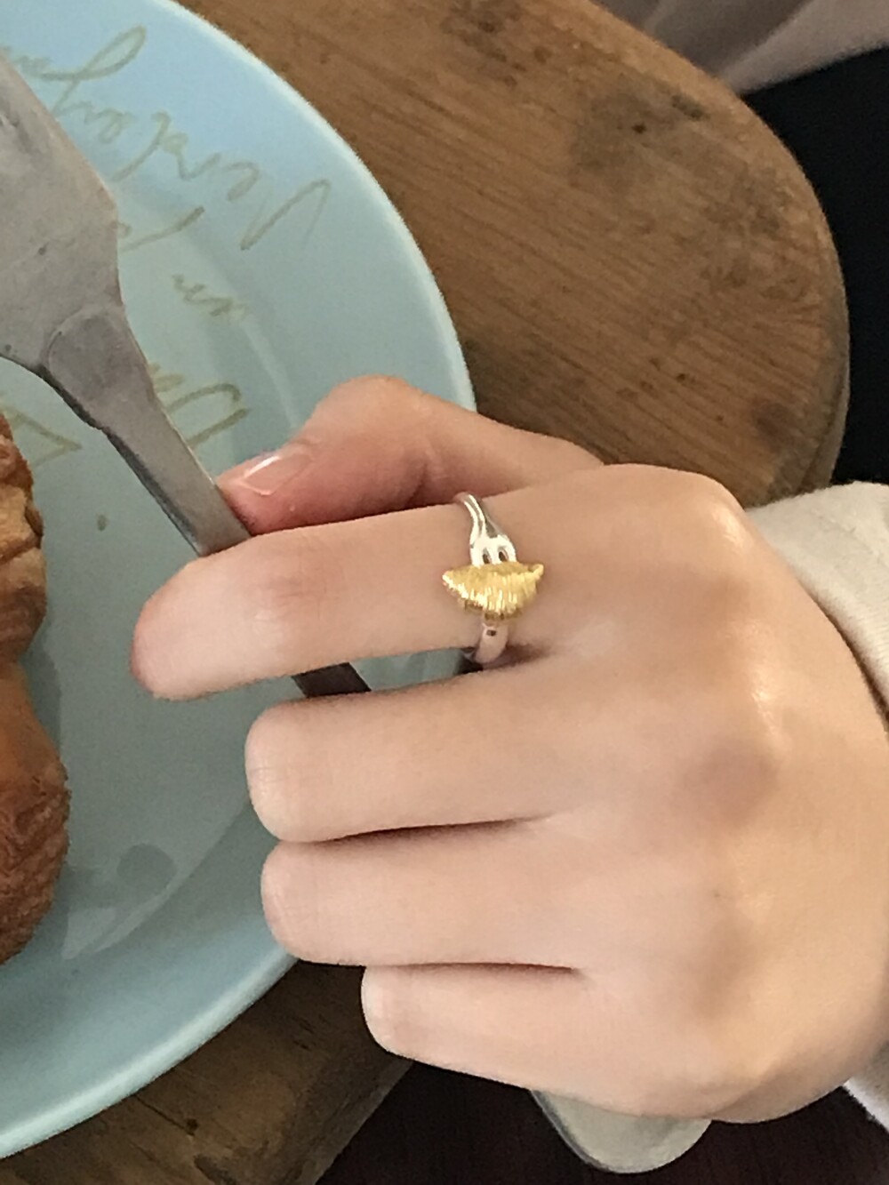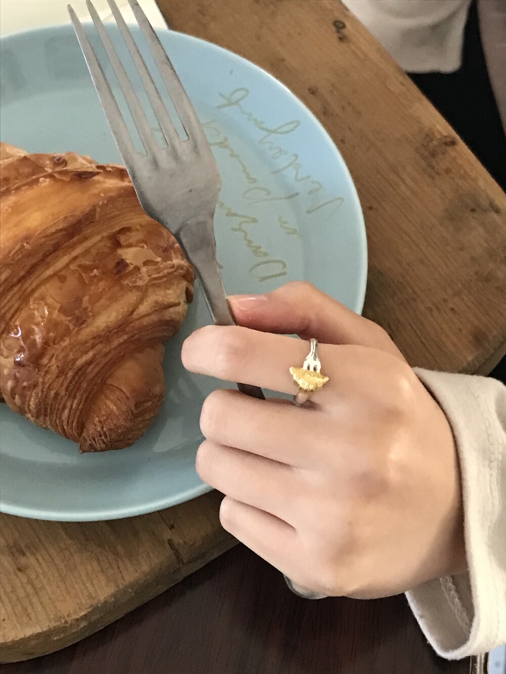 크로와상 빵을 포크로 콕 찍은 모양으로 제작된 반지 입니다.