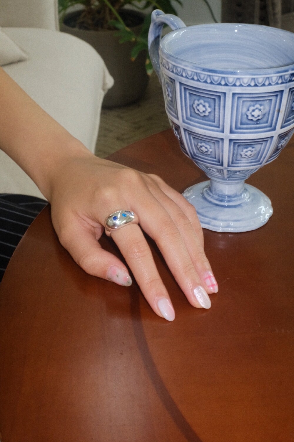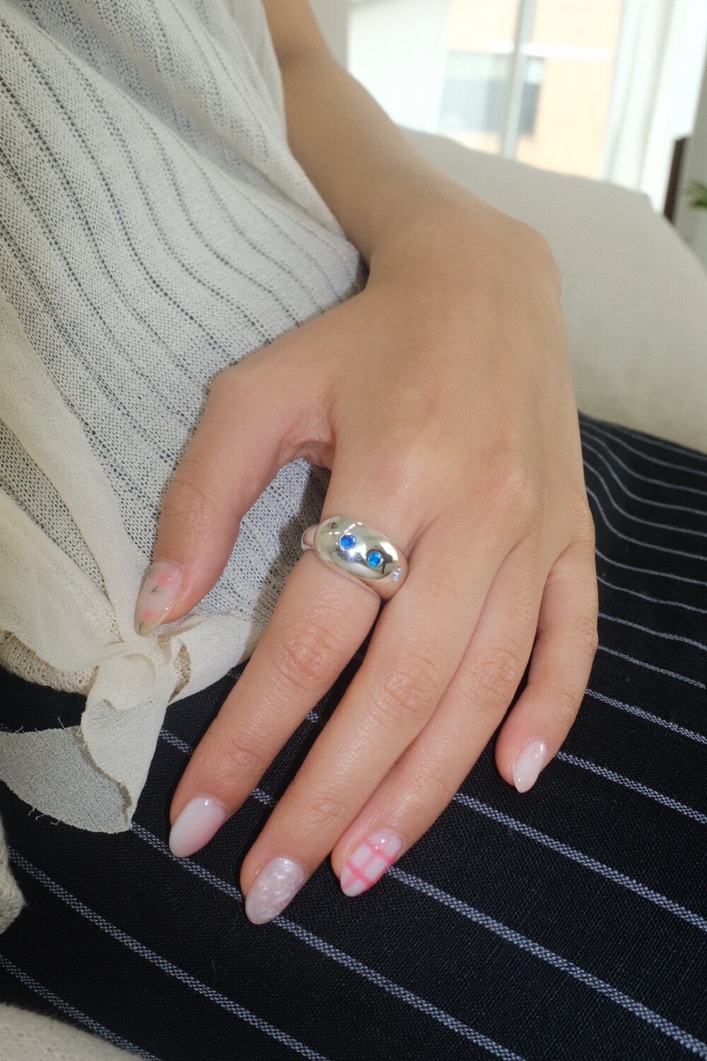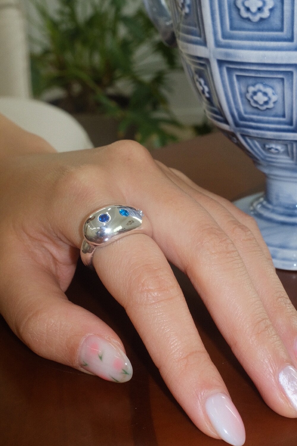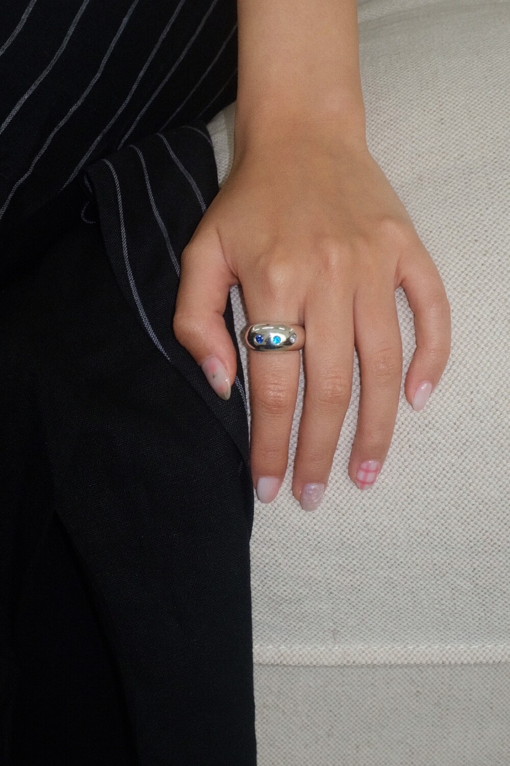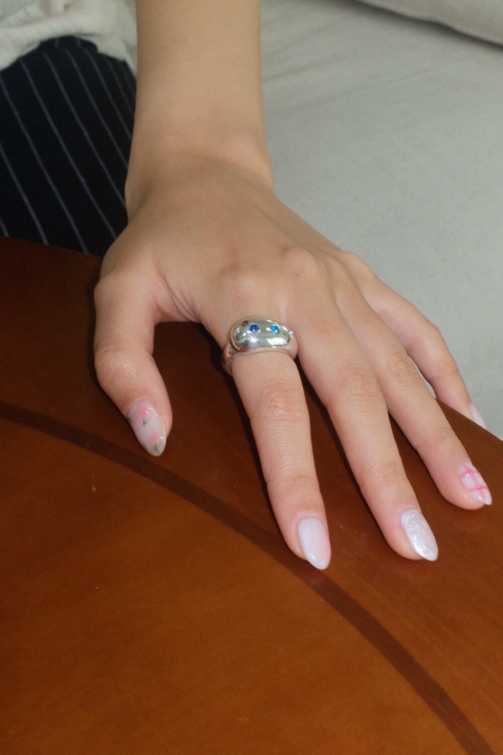 기존의 Volume ring을 볼드 한 버전으로 제작된 제품입니다. 심플한 실루엣이지만 통과된듯한 디테일과 3가지 톤의 블루 색상 큐빅으로 포인트가 추가되었습니다.