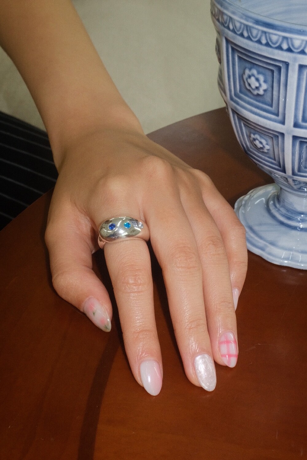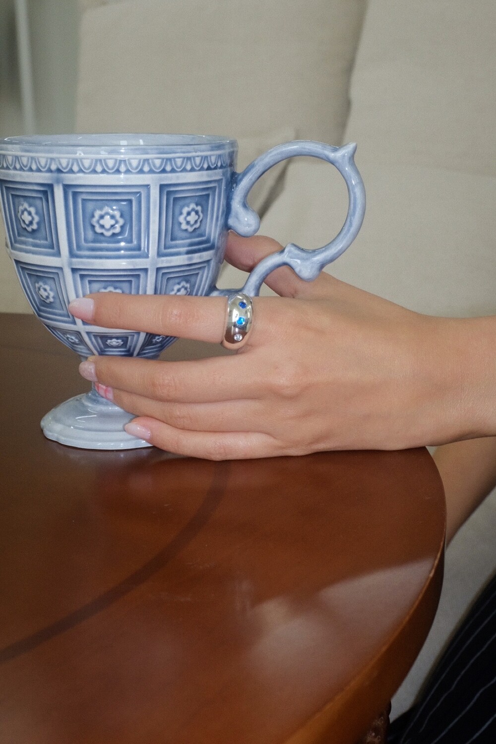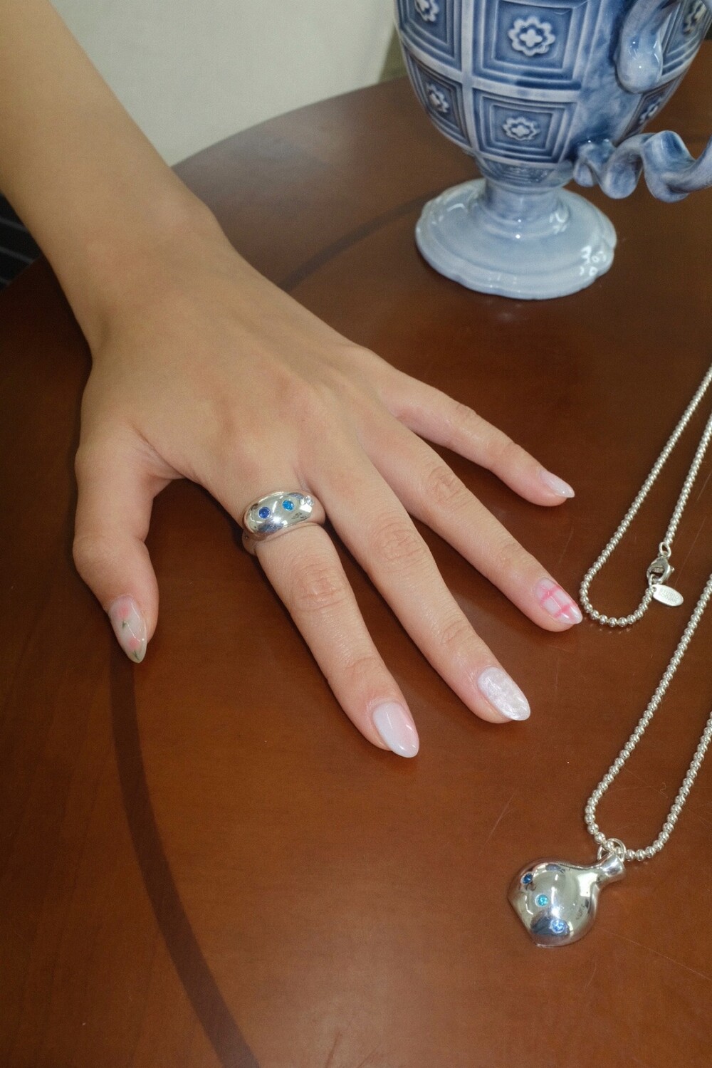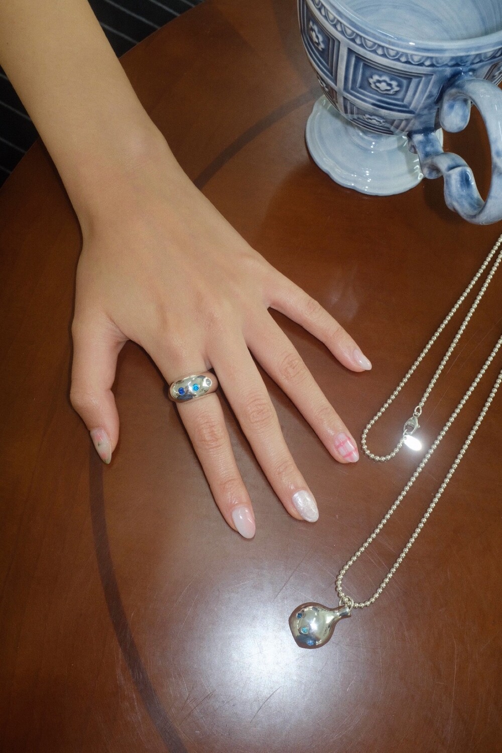 기존의 Volume ring을 볼드 한 버전으로 제작된 제품입니다. 심플한 실루엣이지만 통과된듯한 디테일과 3가지 톤의 블루 색상 큐빅으로 포인트가 추가되었습니다.