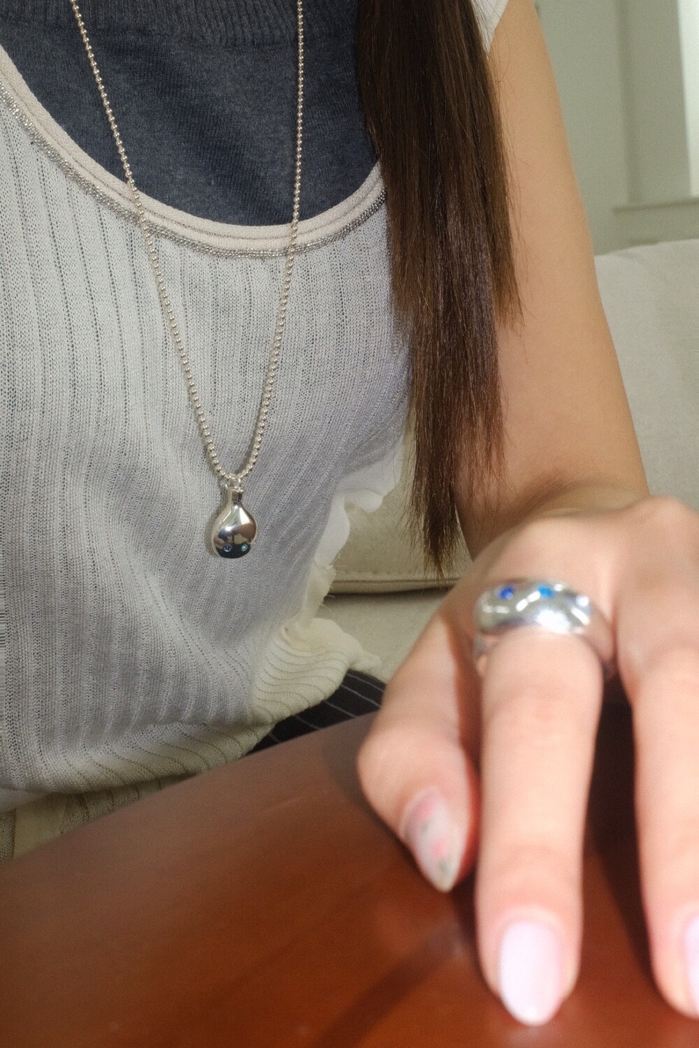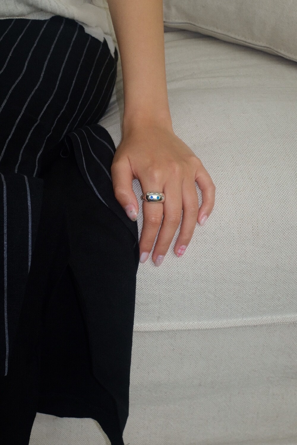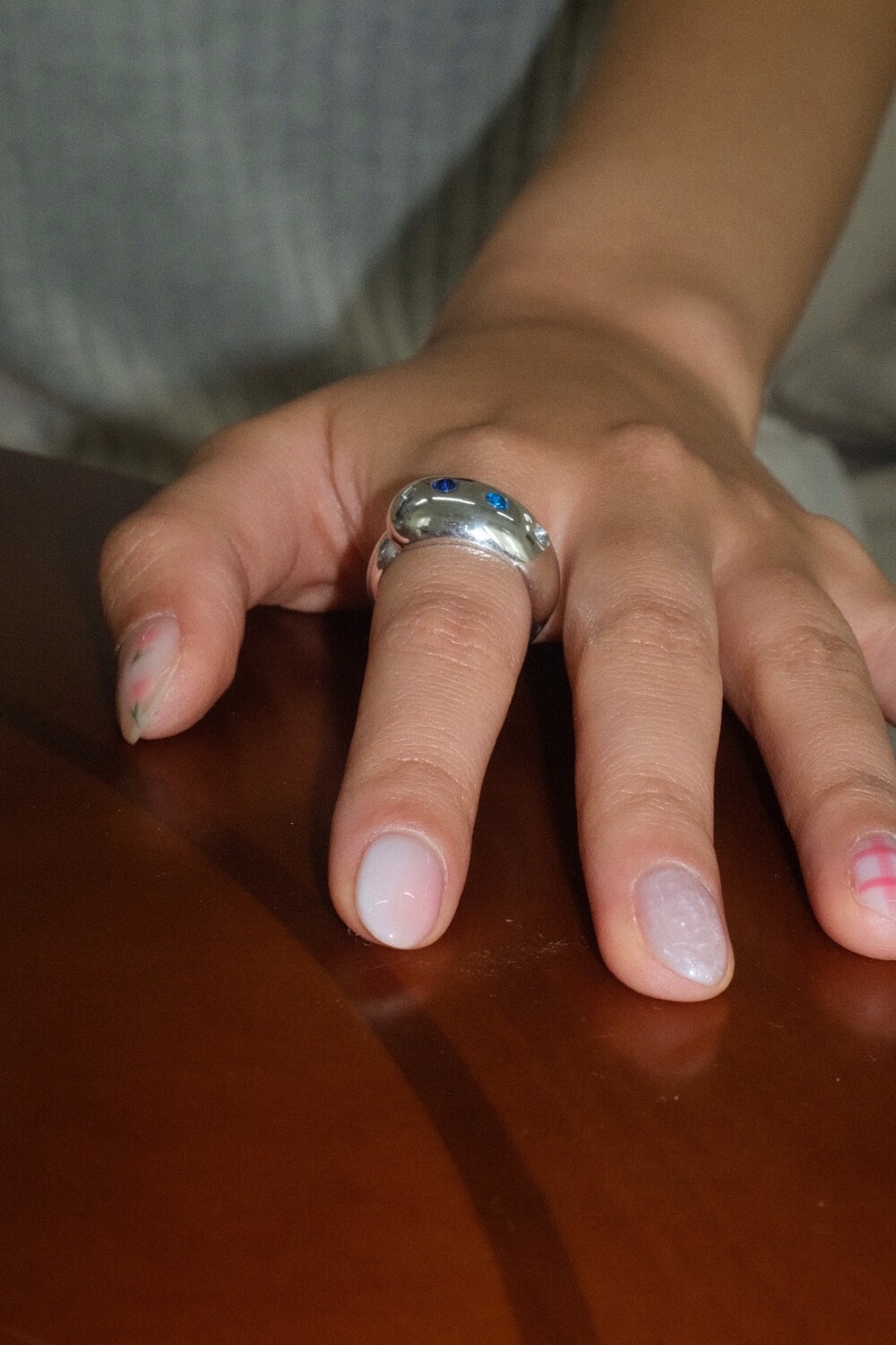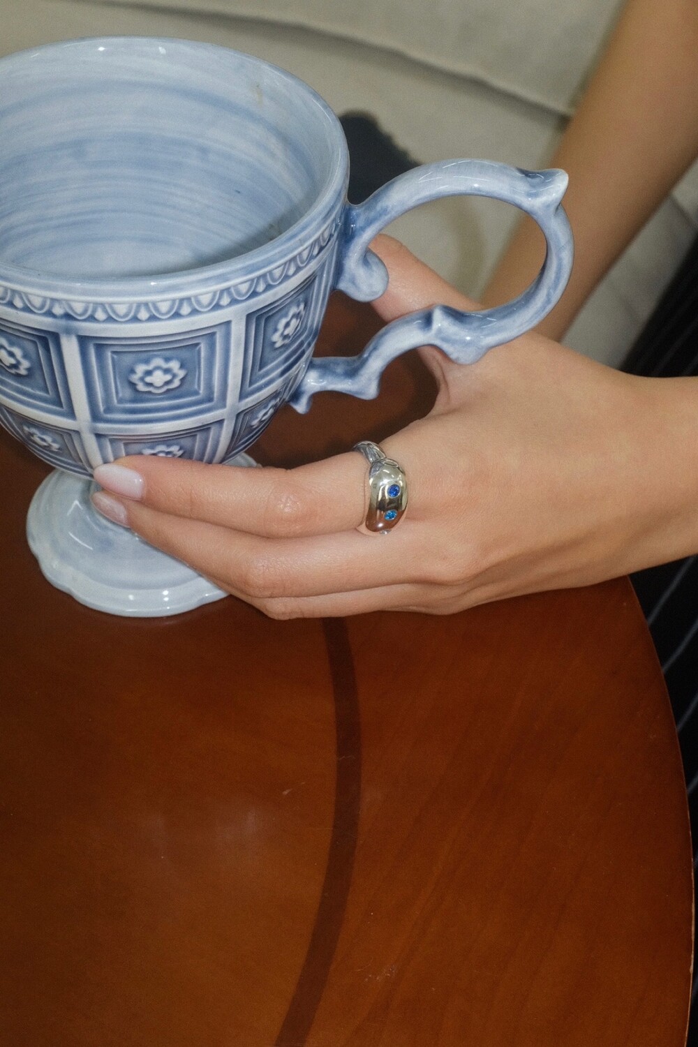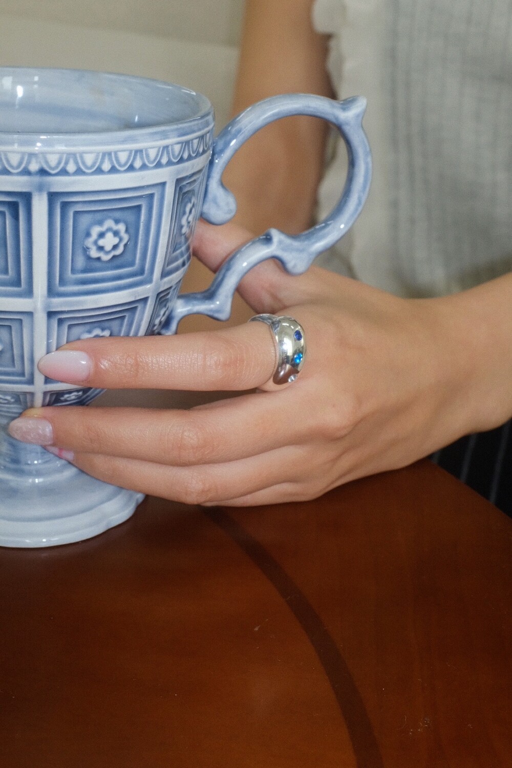 기존의 Volume ring을 볼드 한 버전으로 제작된 제품입니다. 심플한 실루엣이지만 통과된듯한 디테일과 3가지 톤의 블루 색상 큐빅으로 포인트가 추가되었습니다.