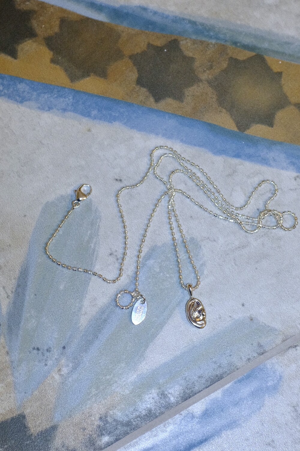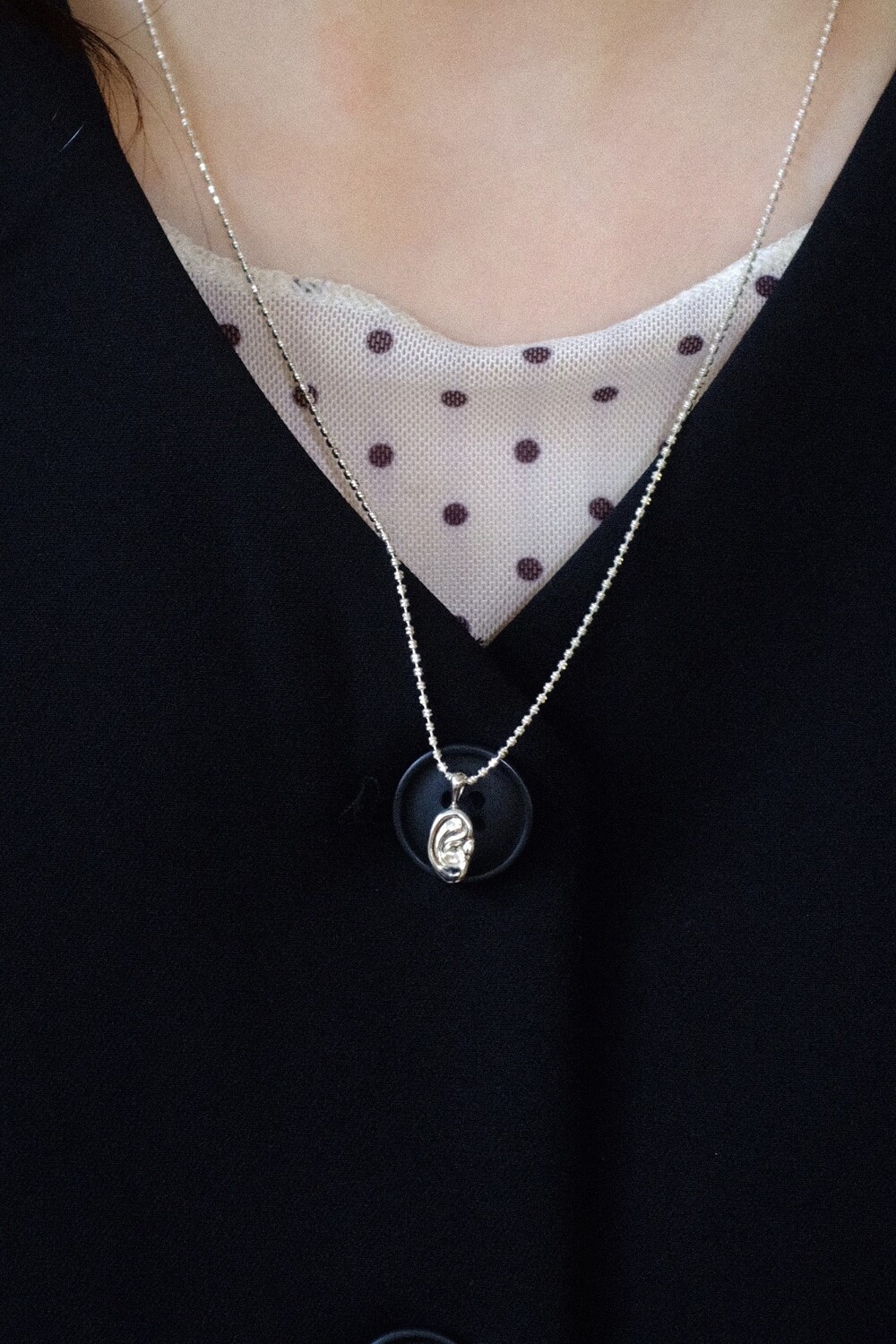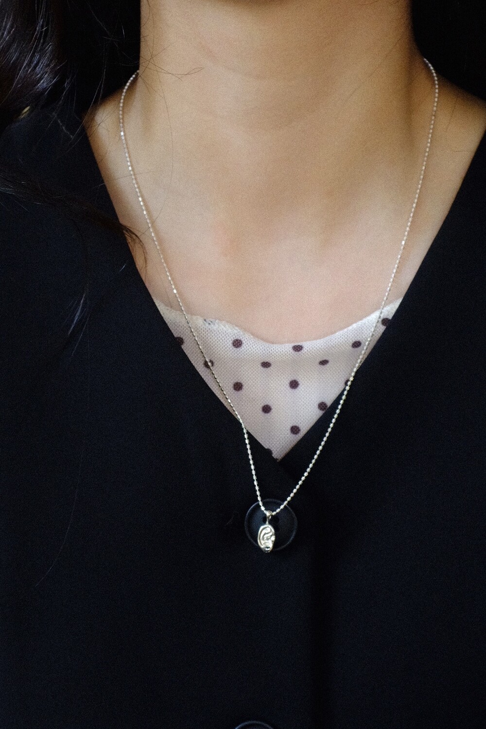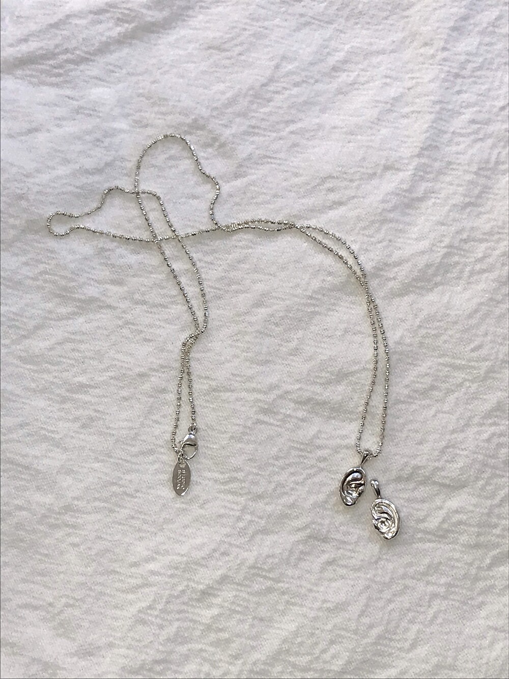 귀 모양을 형상화한 펜던트 디자인의 목걸이 입니다. 납작한 두개의 볼이 합쳐진 듯한 특별한 모양의 이태리 체인과 함께 데일리로 착용하기 좋은 사이즈의 제품입니다.