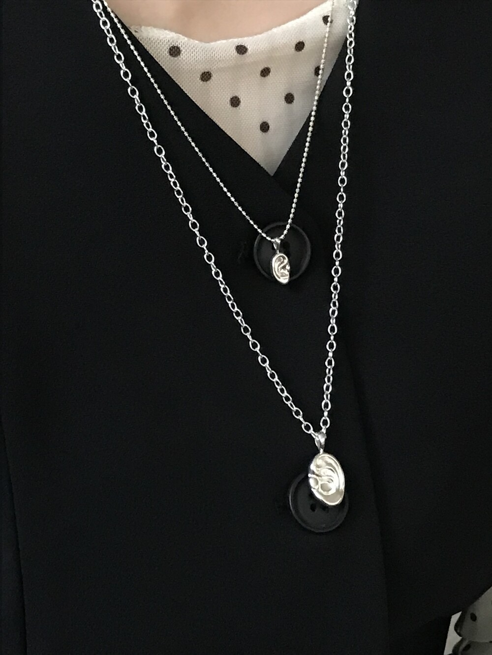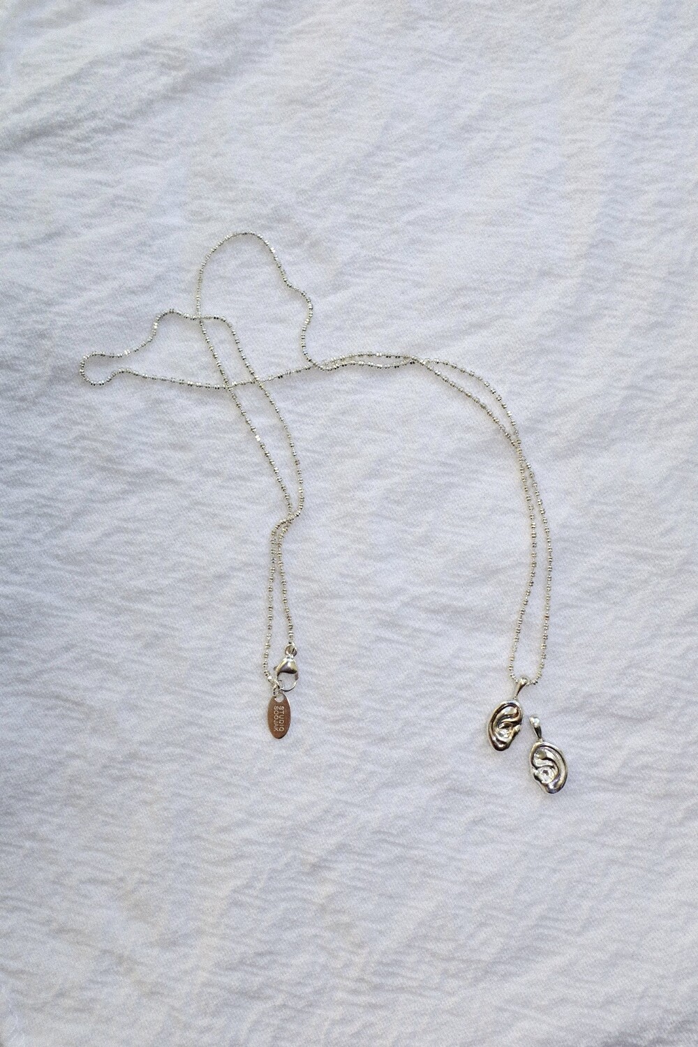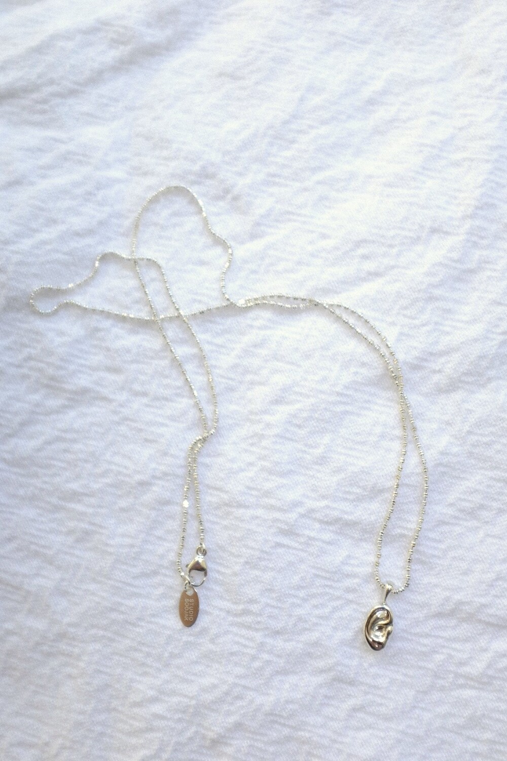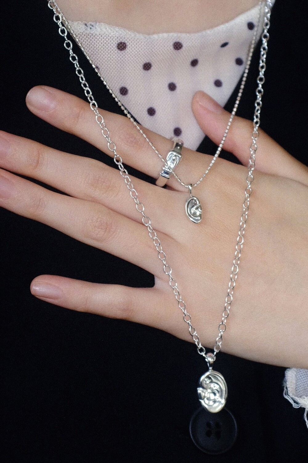 귀 모양을 형상화한 펜던트 디자인의 목걸이 입니다. 납작한 두개의 볼이 합쳐진 듯한 특별한 모양의 이태리 체인과 함께 데일리로 착용하기 좋은 사이즈의 제품입니다.