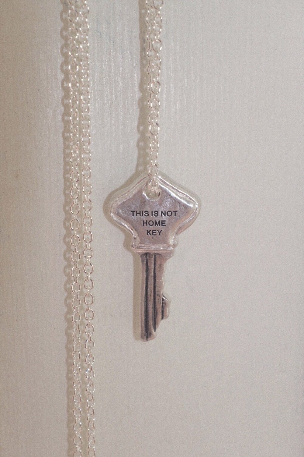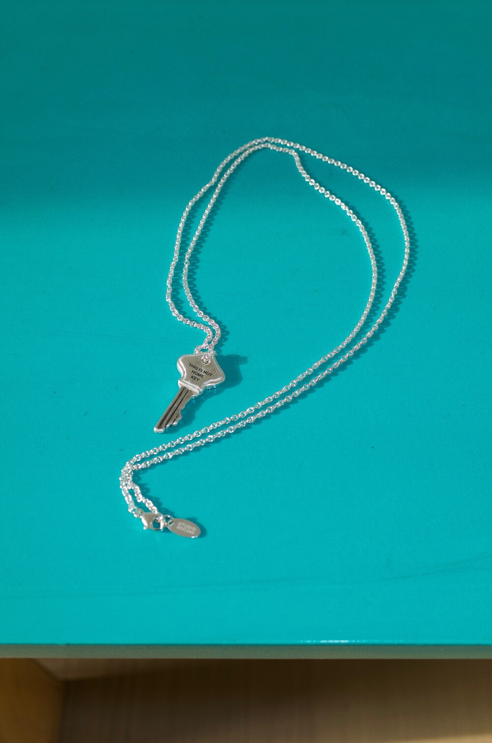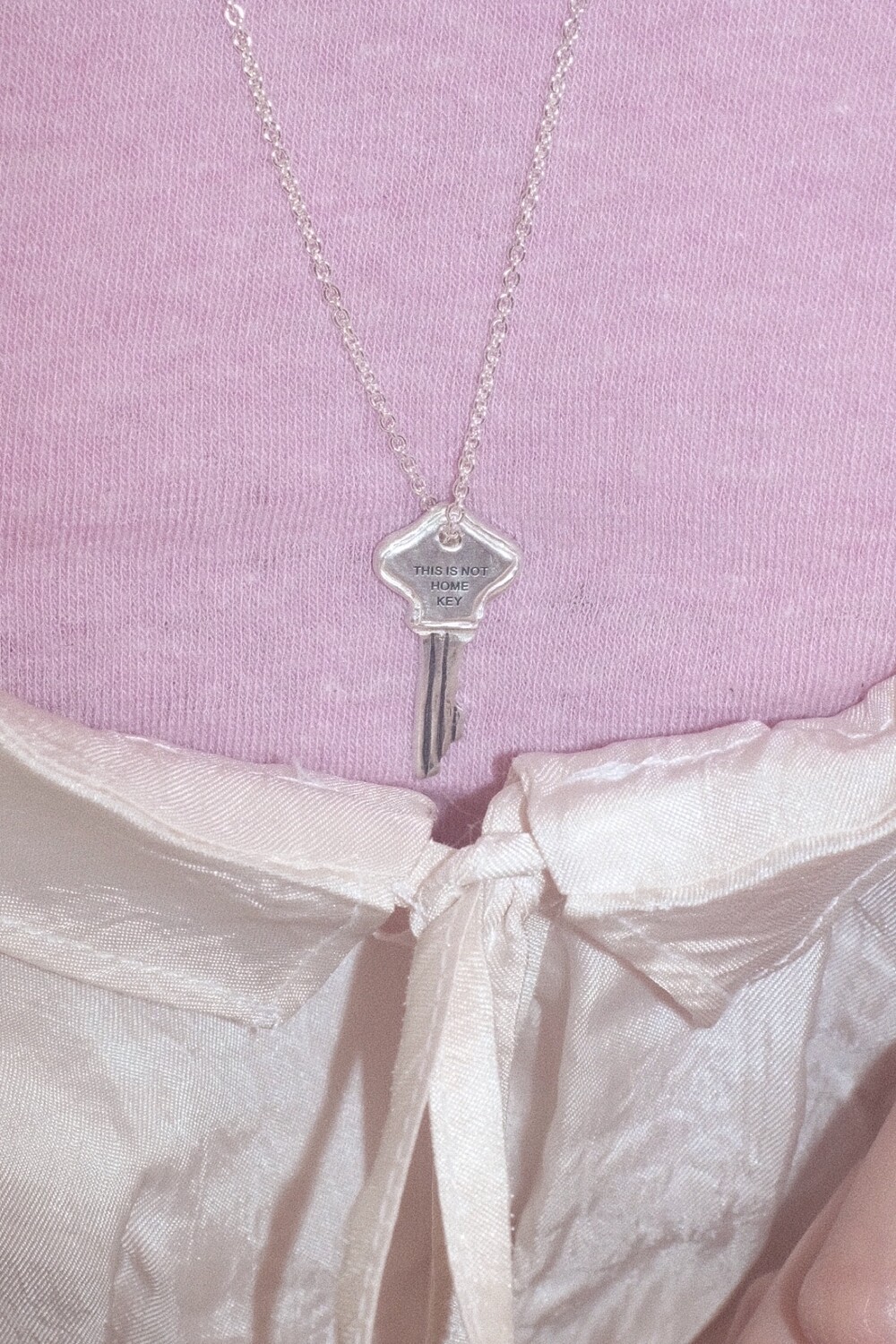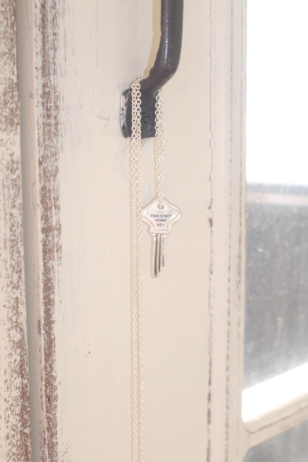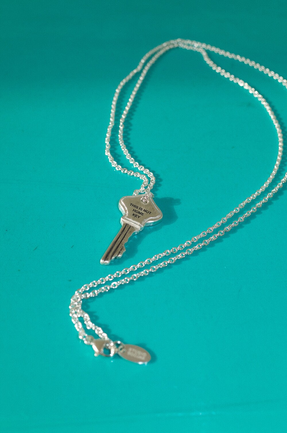 레터링이 각인되어 있는 러프한 마무리감의 롱 네크리스 입니다.