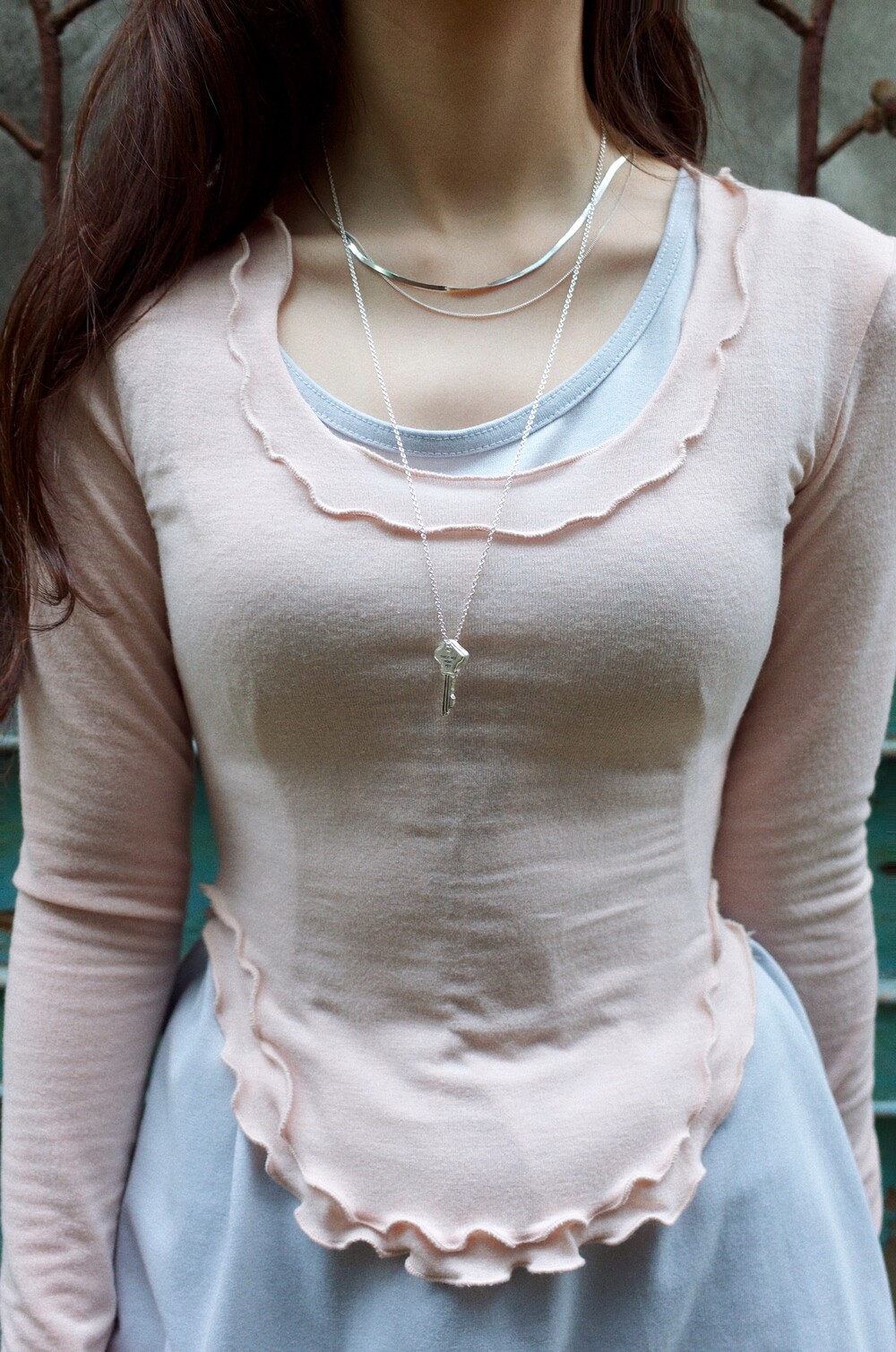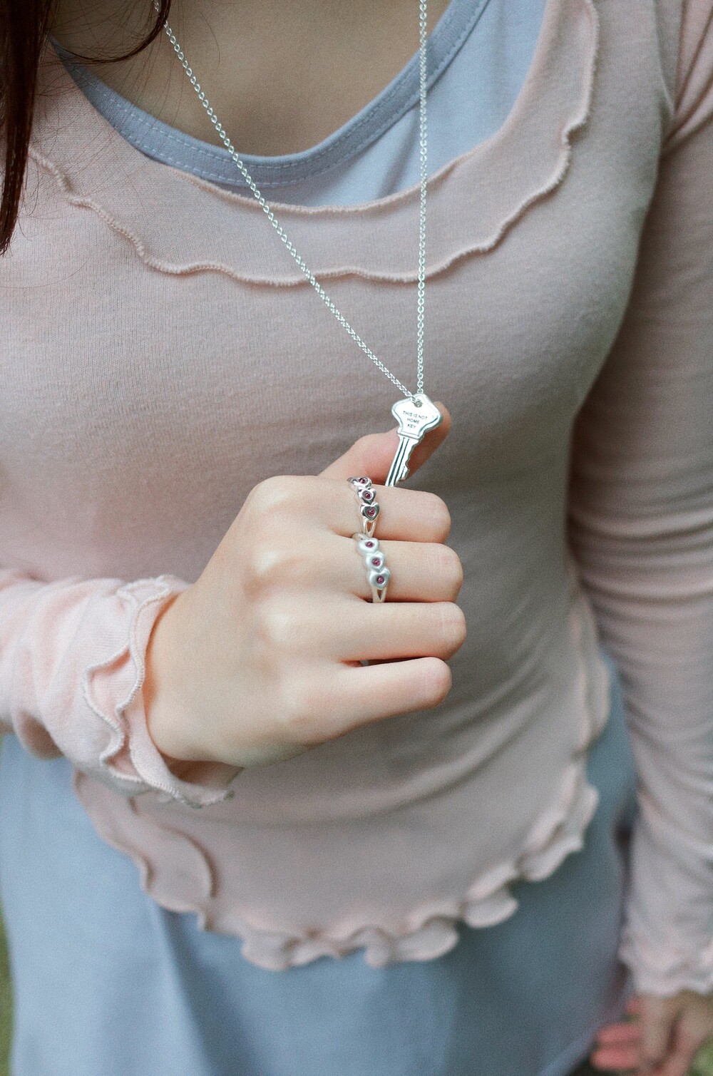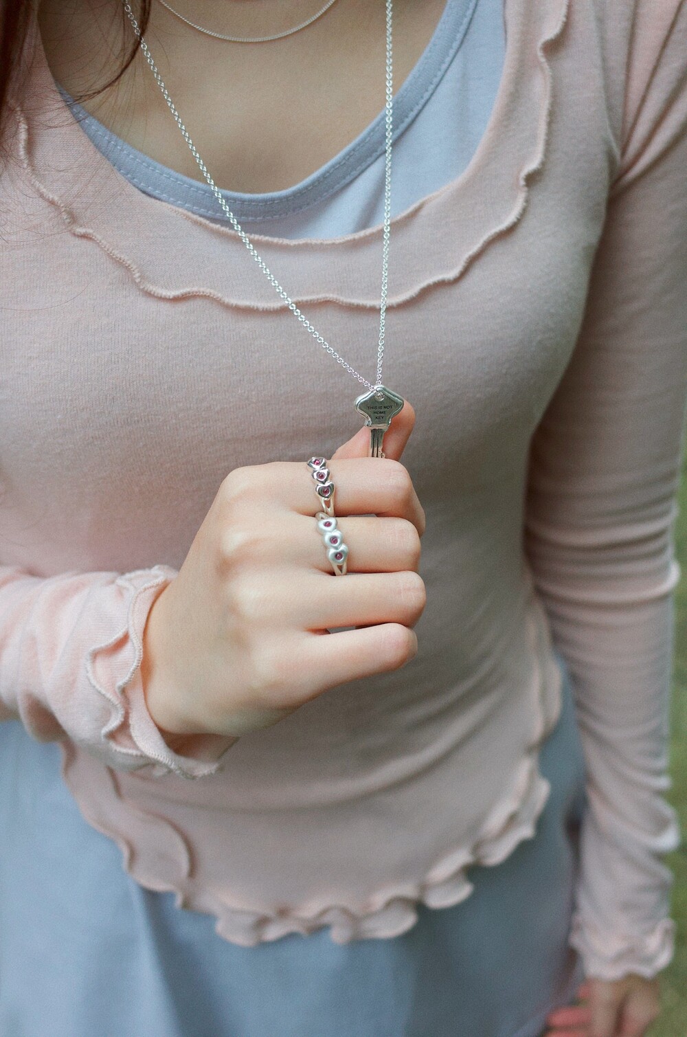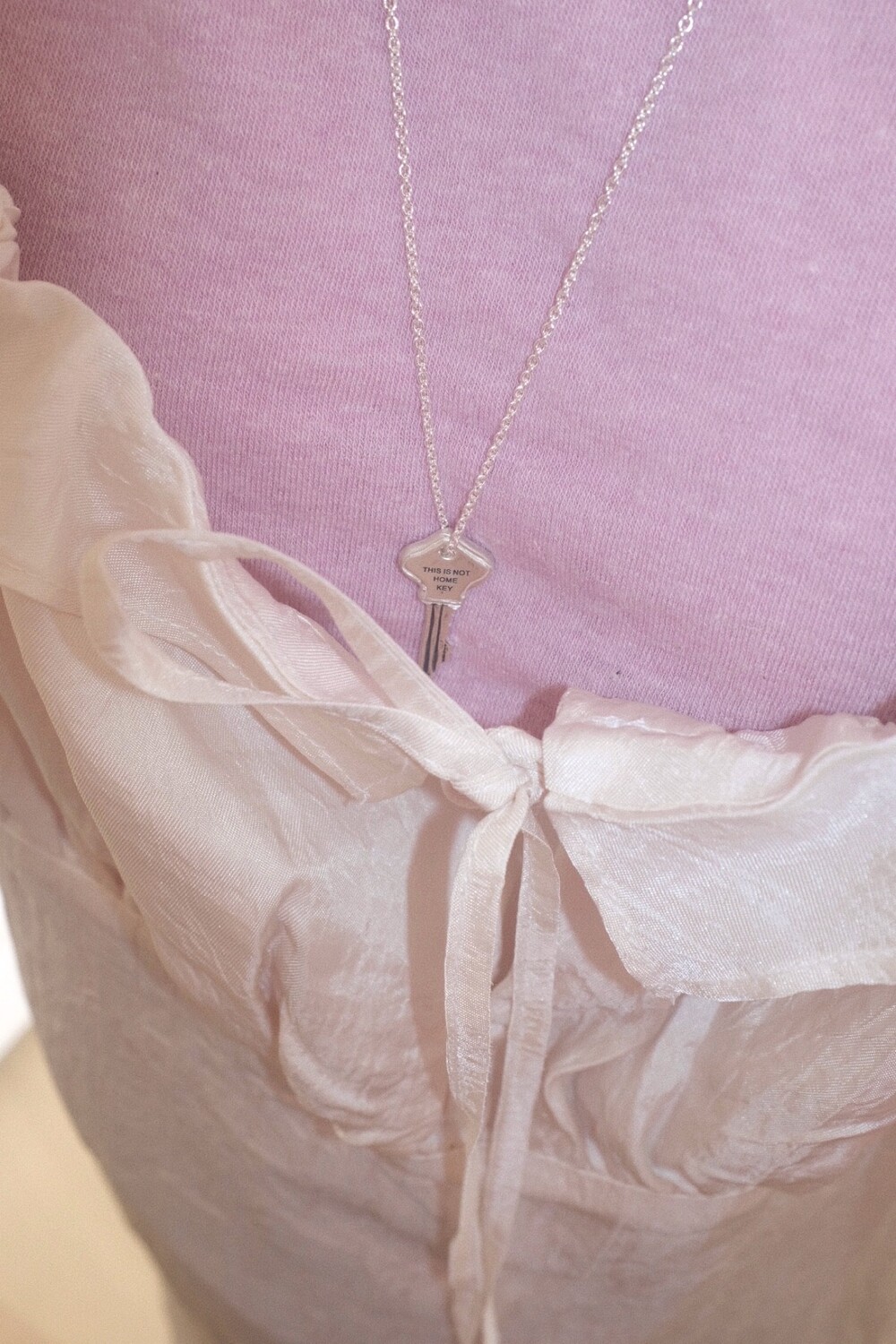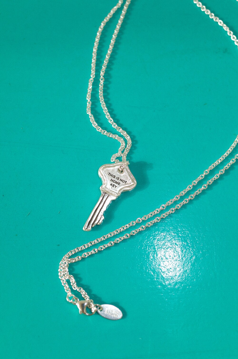 레터링이 각인되어 있는 러프한 마무리감의 롱 네크리스 입니다.