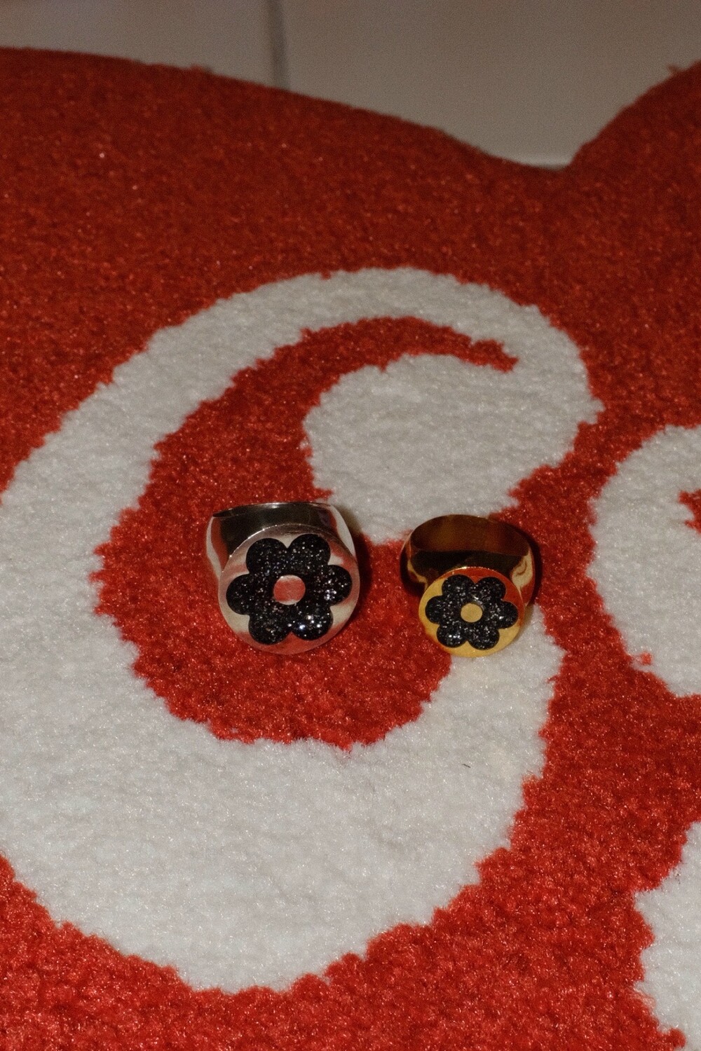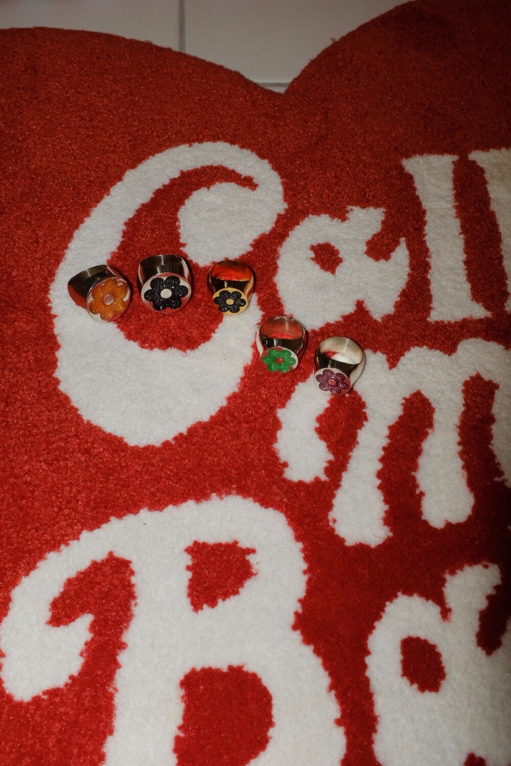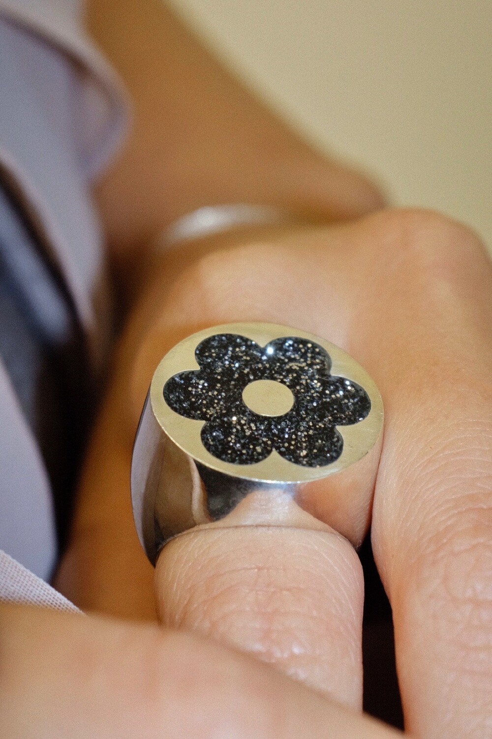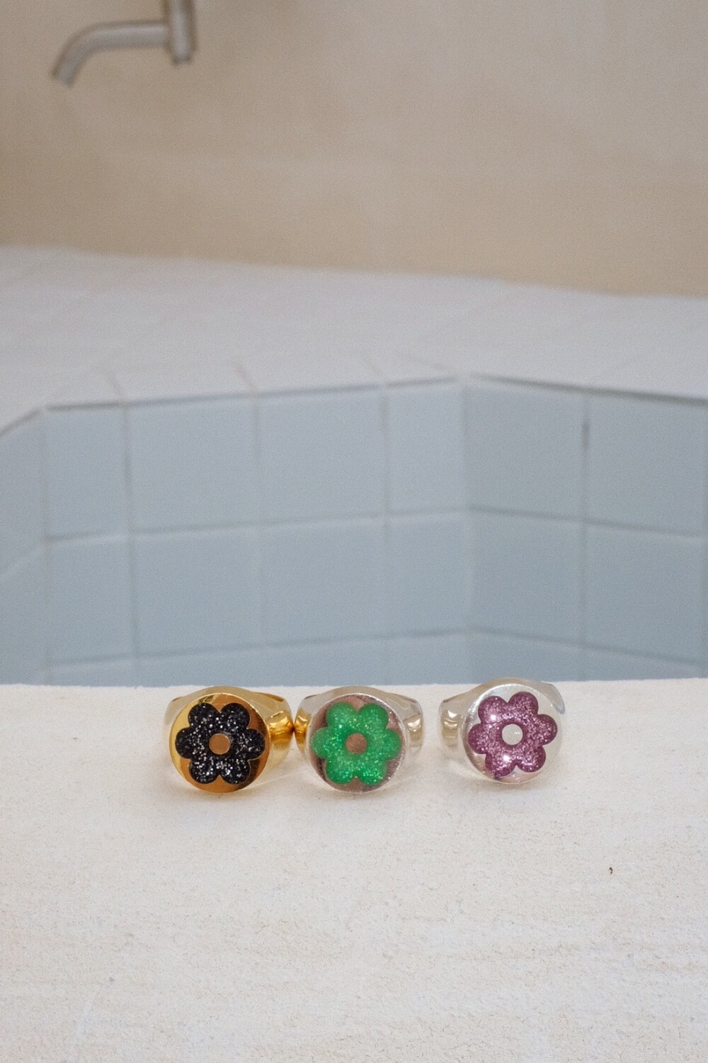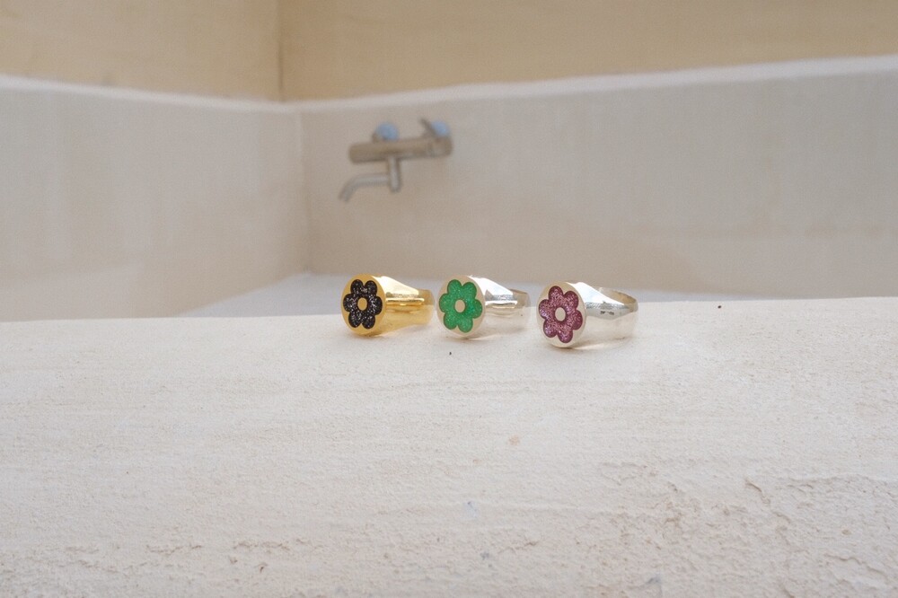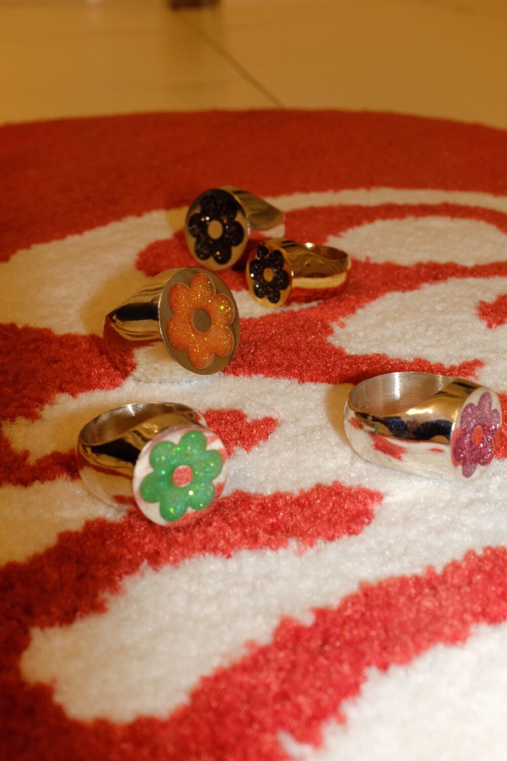 반짝이는 글리터가 가득 차있는 꽃이 포인트인 키치한 무드의 반지입니다 ⯌⯌.