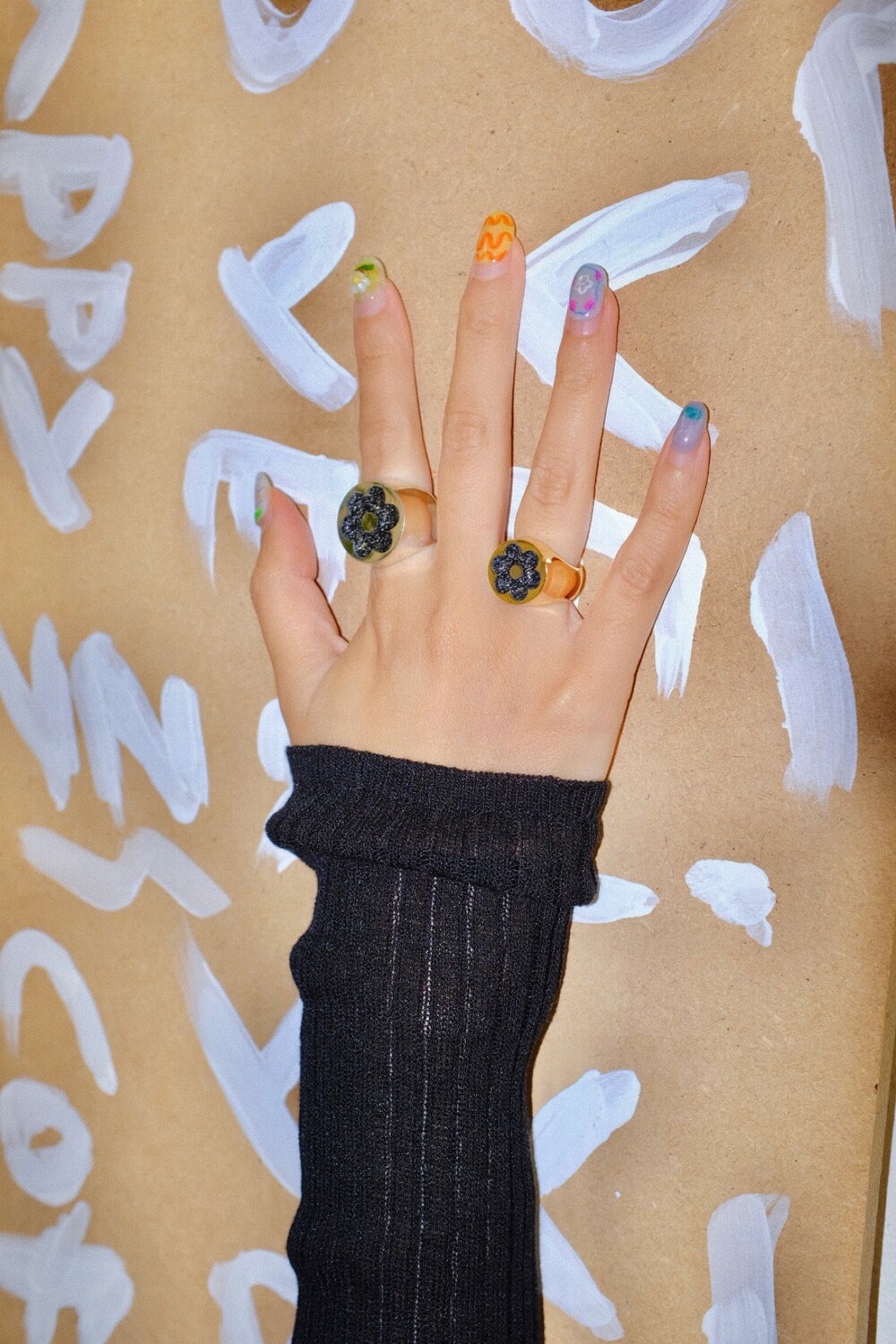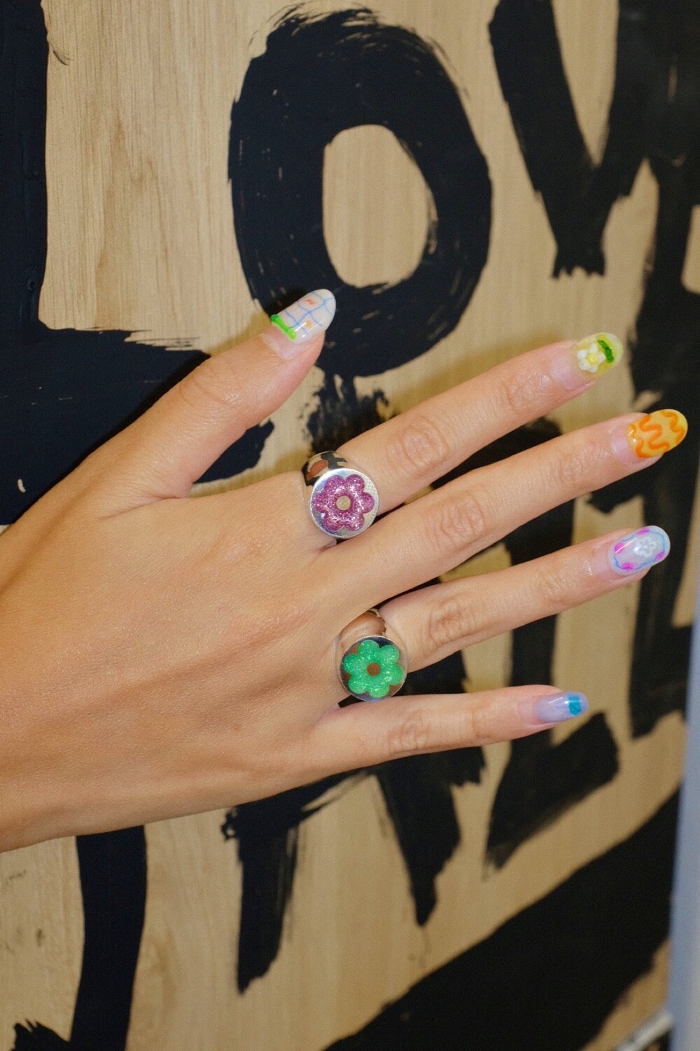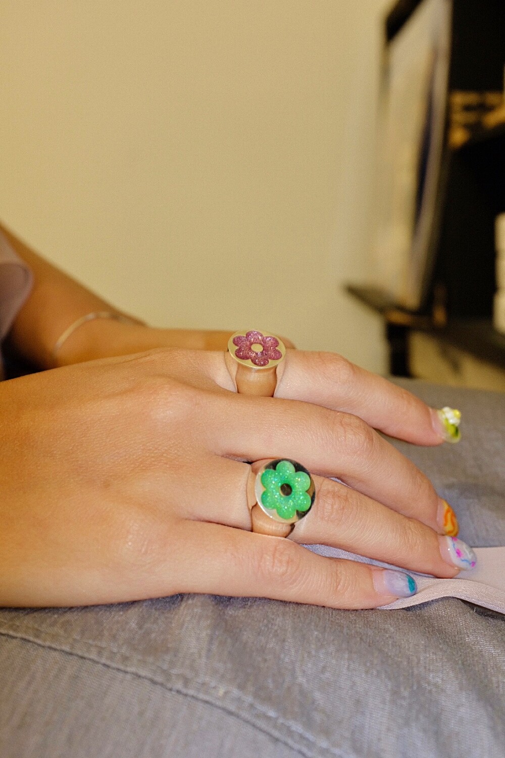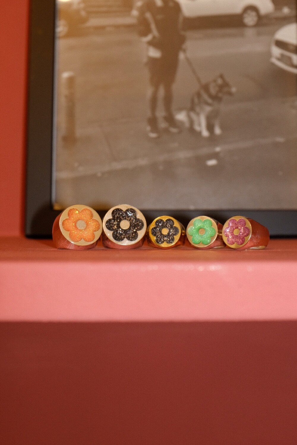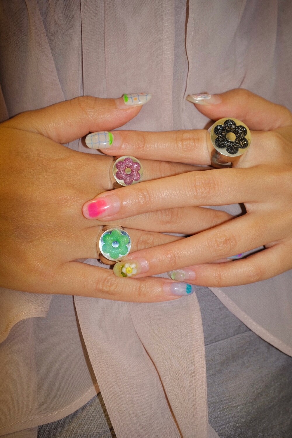 반짝이는 글리터가 가득 차있는 꽃이 포인트인 키치한 무드의 반지입니다 ⯌⯌.