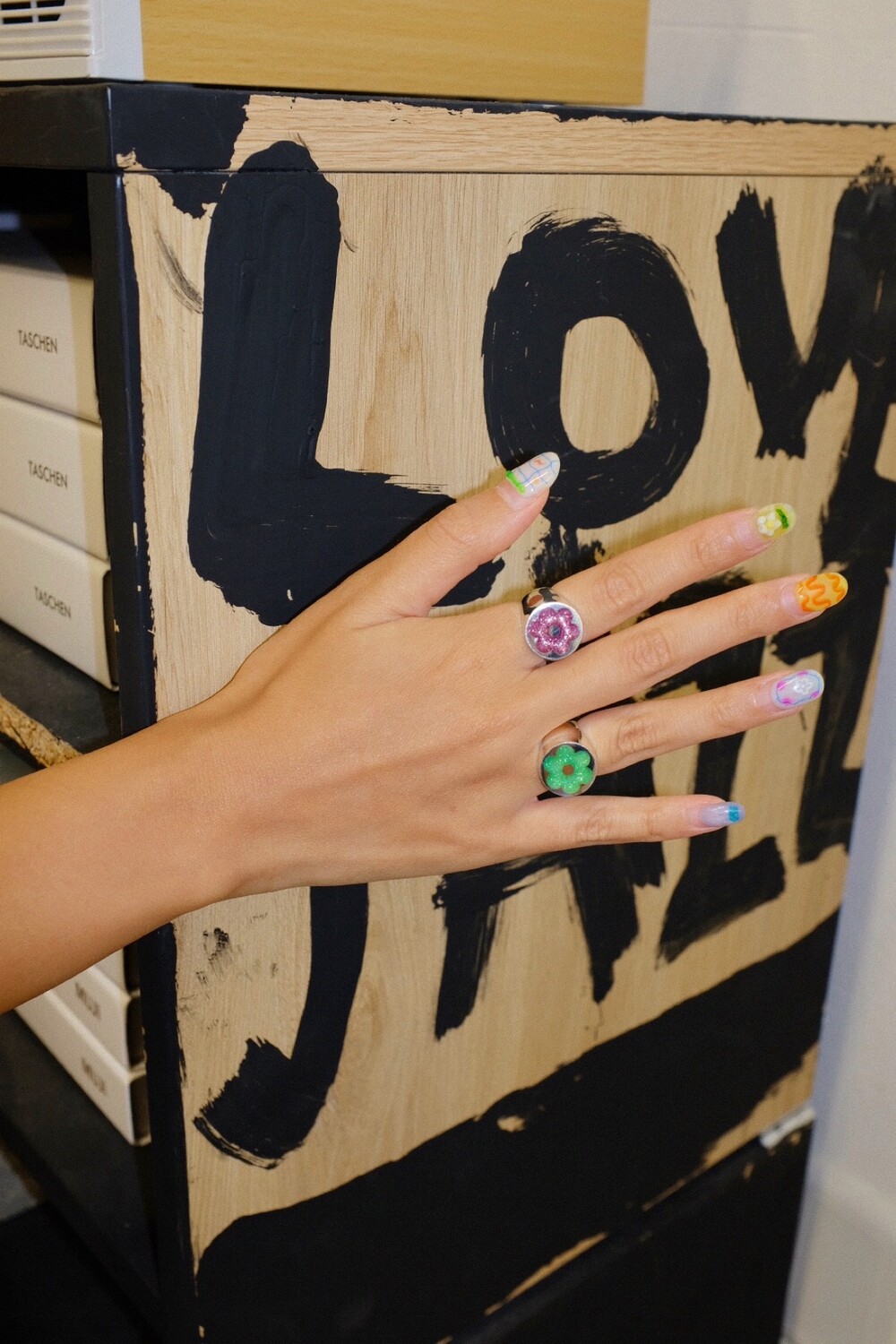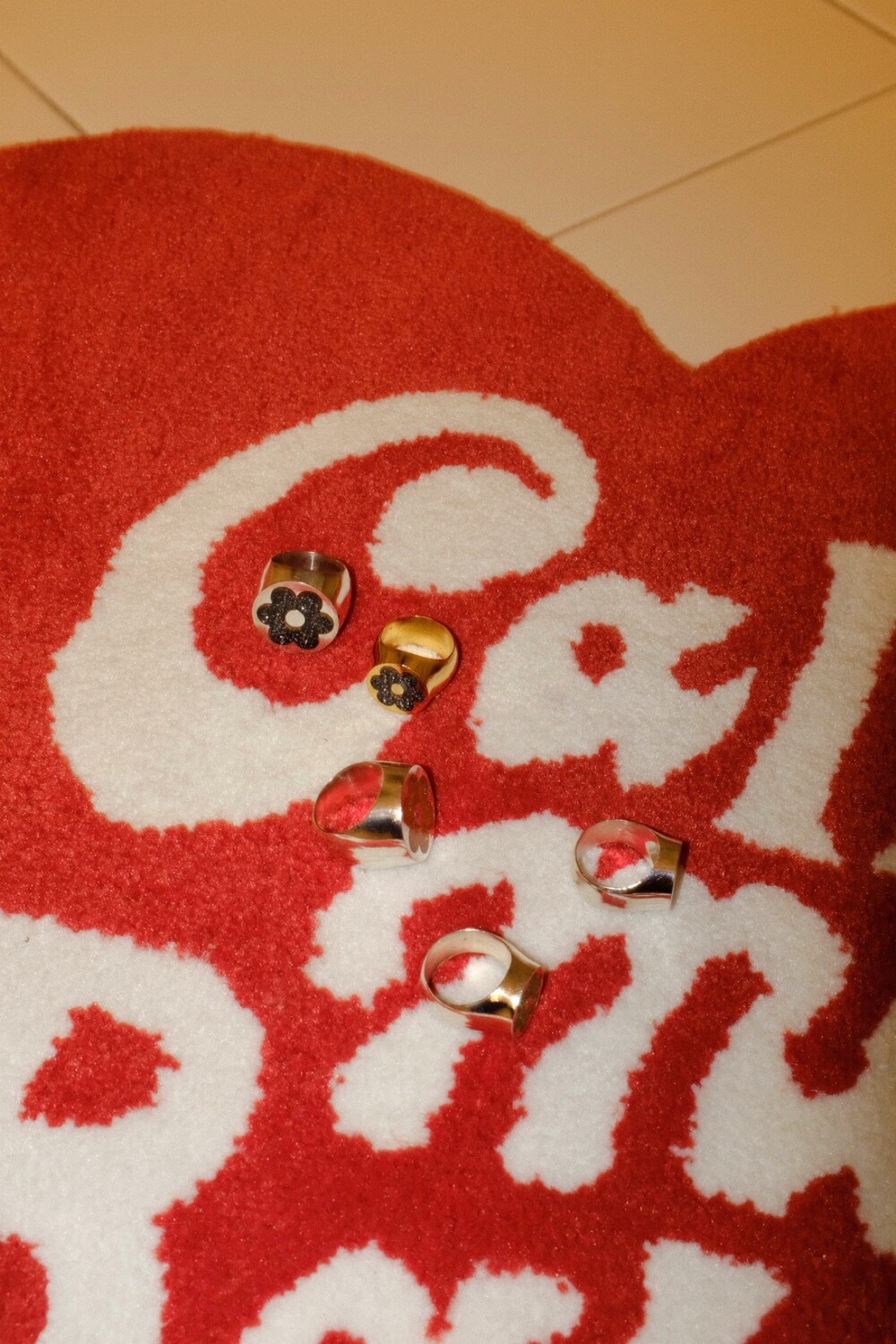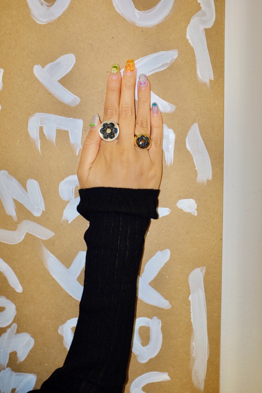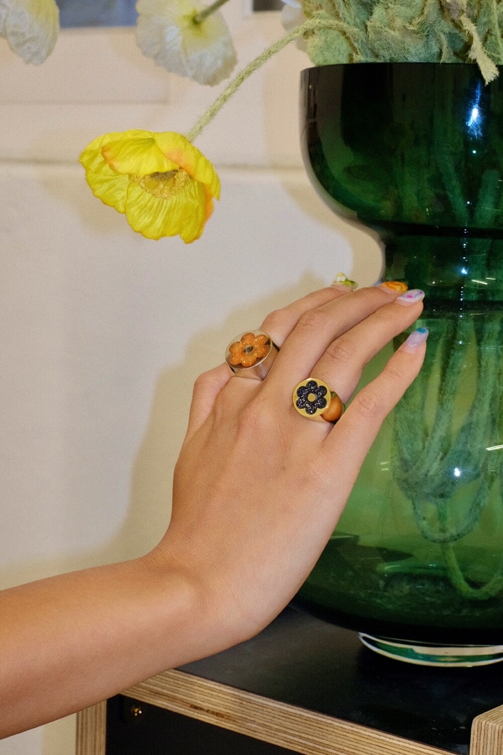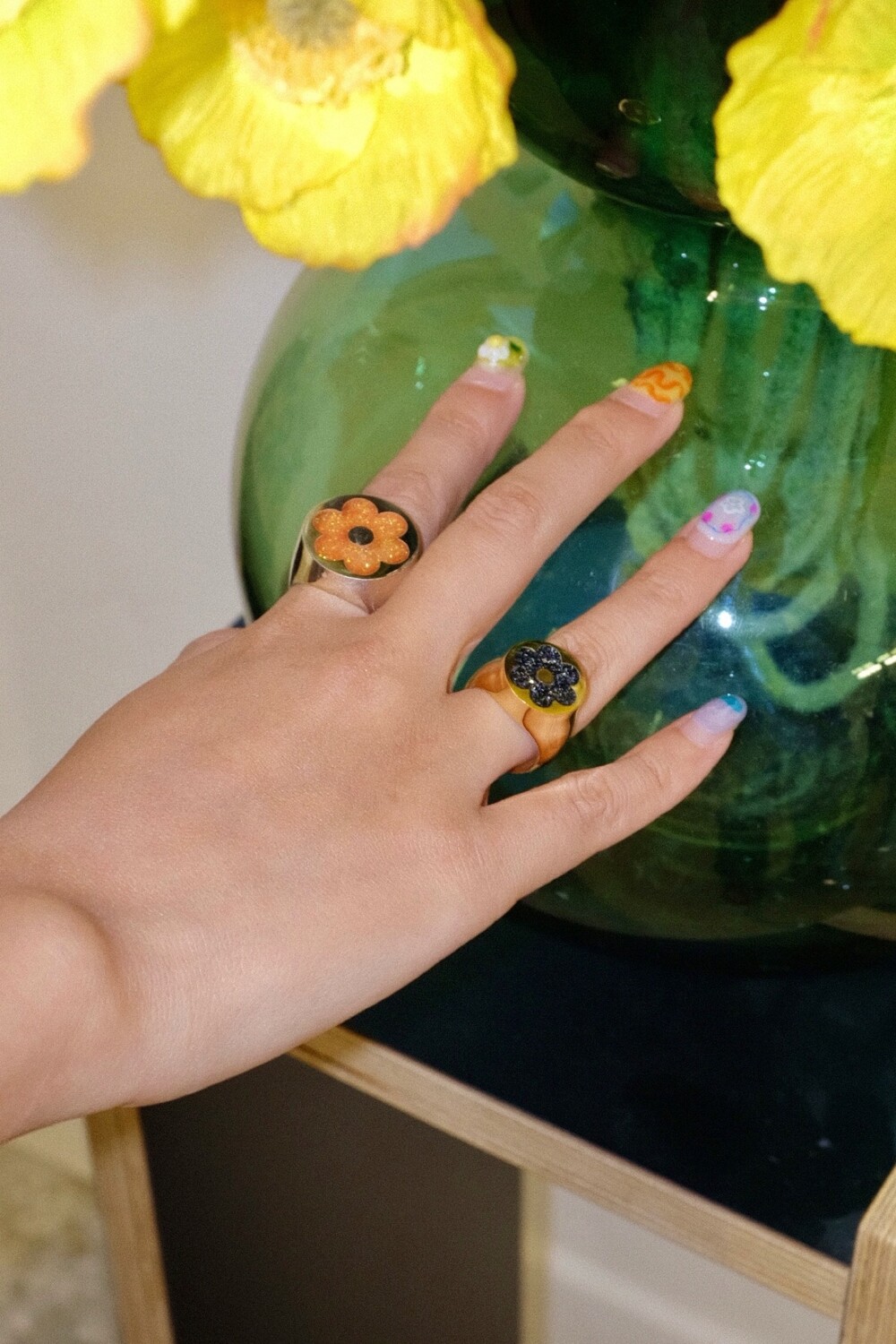 반짝이는 글리터가 가득 차있는 꽃이 포인트인 키치한 무드의 반지입니다 ⯌⯌.