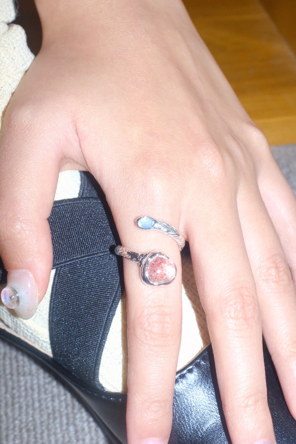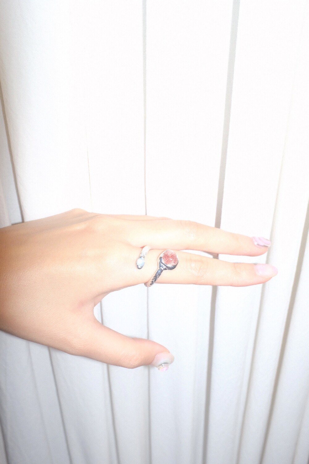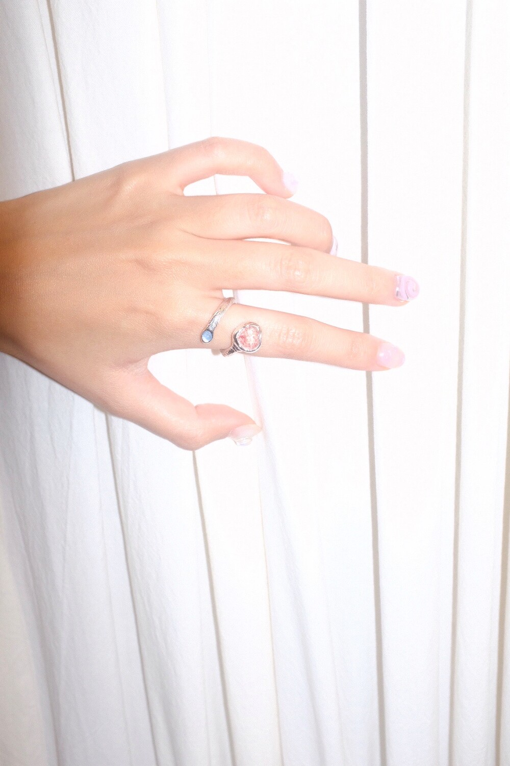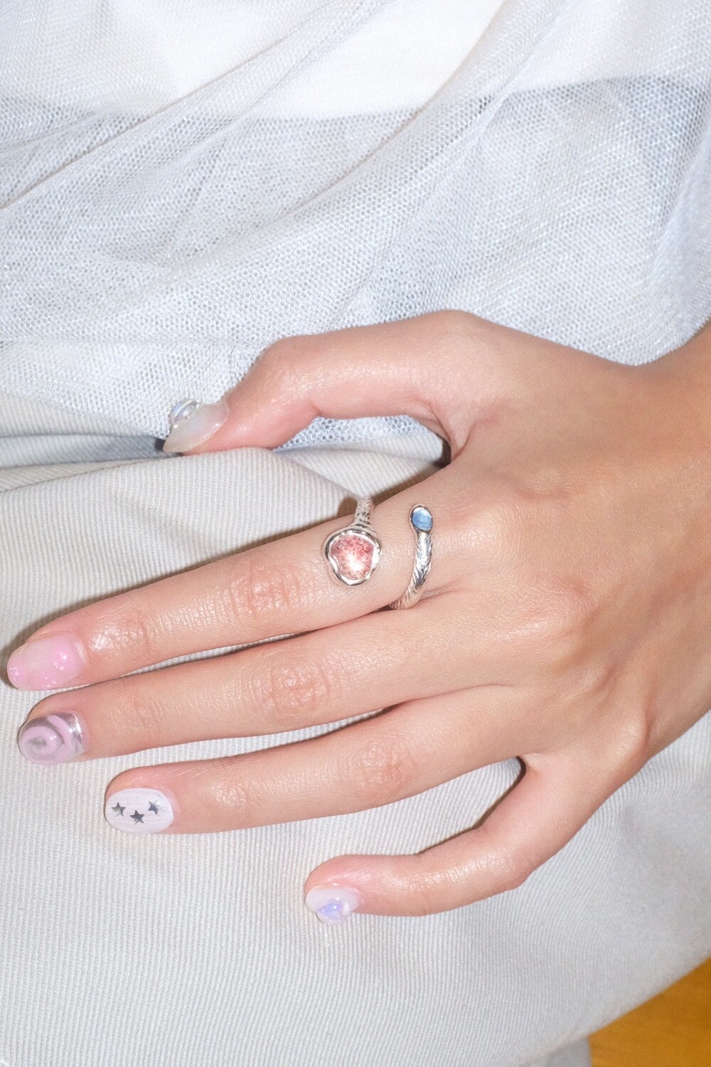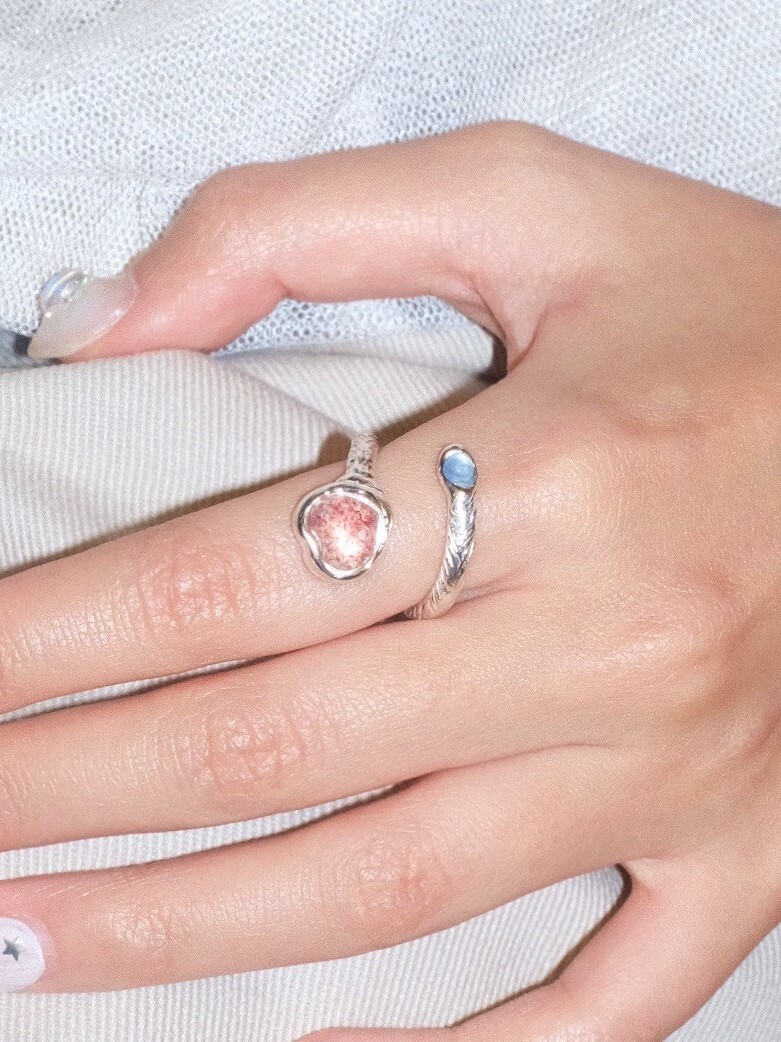 네추럴 하트 스트로베리쿼츠와 원형 블루 칼세도니가 세팅 된 오픈 링 입니다.