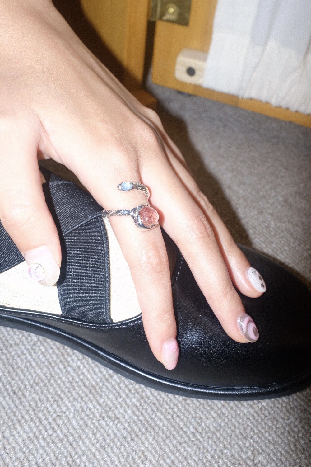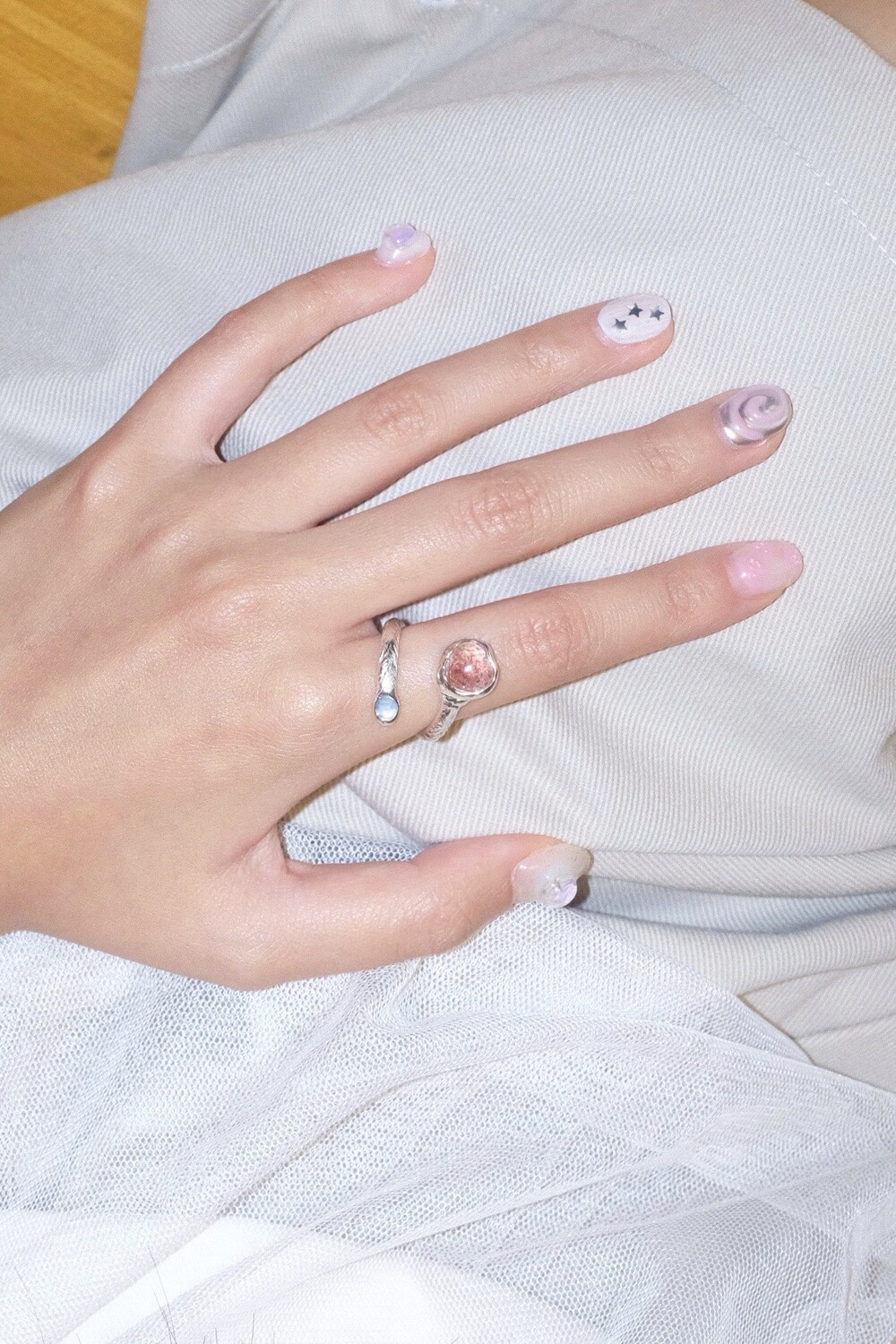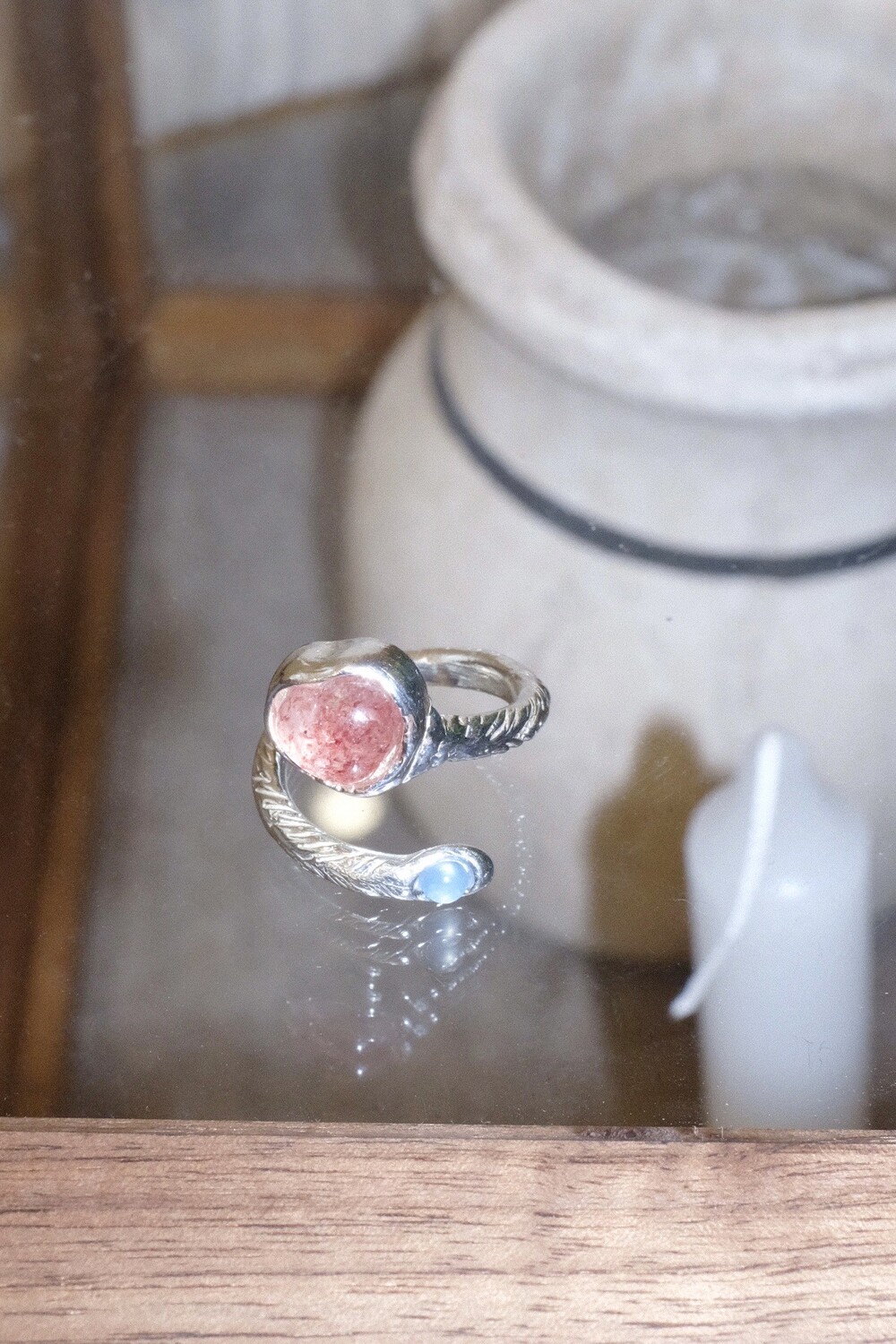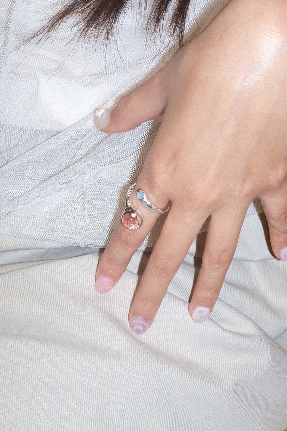 네추럴 하트 스트로베리쿼츠와 원형 블루 칼세도니가 세팅 된 오픈 링 입니다.