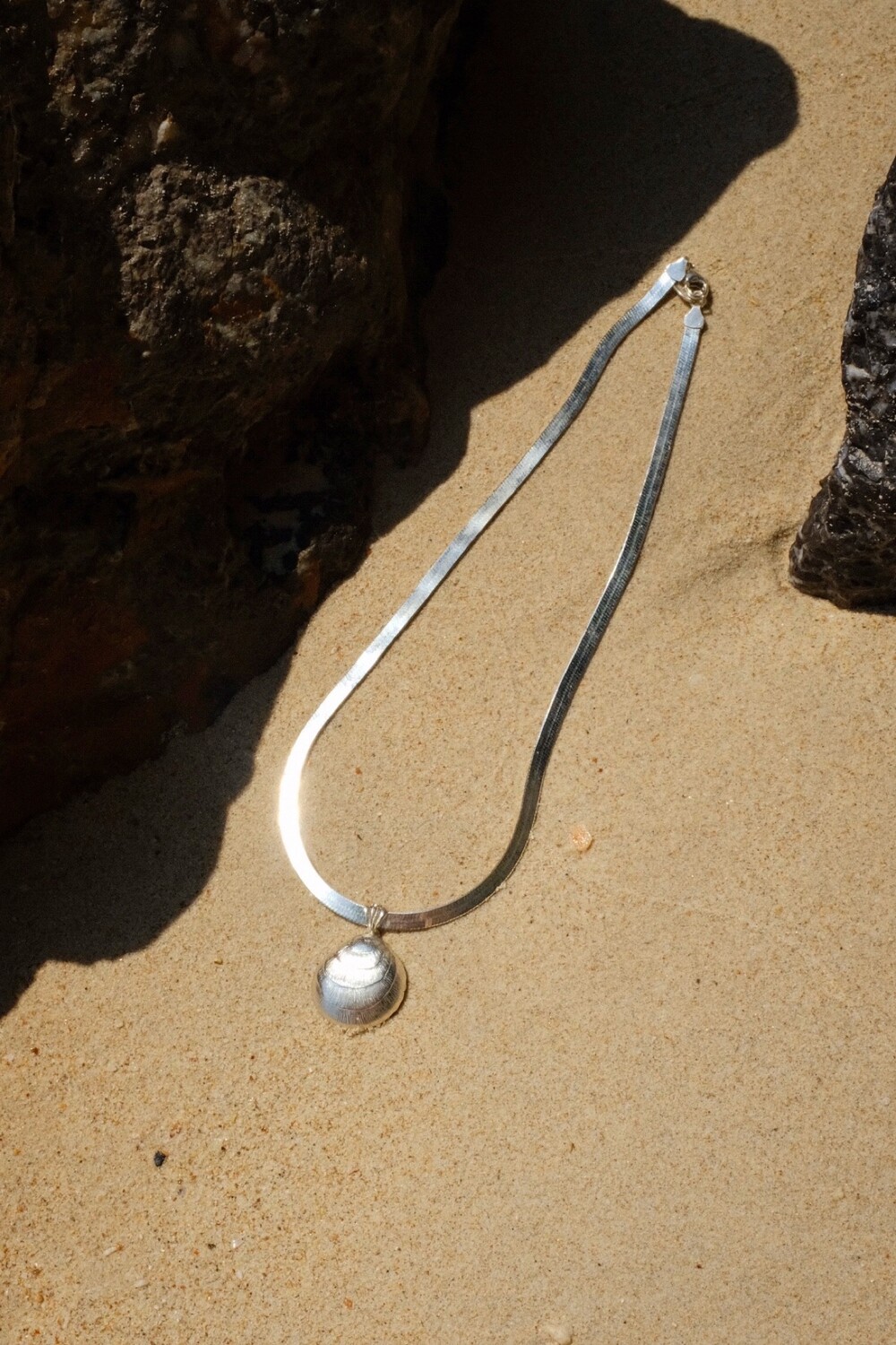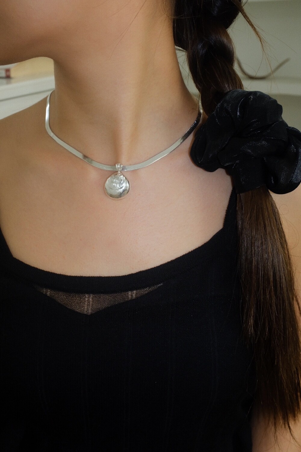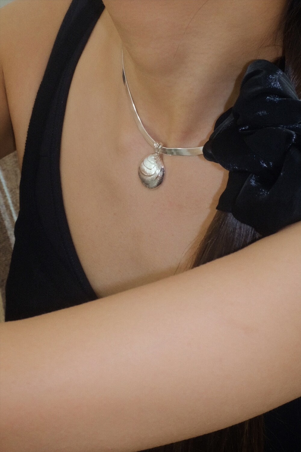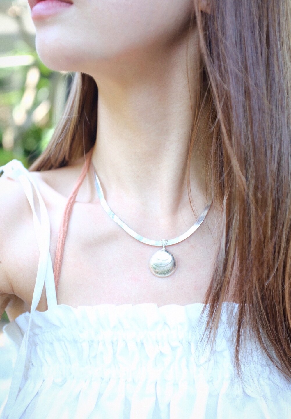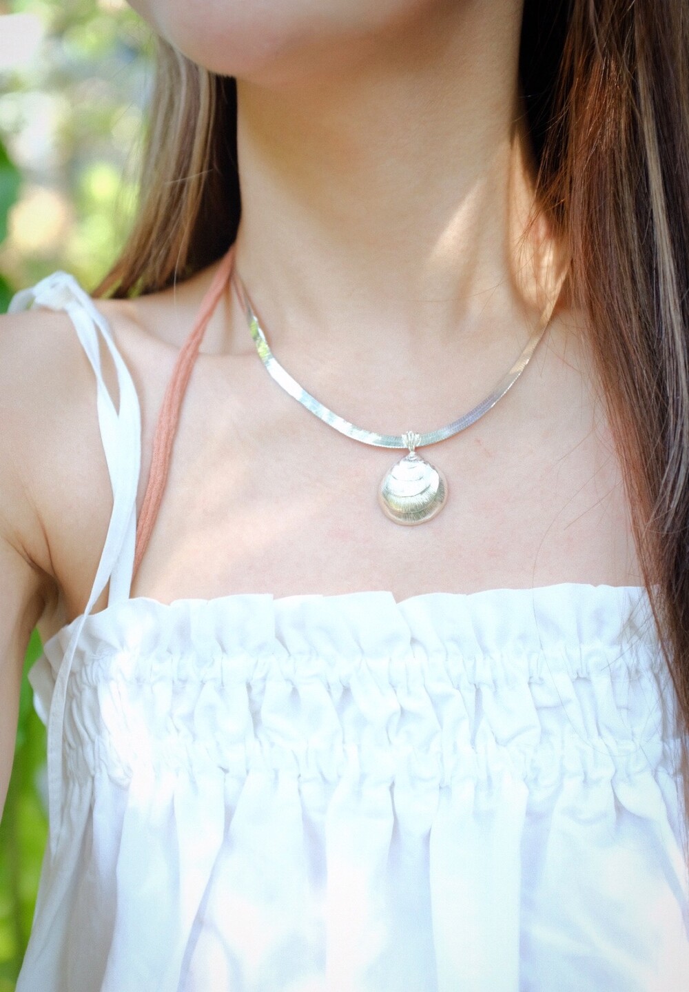 발리 바닷가에서 주운 조개껍데기 모양 그대로 깎아 제작된 제품입니다. 4mm 스네이크 줄이 네크라인에 우아하게 떨어지기 때문에 드레시한 착장이나 스윔웨어 어디든 잘 어우러질 수 있는 제품입니다.