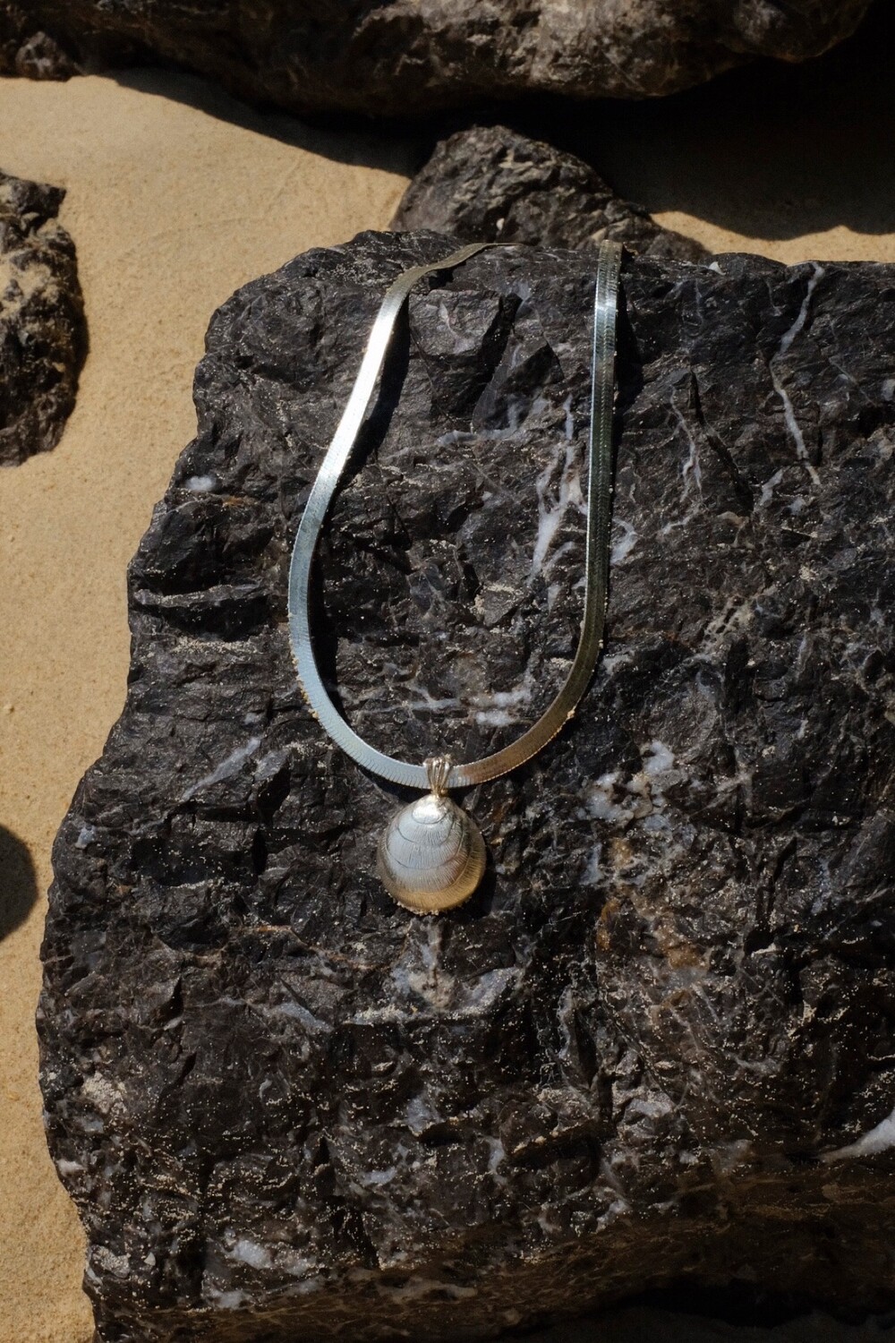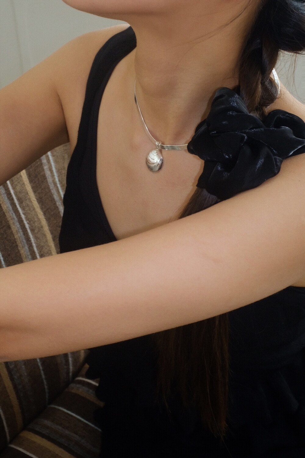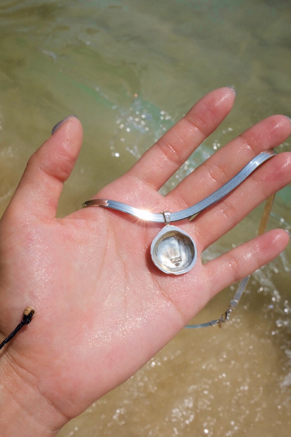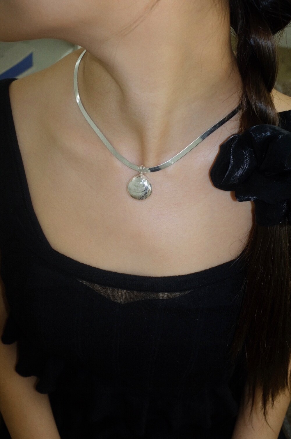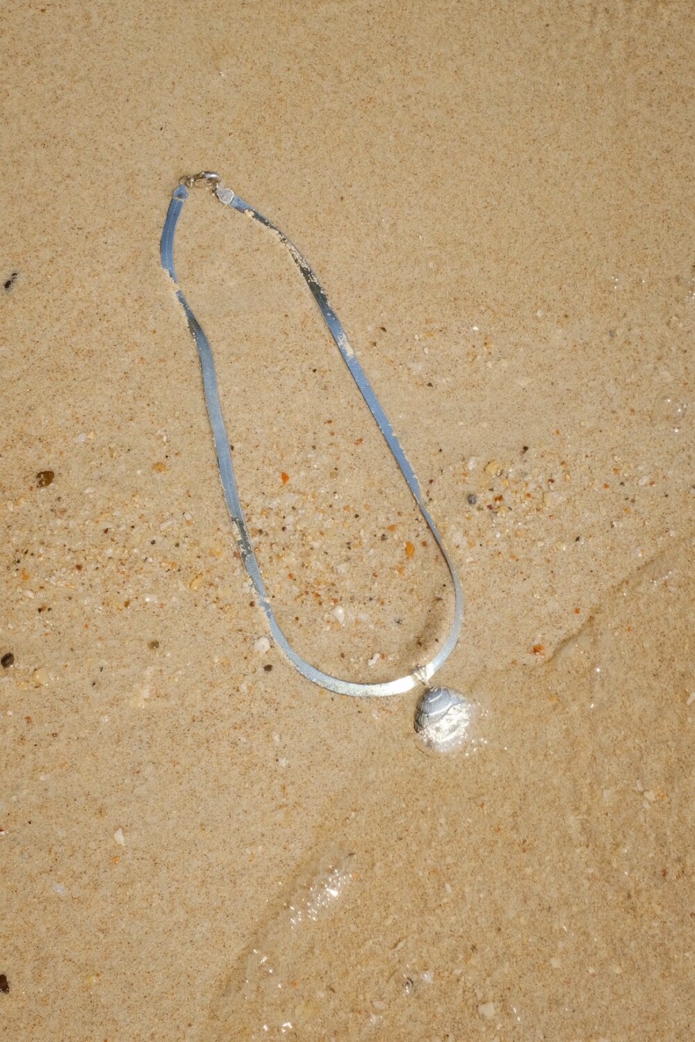 발리 바닷가에서 주운 조개껍데기 모양 그대로 깎아 제작된 제품입니다. 4mm 스네이크 줄이 네크라인에 우아하게 떨어지기 때문에 드레시한 착장이나 스윔웨어 어디든 잘 어우러질 수 있는 제품입니다.