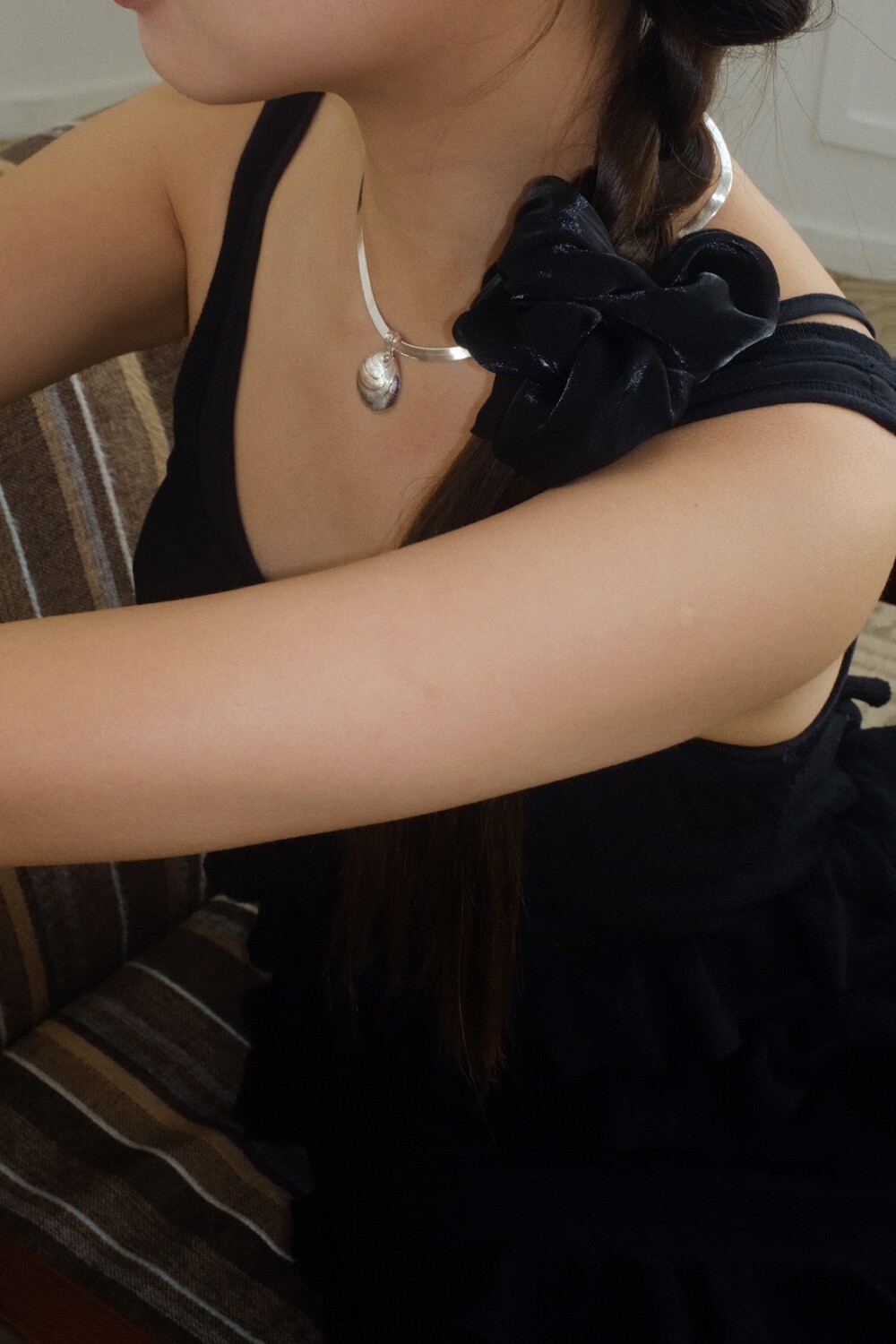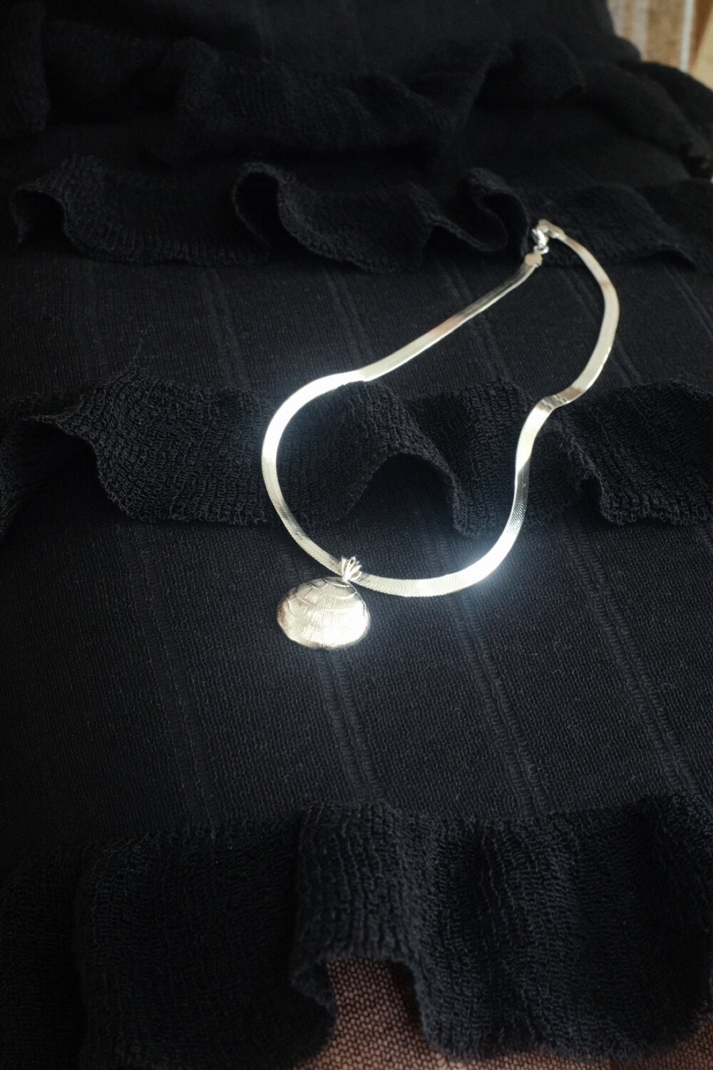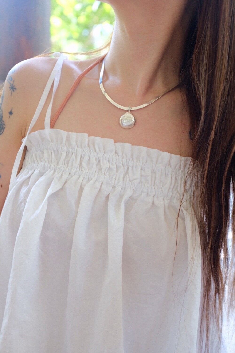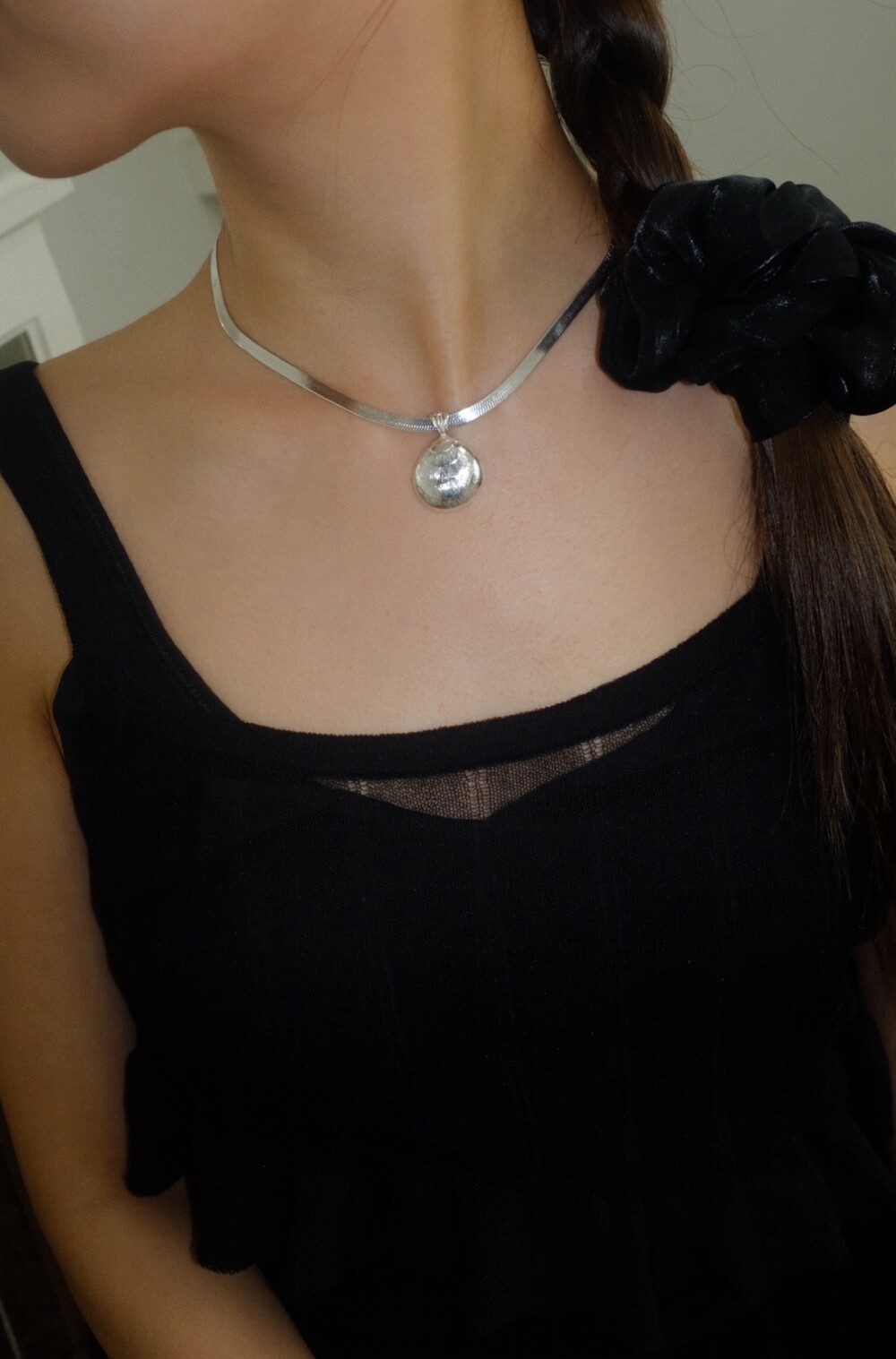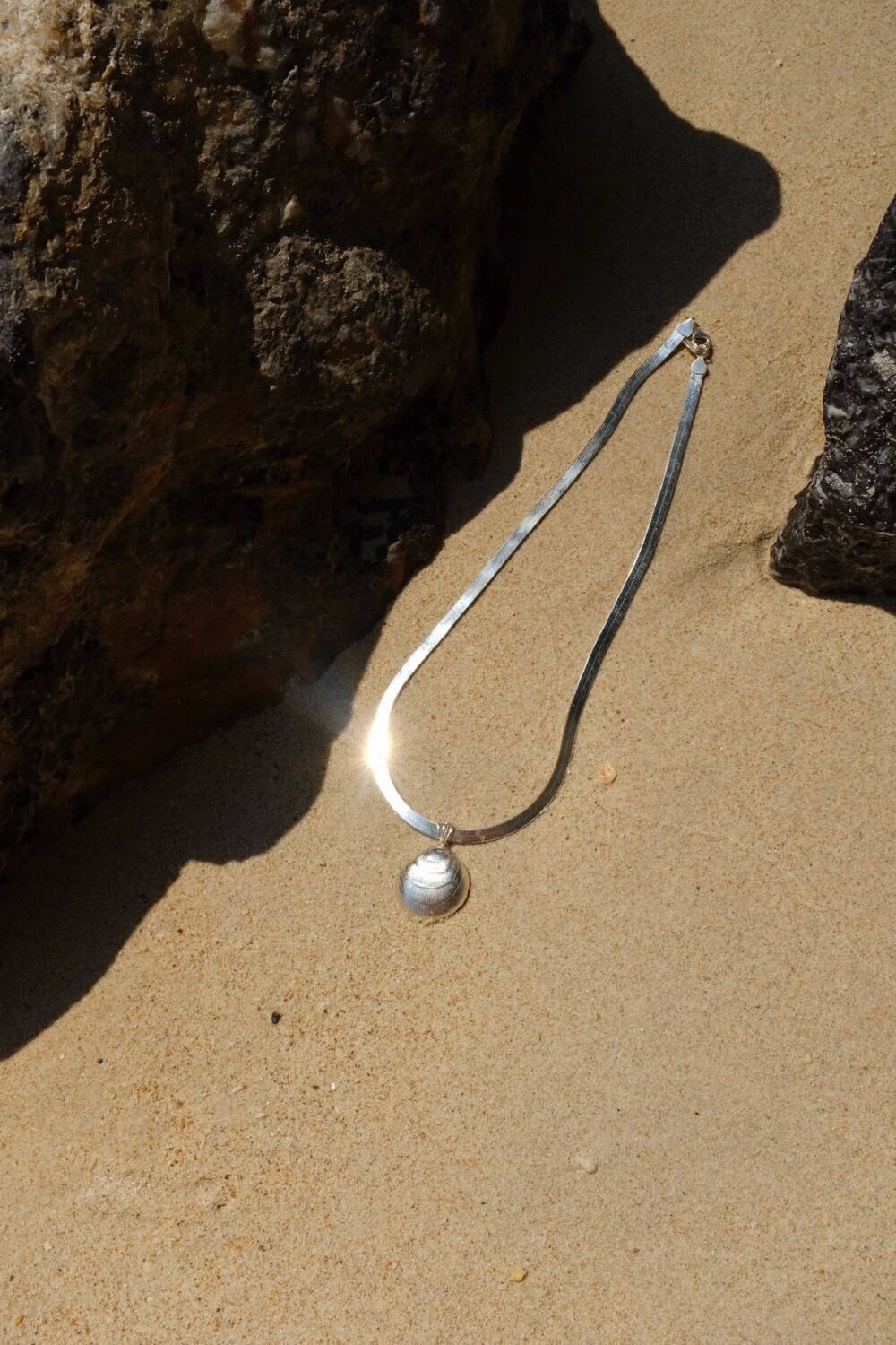 발리 바닷가에서 주운 조개껍데기 모양 그대로 깎아 제작된 제품입니다. 4mm 스네이크 줄이 네크라인에 우아하게 떨어지기 때문에 드레시한 착장이나 스윔웨어 어디든 잘 어우러질 수 있는 제품입니다.